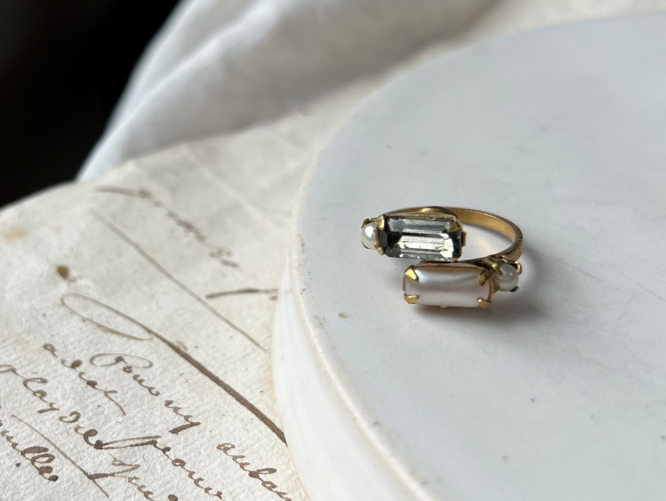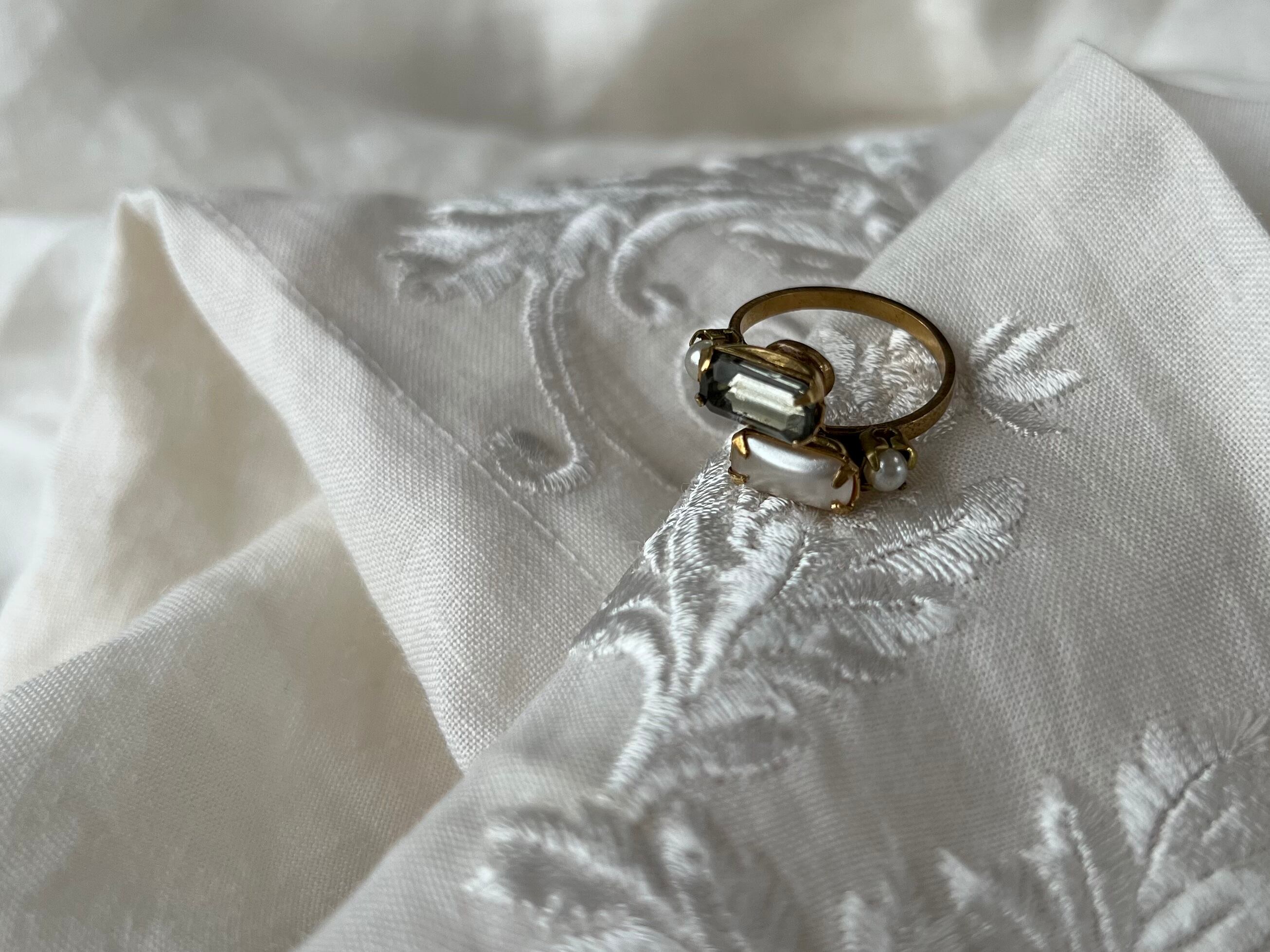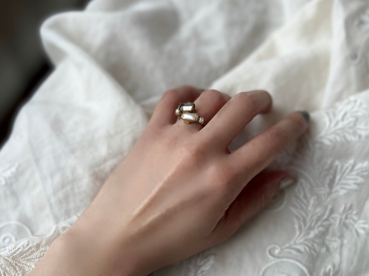 スモーキーカラーのガラスとミリアムハスケルのパールを置き、それぞれのサイドにはスワロフスキーパールを添えました。