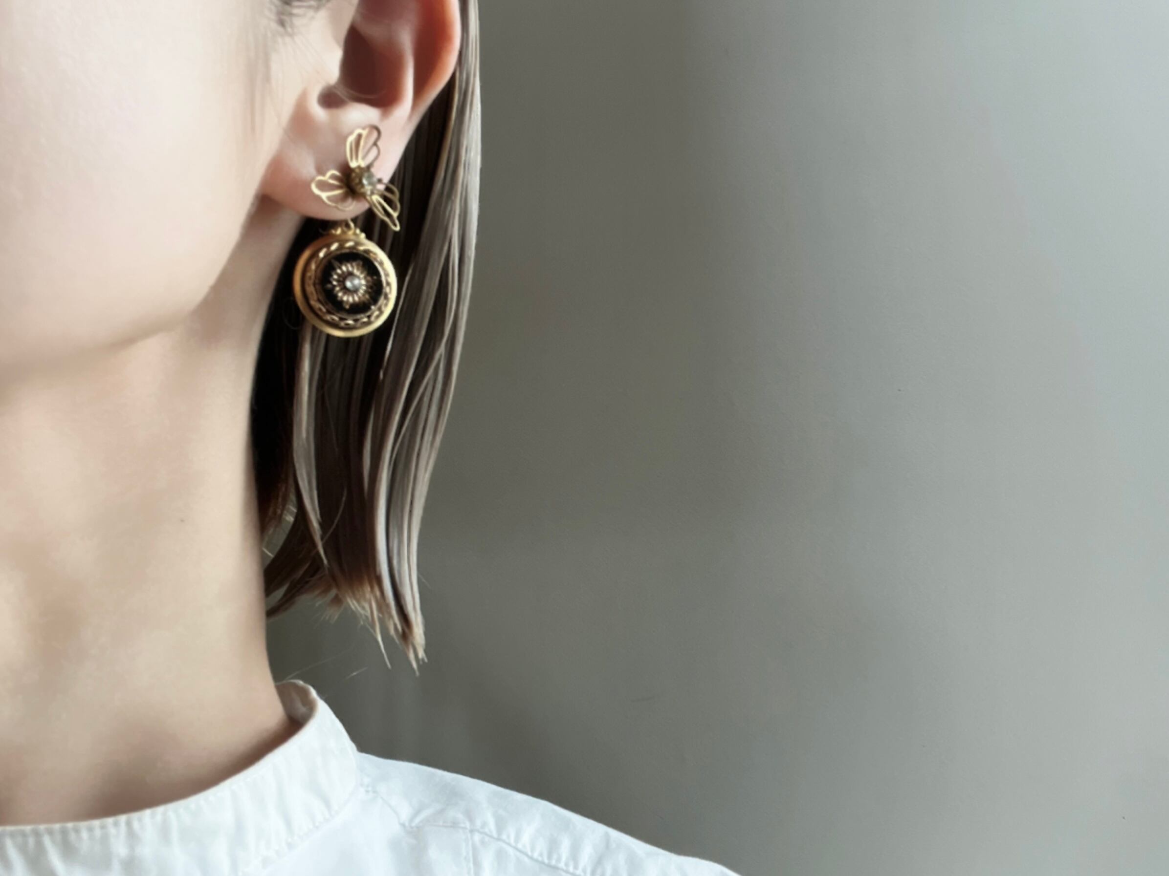 ヴィンテージパーツを使用してアシンメトリーなピアスを作りました。