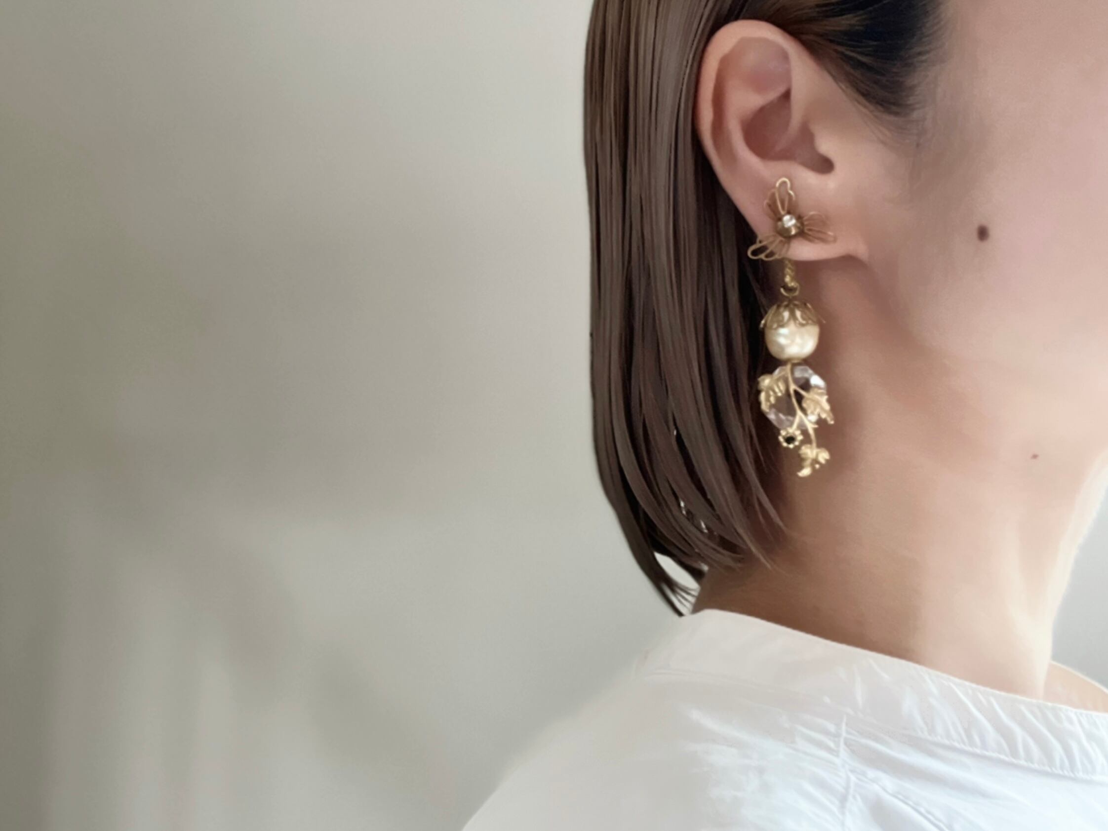 カットワークの美しいボタニカルパーツをカボションに、パールやガラスなど、優美な雰囲気溢れるエレメントを詰め込みました。