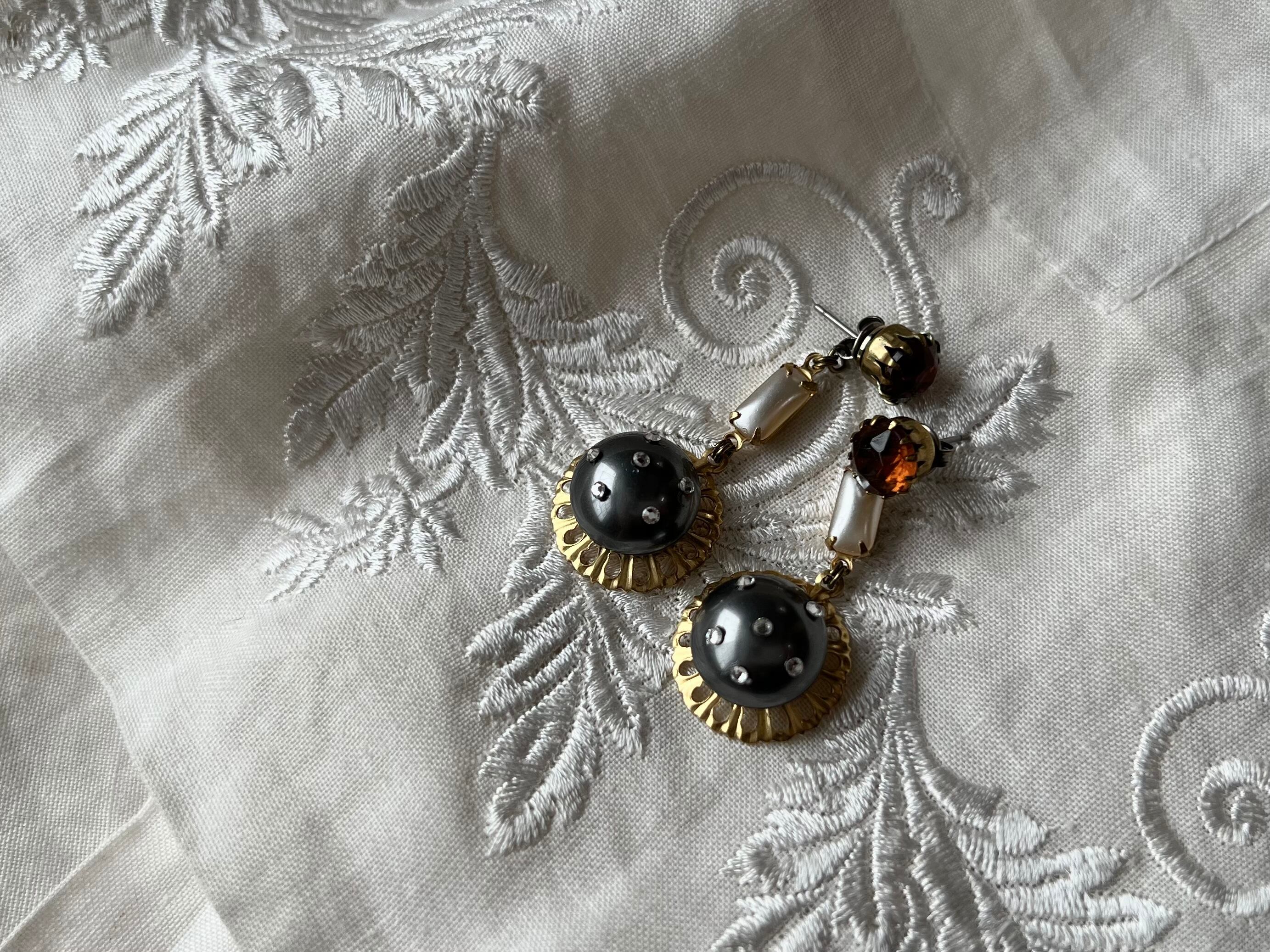 琥珀色のチェコガラスカボションがアンティーク感を高め、それを繋ぐミリアムハスケルのパールは上品に両者を引き立てています。
