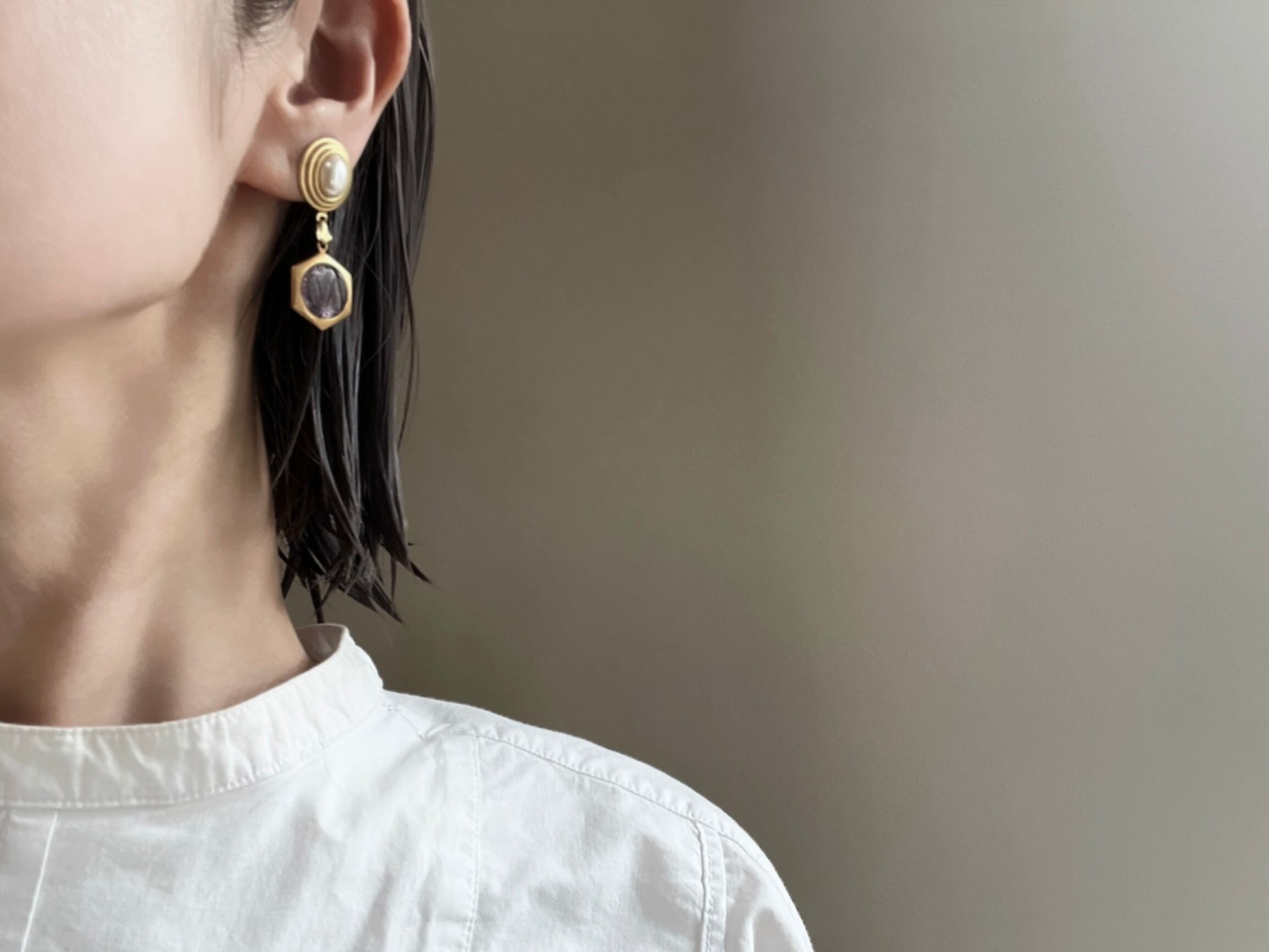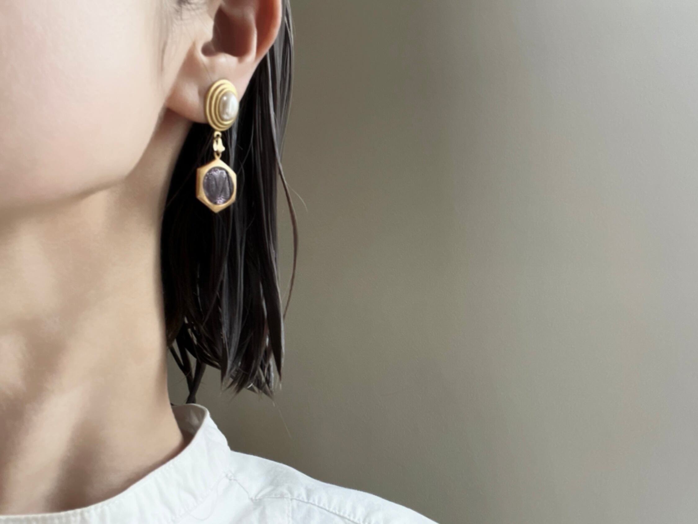 シンプルなフォルムですが、パールやガラスを収める金具や両者を繋ぐカンも含めて、全てのパーツひとつひとつにアンティークな雰囲気をお楽しみ頂けるデザインです。