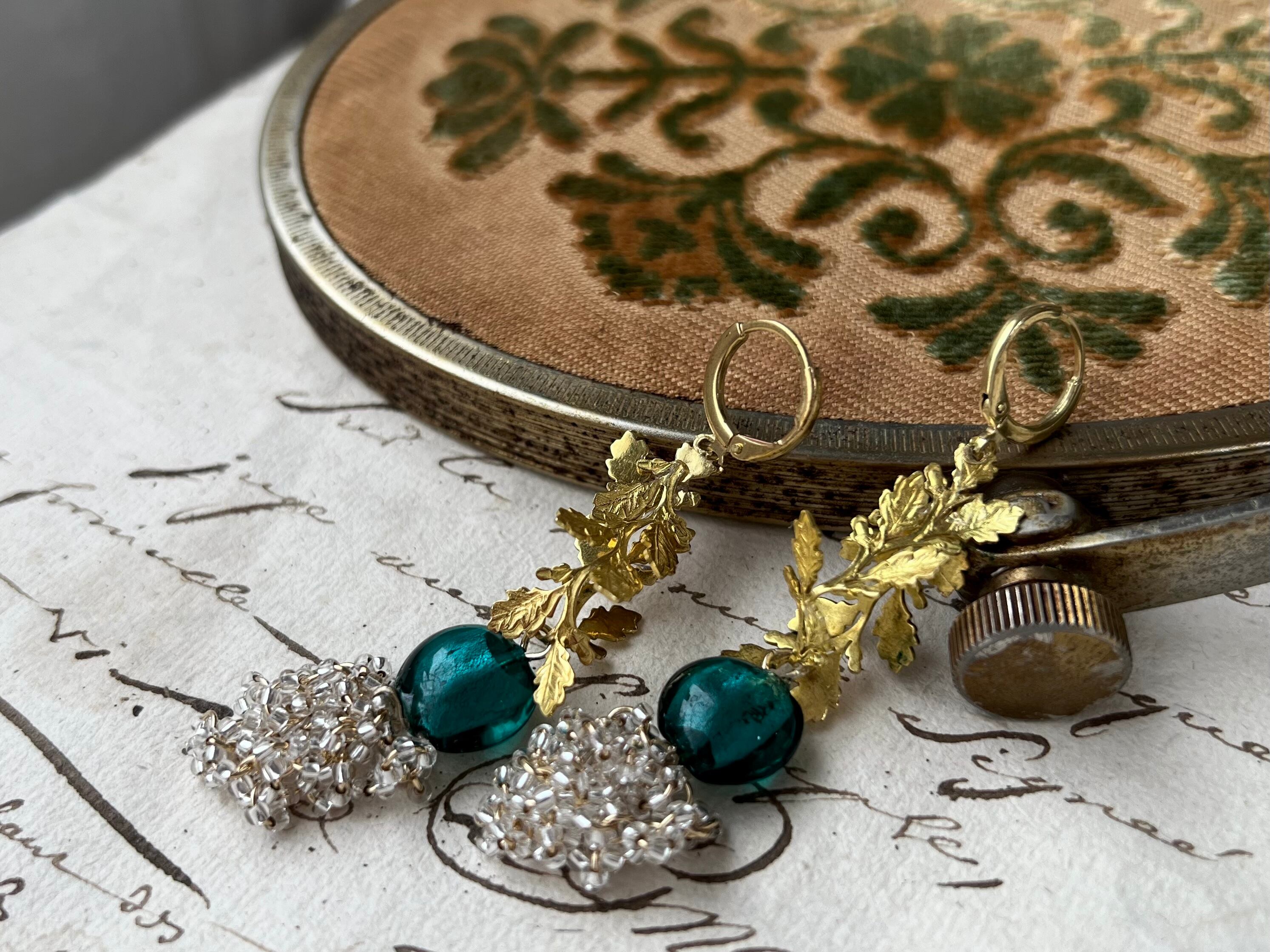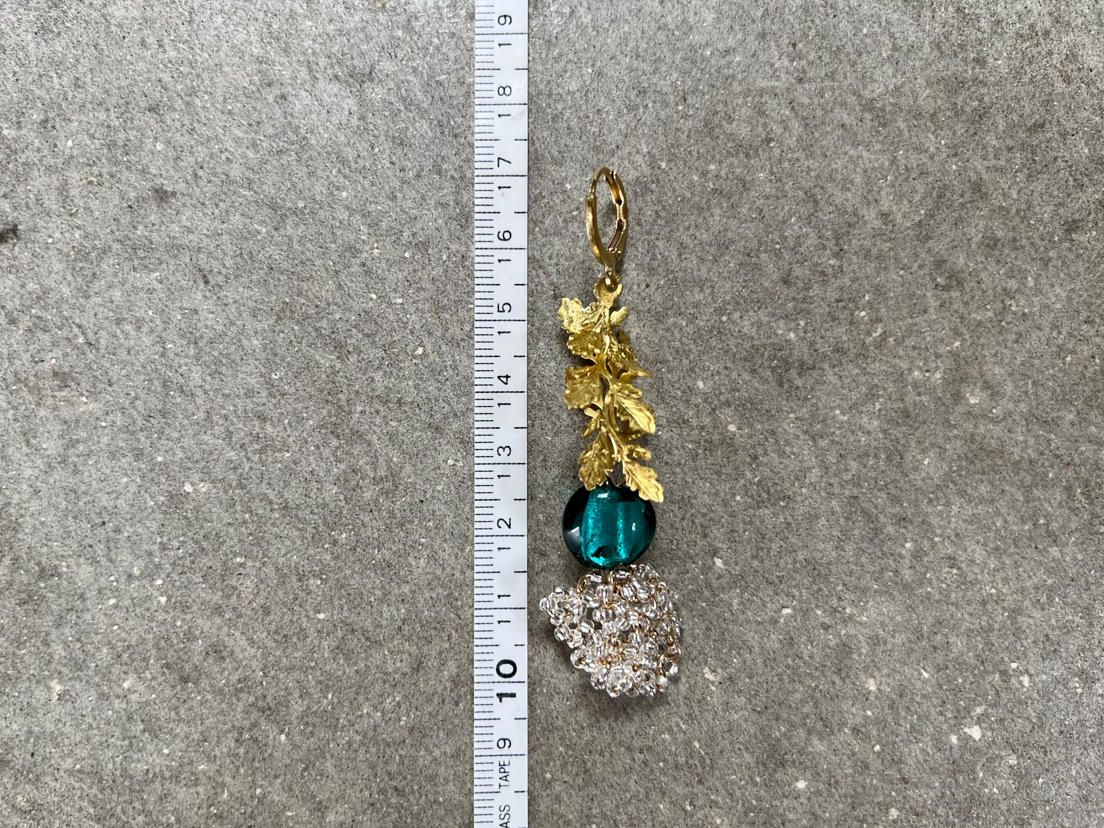 リーフの真鍮リボンに美しいグリーンのガラスと透明感溢れるクリアガラスビーズを添えました。