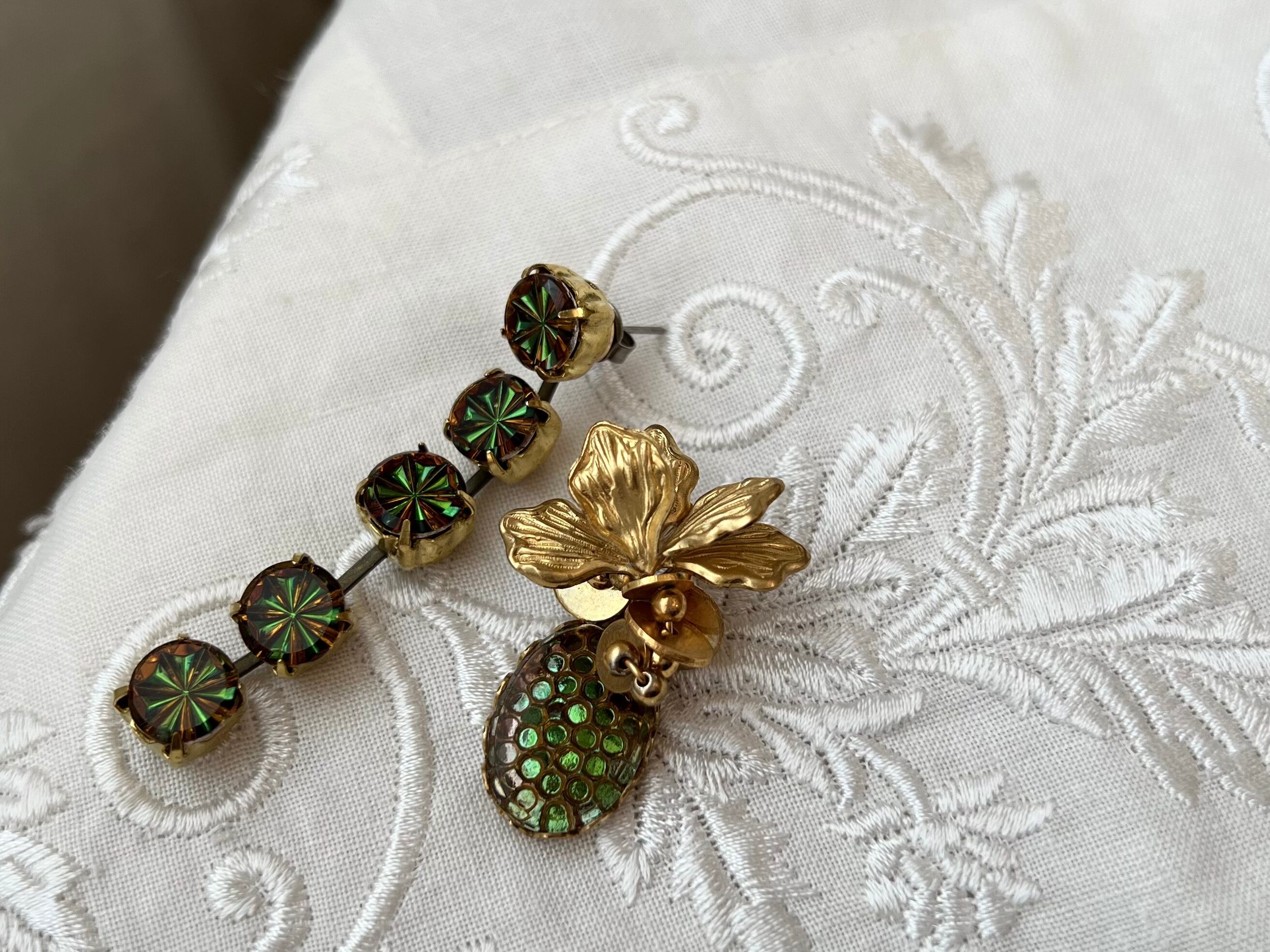 ヴィンテージパーツを使用してアシンメトリーなピアスを作りました。