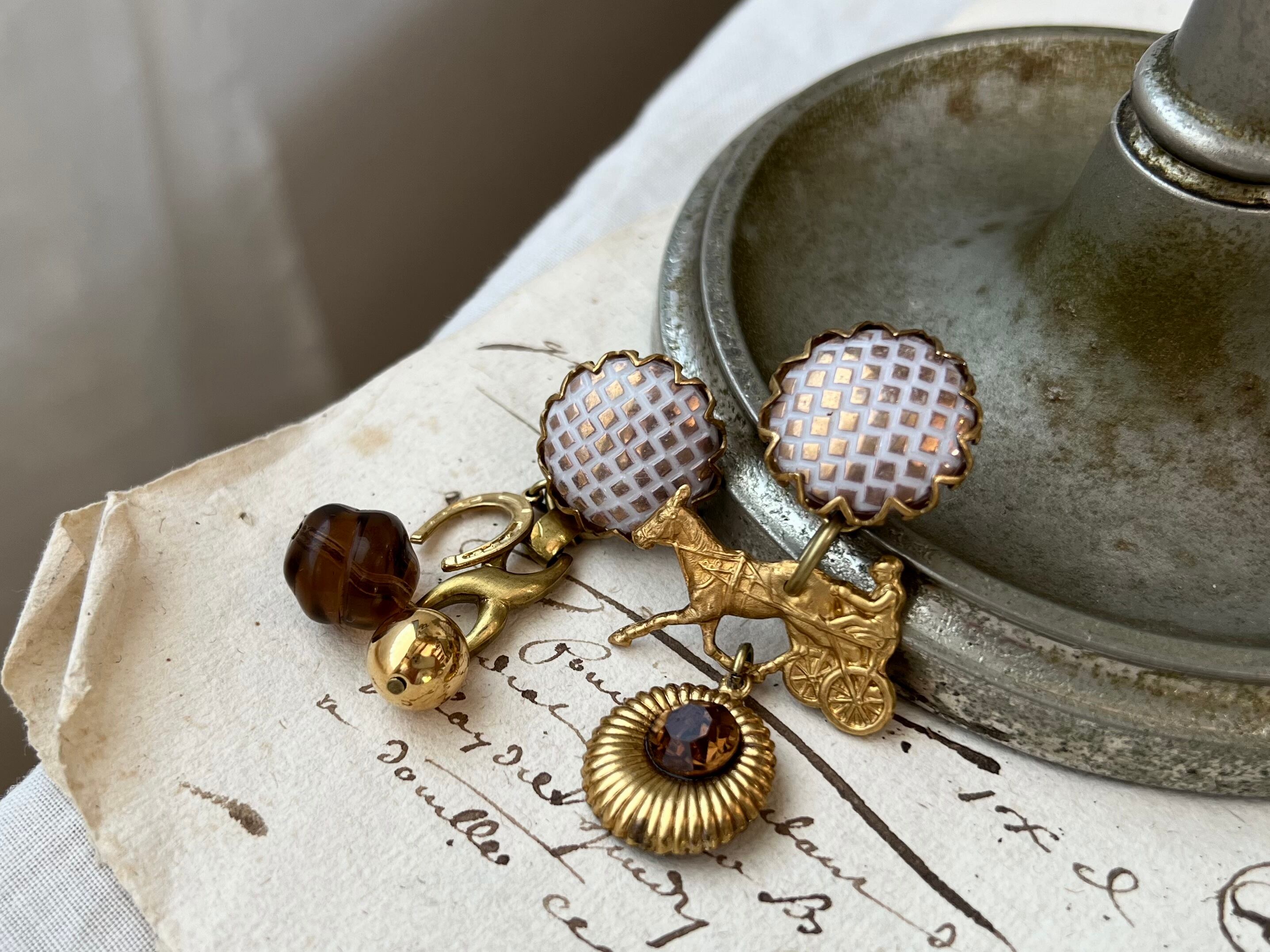 ヴィンテージパーツを使用してアシンメトリーなピアスを作りました。
