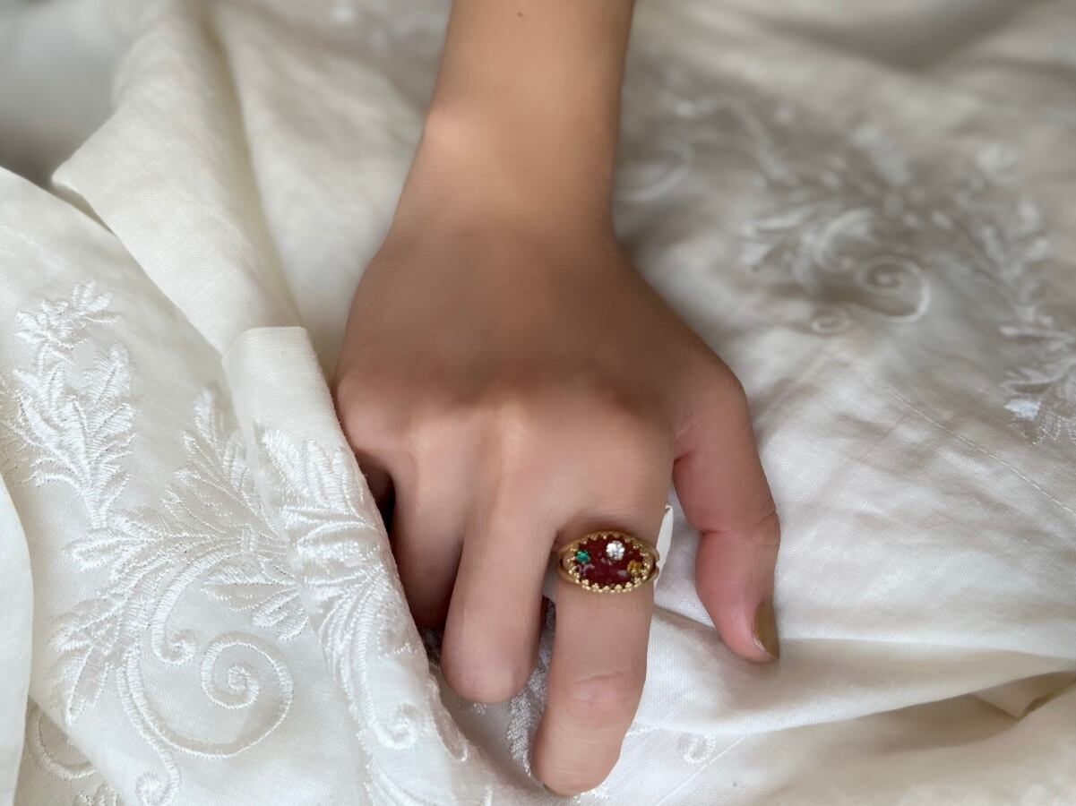 可愛らしさと大人の遊び心が同居するデザインがクラシカルなリング台に収められ、そこはかとなくノスタルジーを感じられる一品です。