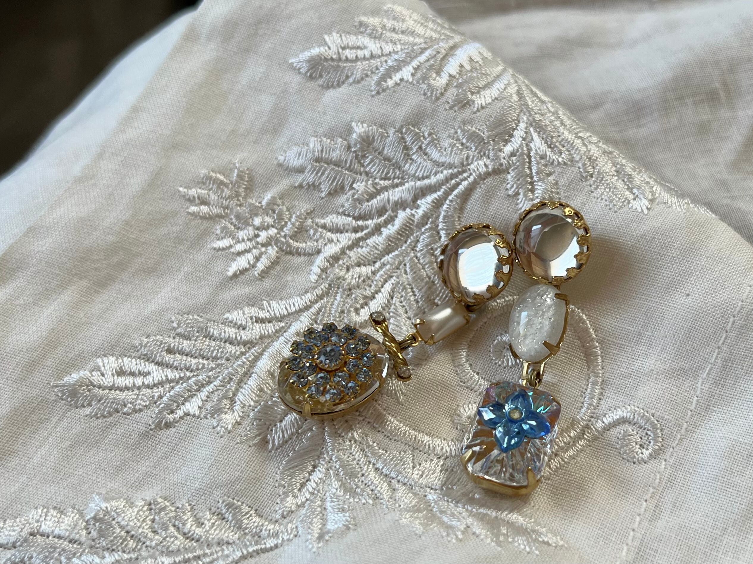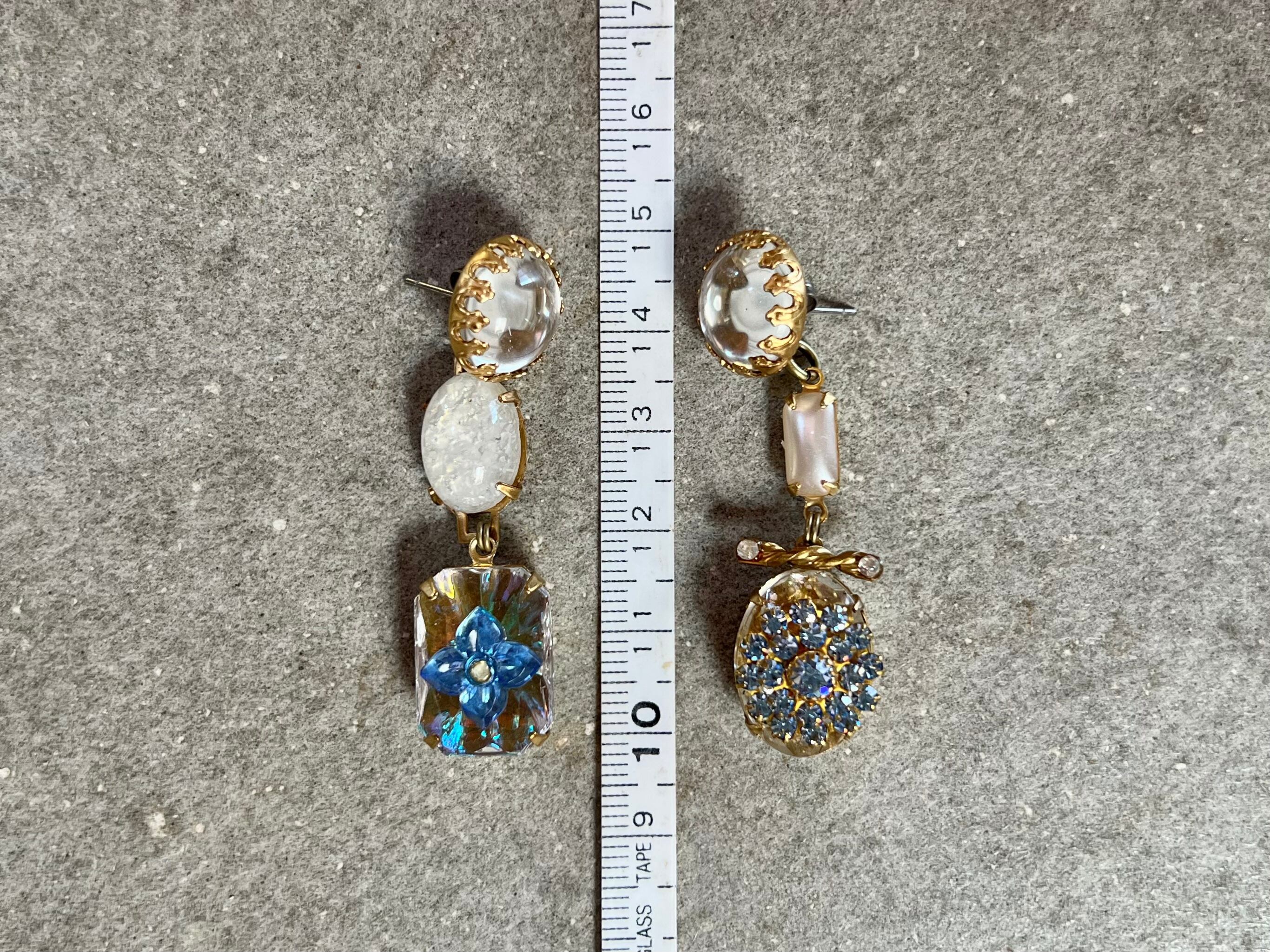 ヴィンテージパーツを使用してアシンメトリーなピアスを作りました。