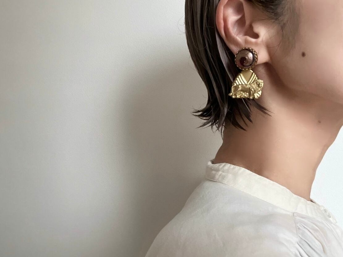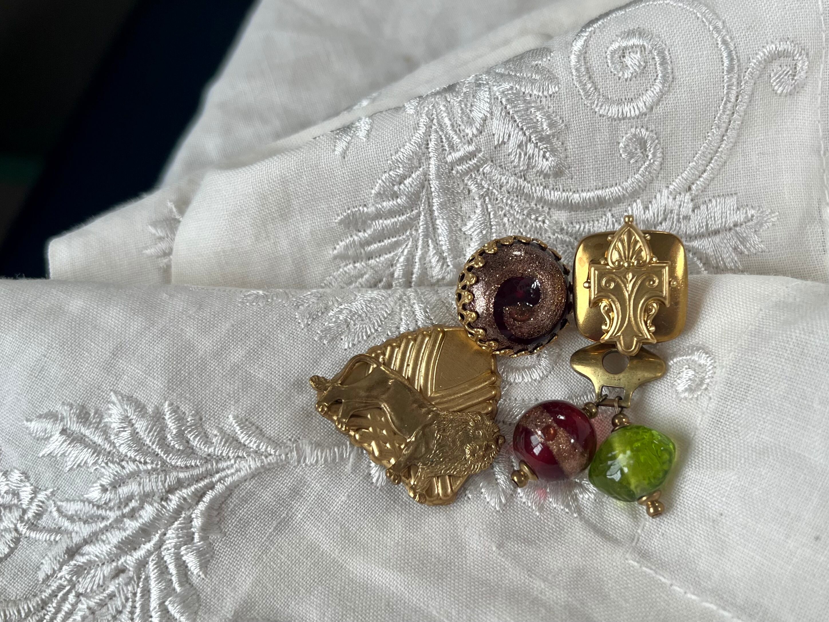 ヴィンテージパーツを使用してアシンメトリーなピアスを作りました。