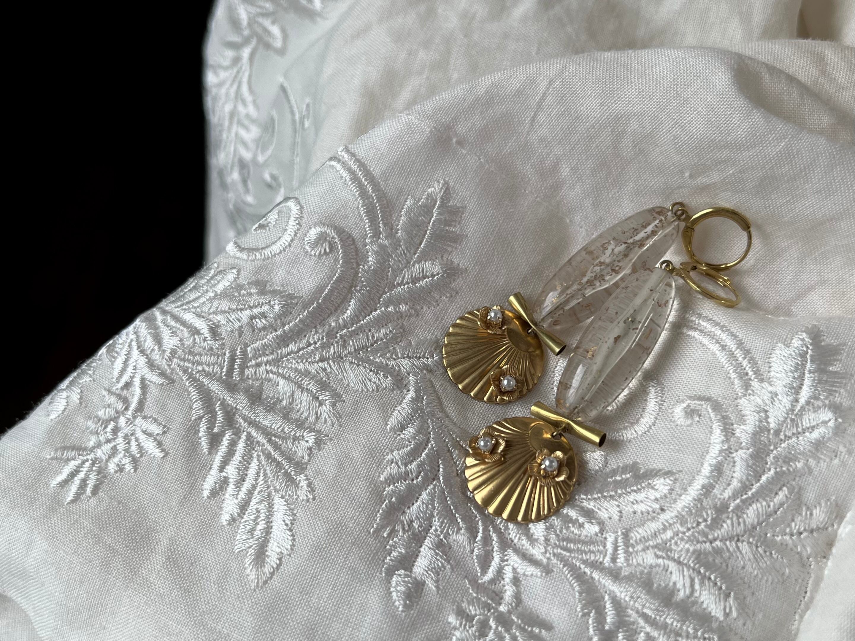 シェルのような真鍮パーツにはお花を添えて、シンプルながら可憐な雰囲気にまとめました。