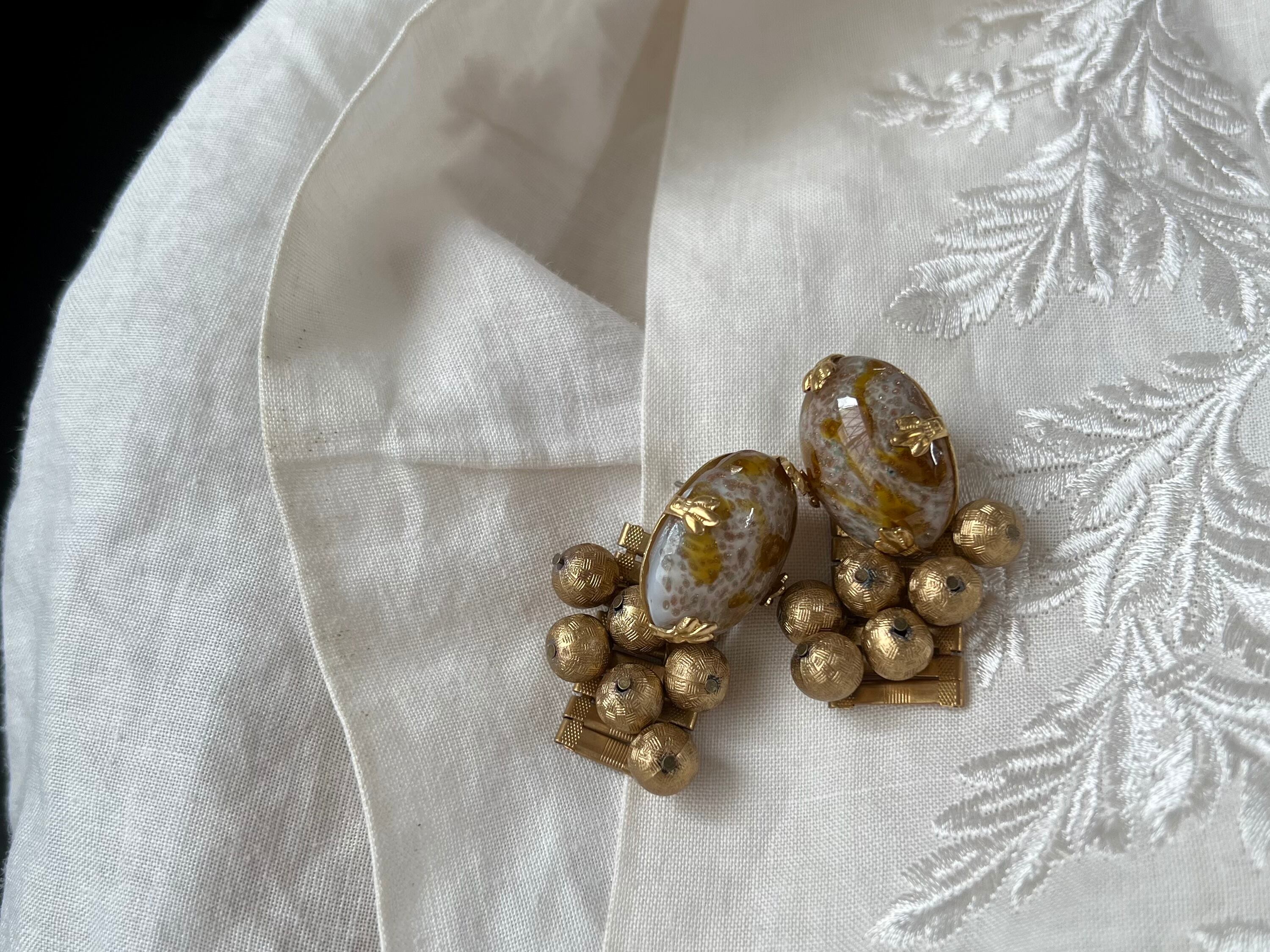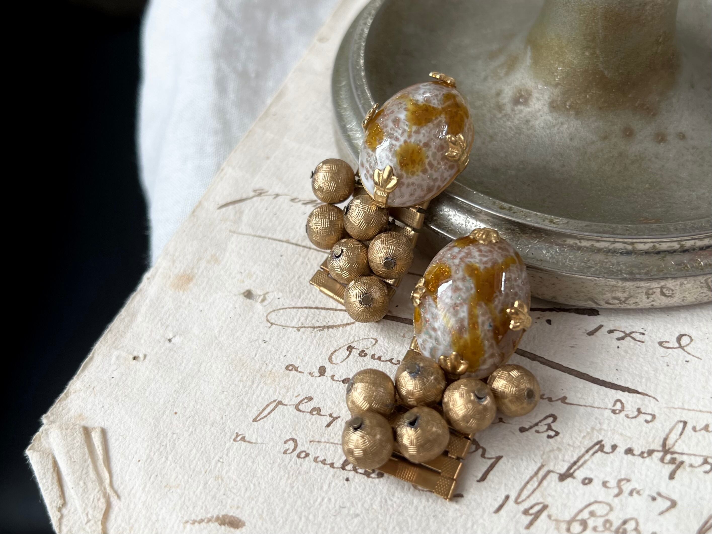 模様が特徴的な美しいガラスカボションに、カットの施された味わい深い真鍮ビーズと力強さを感じるチェーンベルトを合わせ、豊かな雰囲気に仕上げました。