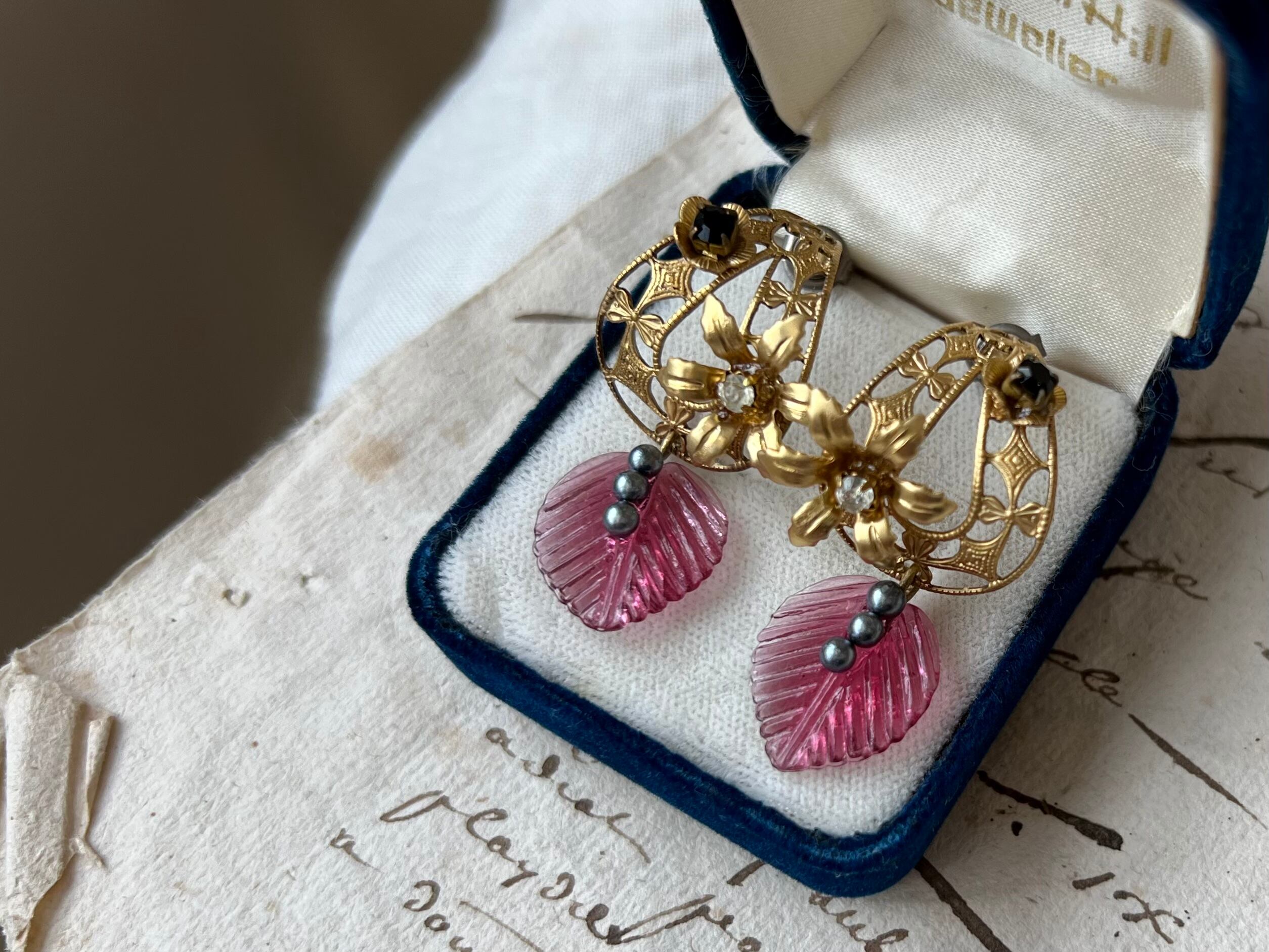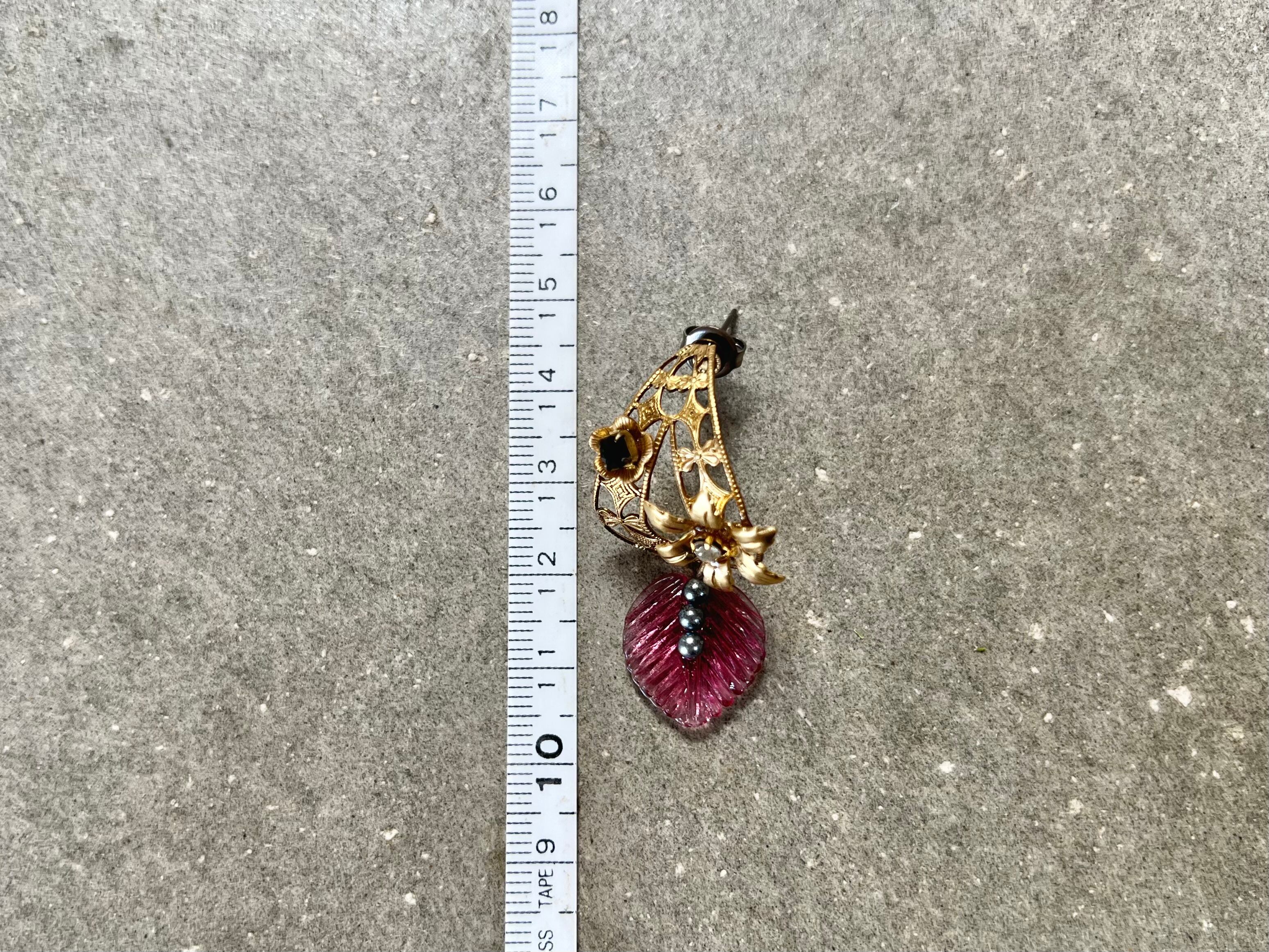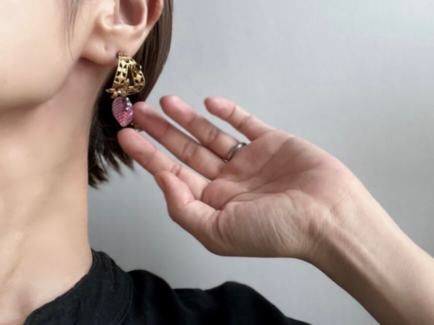 美しい透かしの入った真鍮にボタニカルパーツをリズミカルに散らしました。
