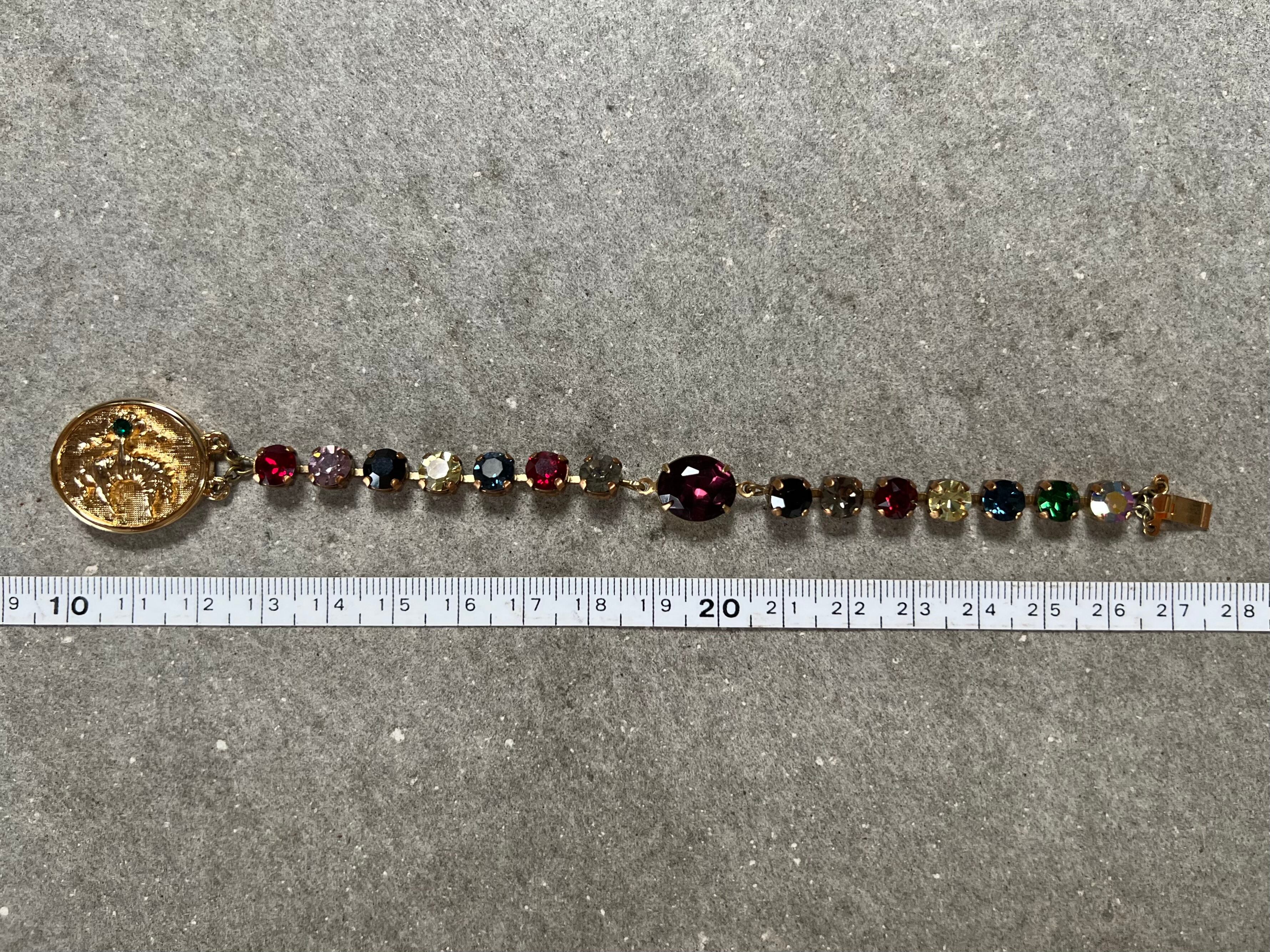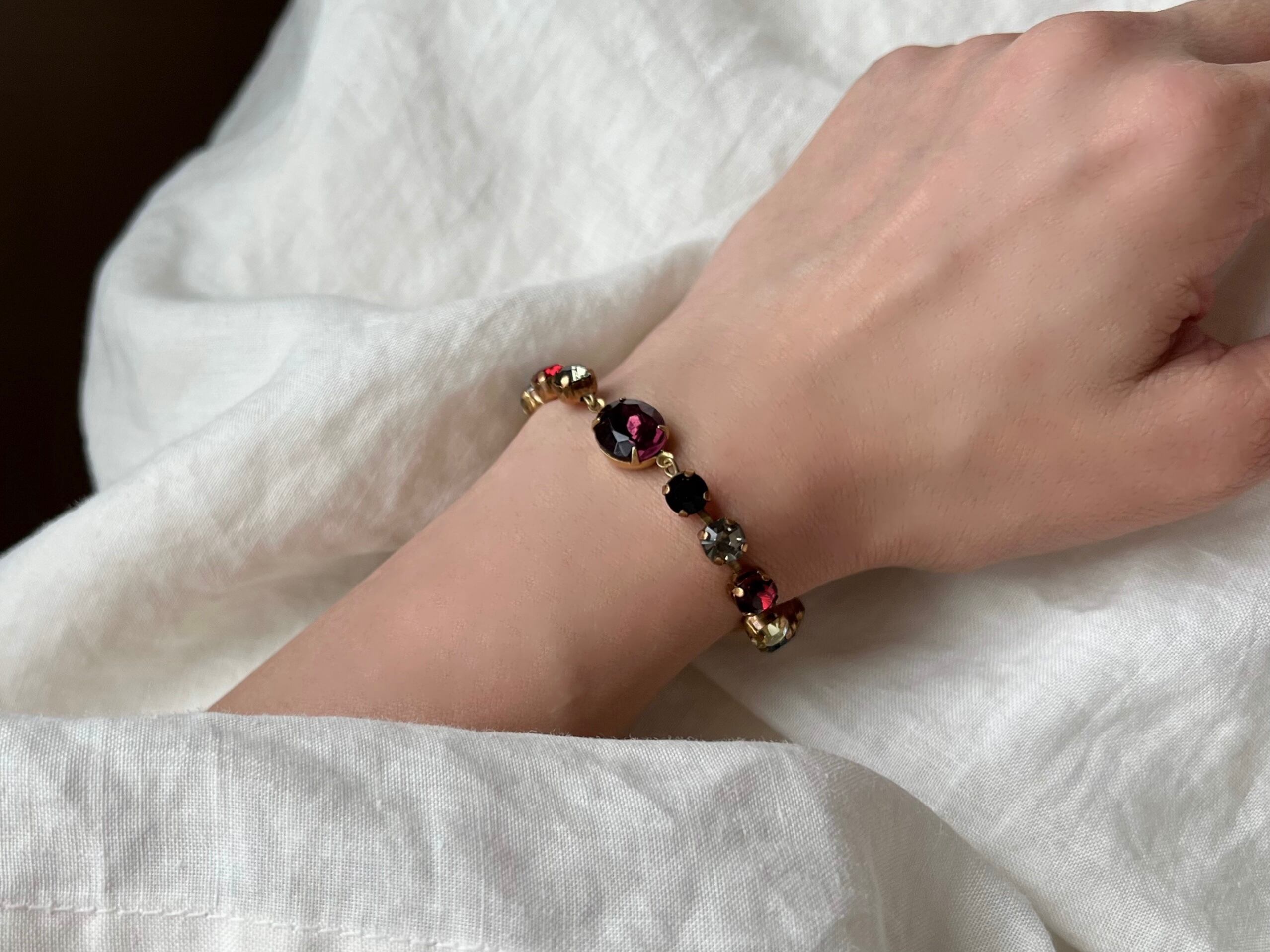 色とりどりのヴィンテージスワロフスキーとひとまわり大きい深い紫のヴィンテージガラスを用いた華やかなデザインで、留め具にも存在感があります。