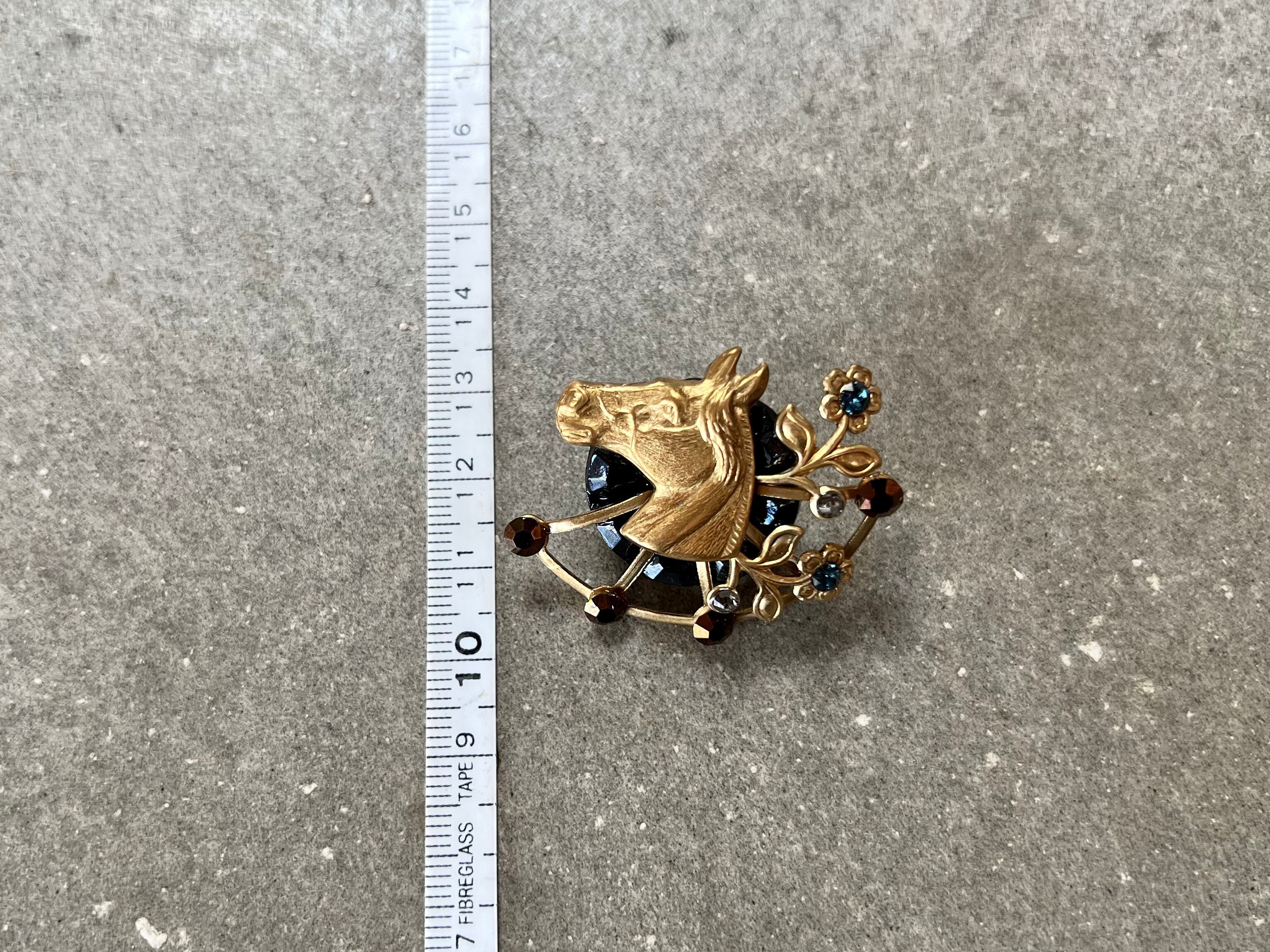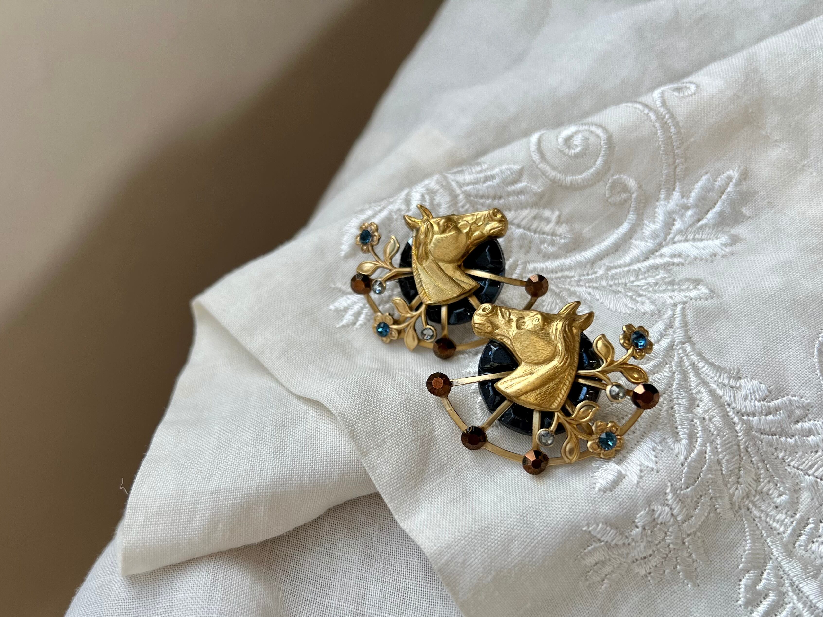 味わい深いメタルブラックのガラスにホースヘッドなどのブラスパーツを重ね、そこにスワロフスキーを散らして華やかに仕上げました。