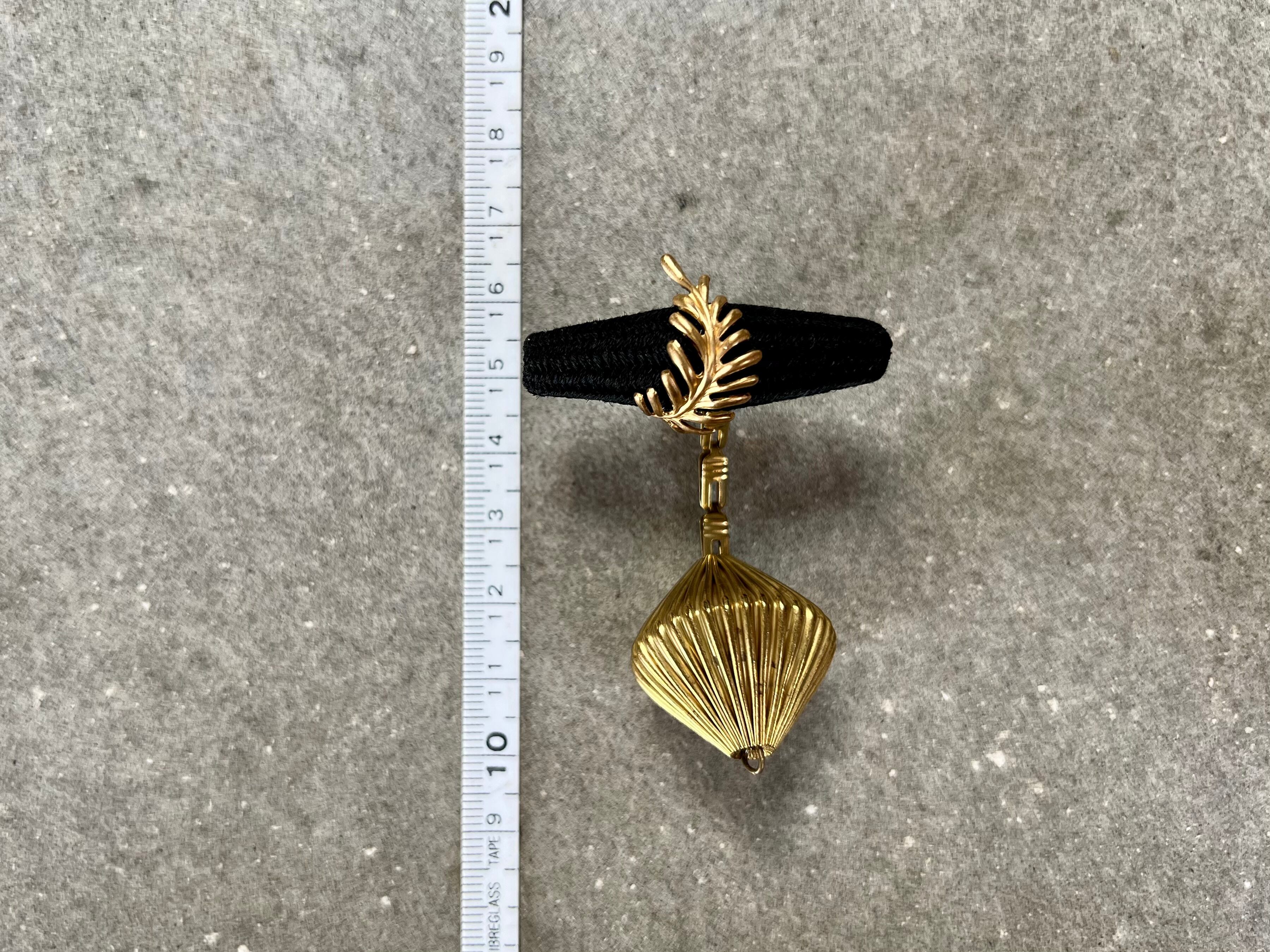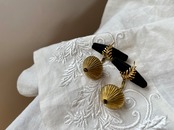 個性的な糸巻きビーズにボタニカルパーツを添え、ボリュームのあるナツメブラスビーズを合わせました。