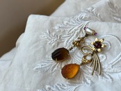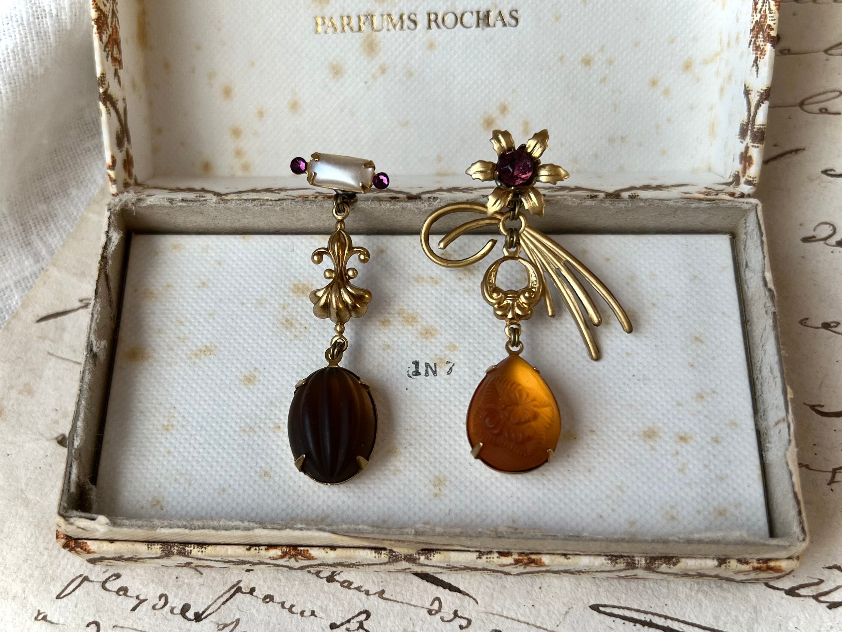 ヴィンテージパーツを使用してアシンメトリーなピアスを作りました。
