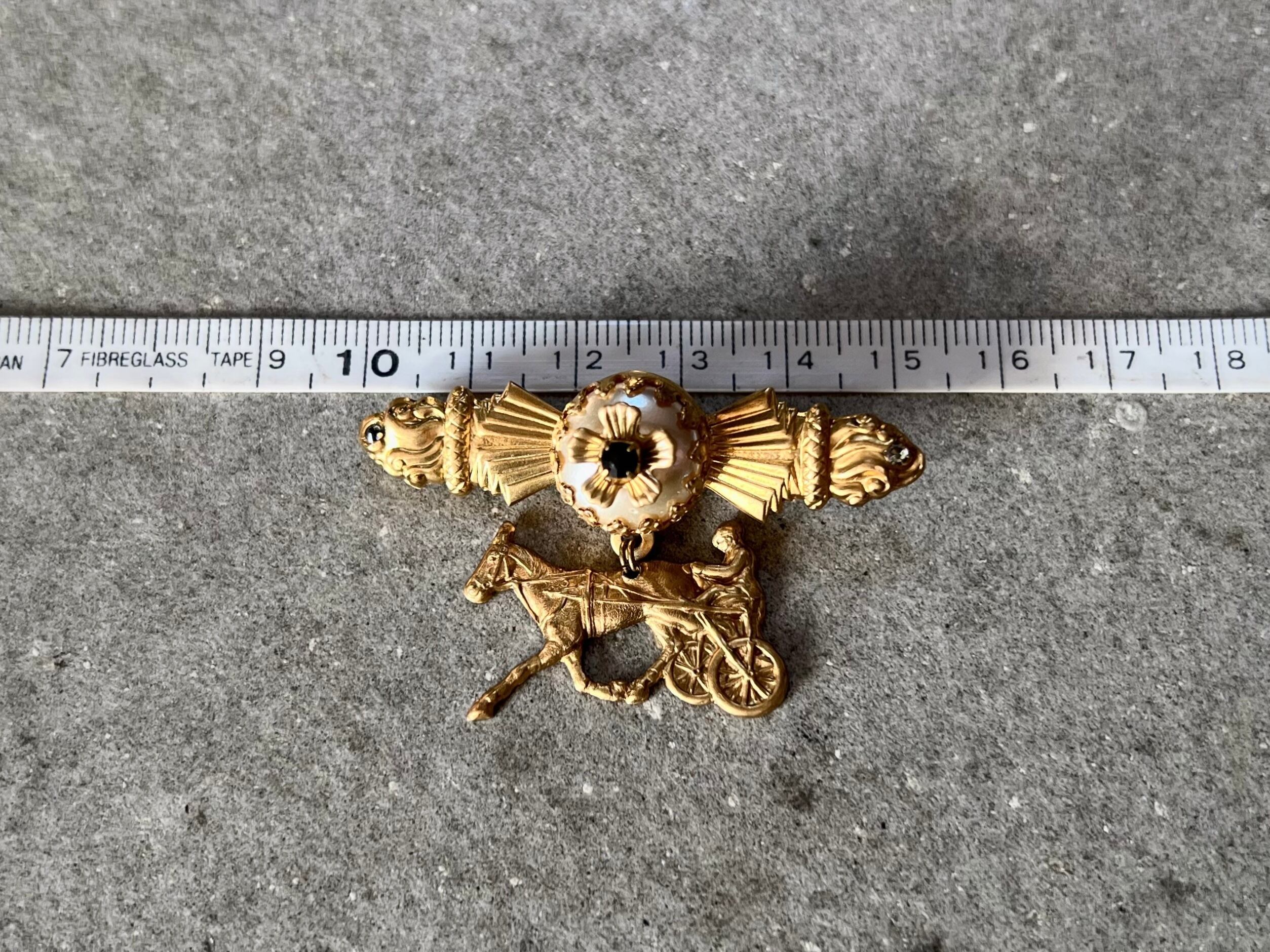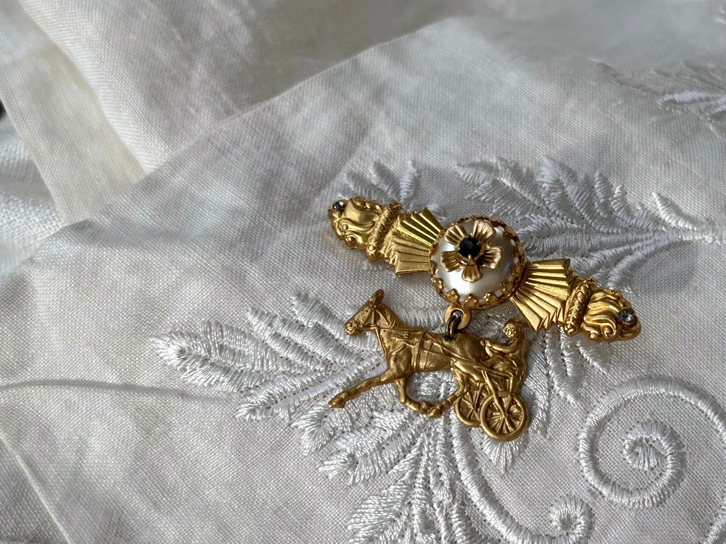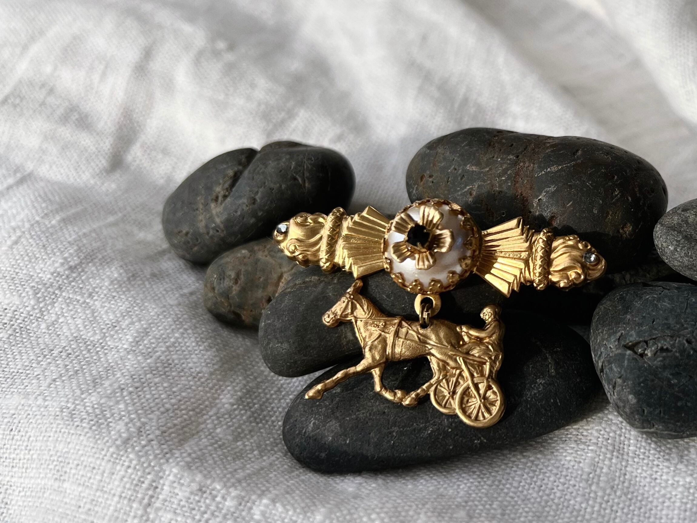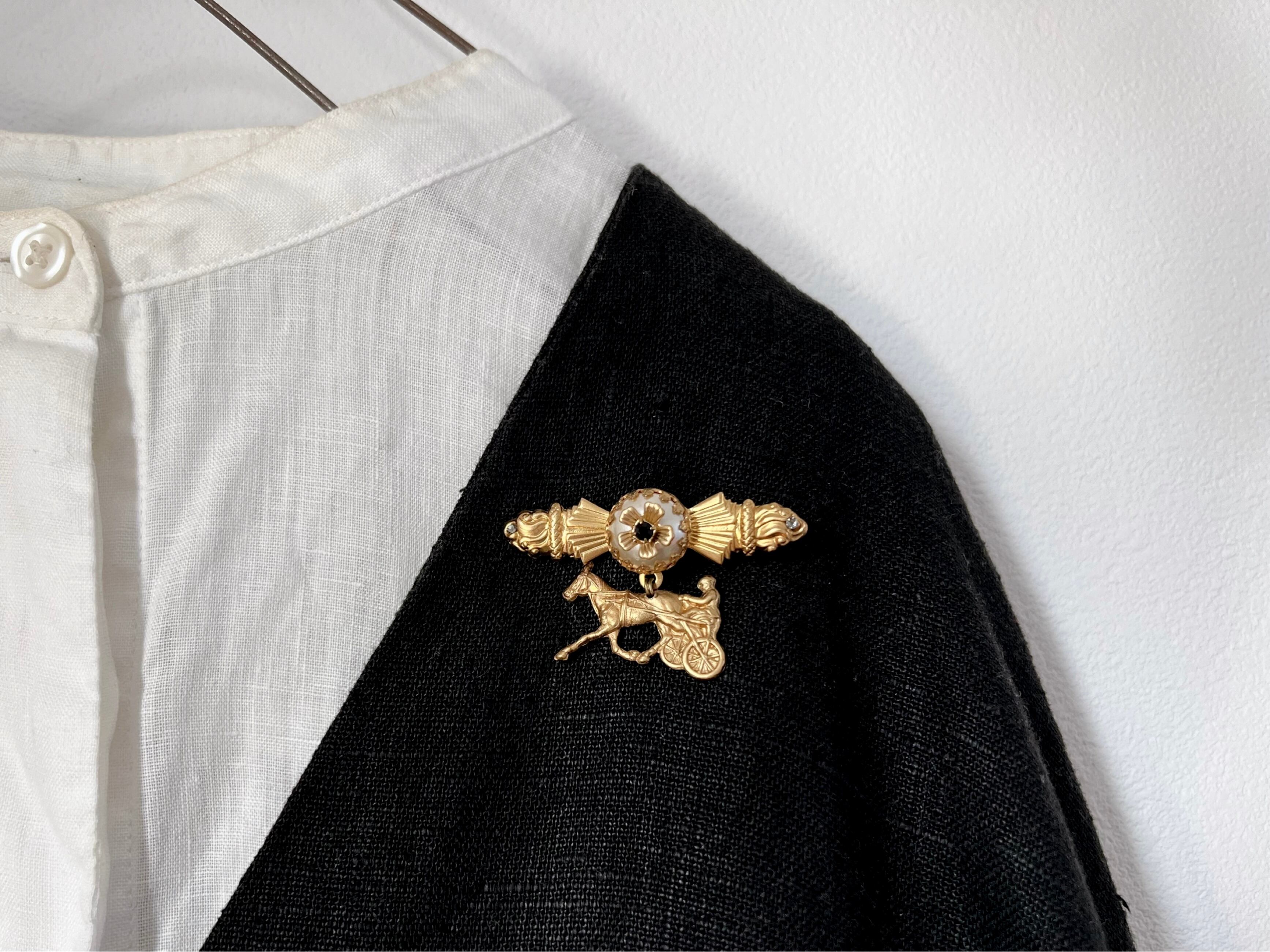 ガラスパールにお花を添え、更にアクセントスワロフスキーを散らした華やかなブローチバーに、馬車モチーフのチャームを合わせてクラシカルに仕上げました。