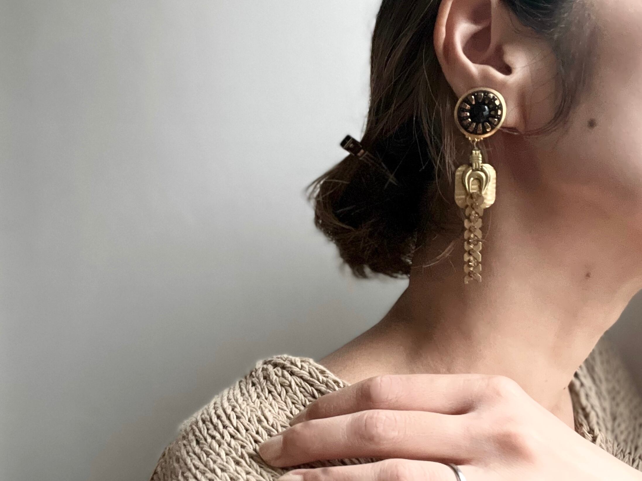 エッジの効いた個性的なパーツにクラシカルなスワロフスキーのチェーンやガラスカボションを組み合わせて、シックで大人っぽい雰囲気にまとめました。