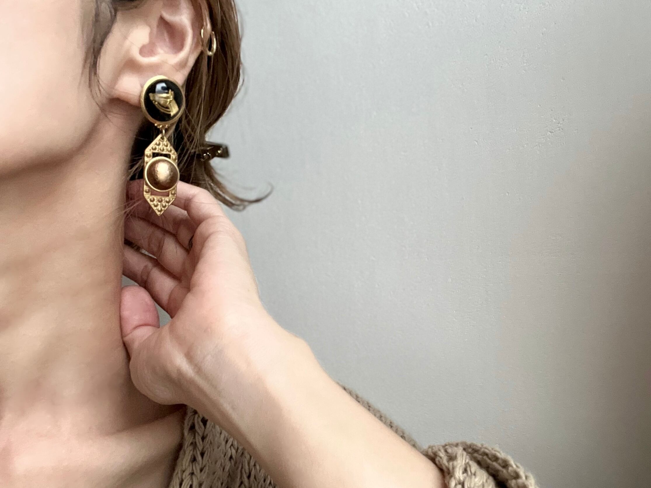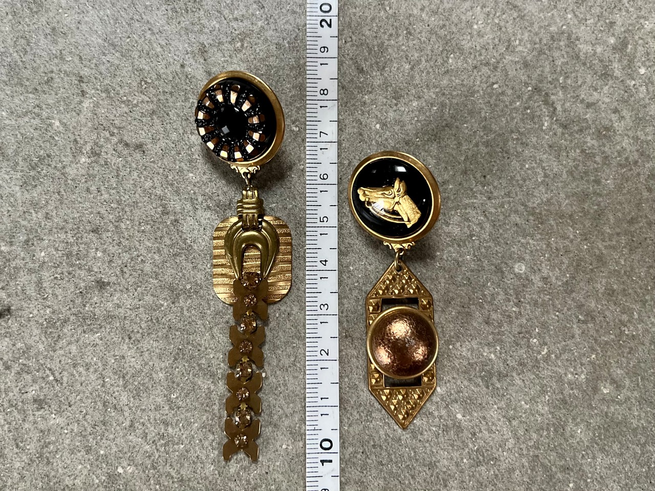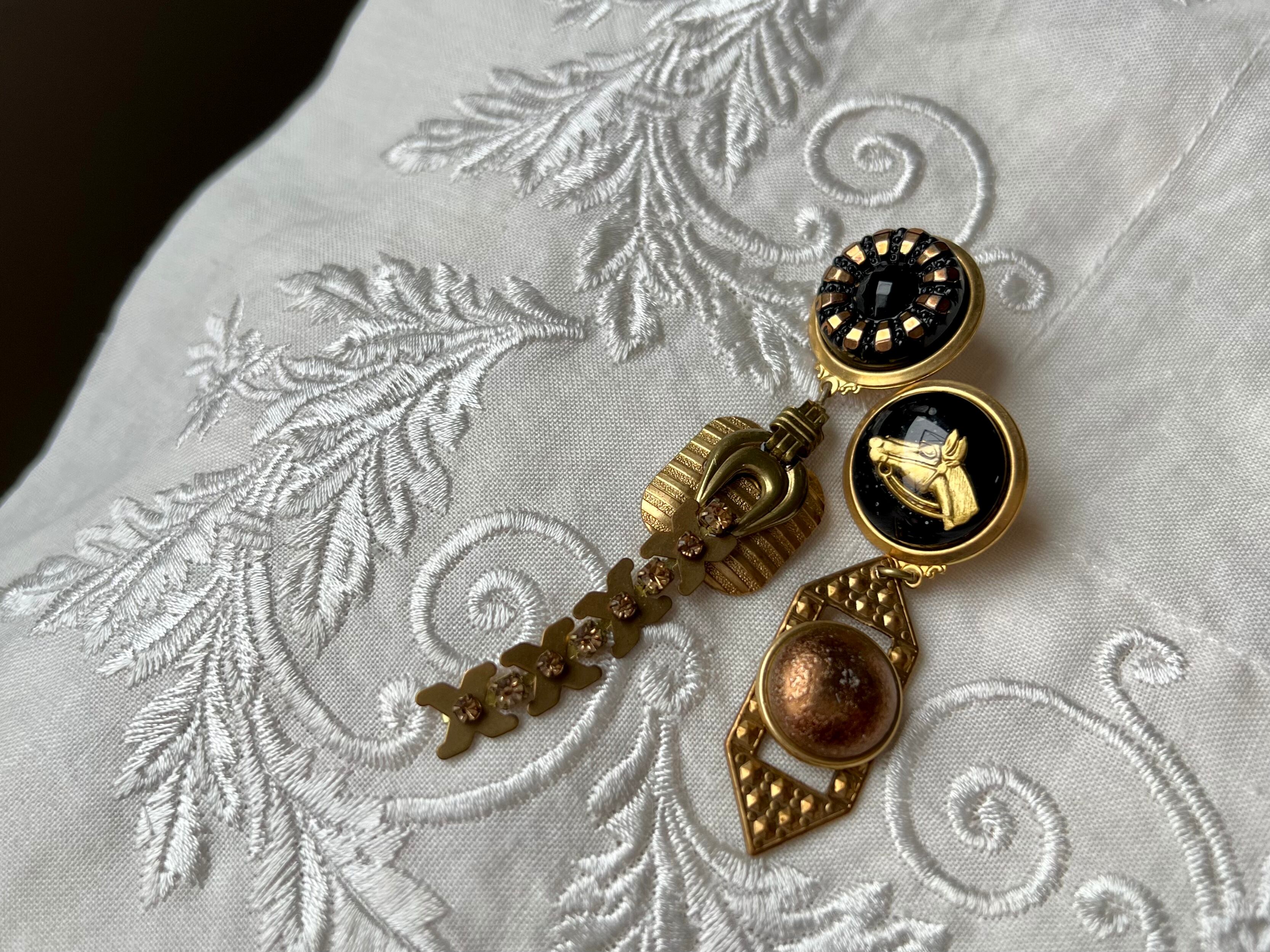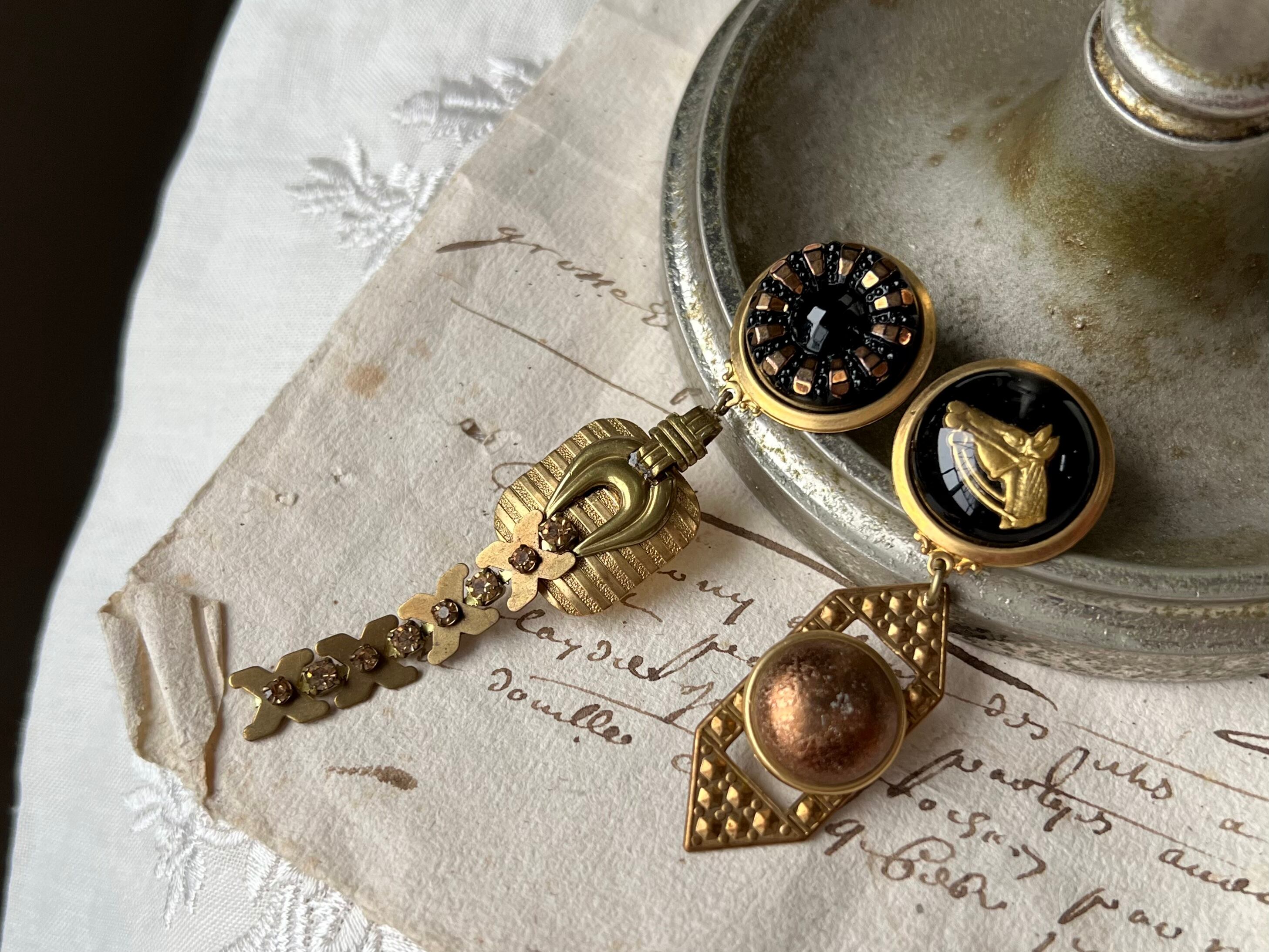 ヴィンテージパーツを使用してアシンメトリーなピアスを作りました。