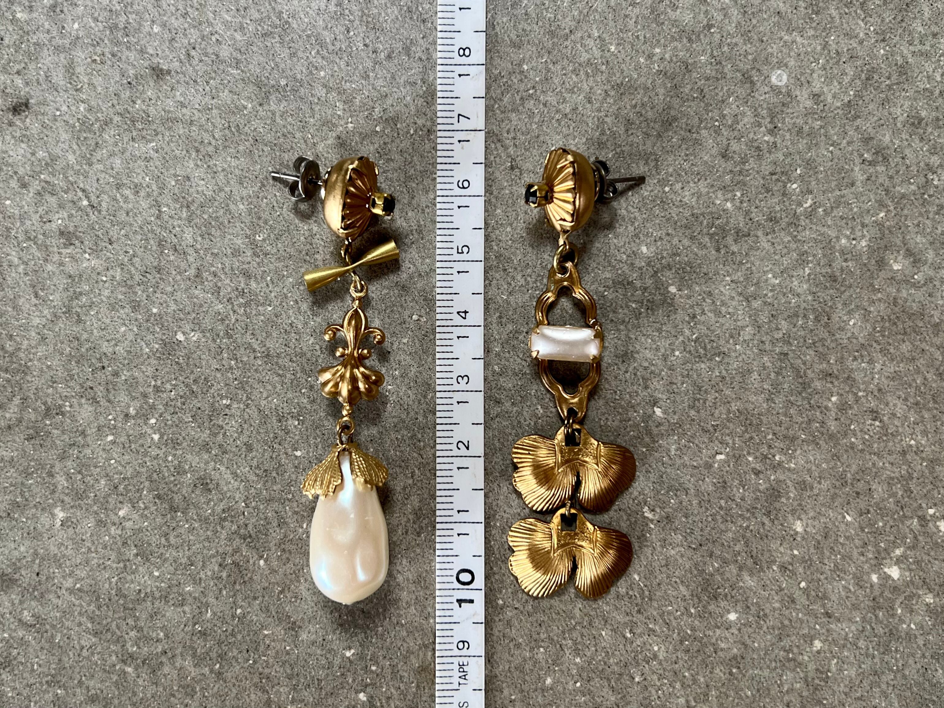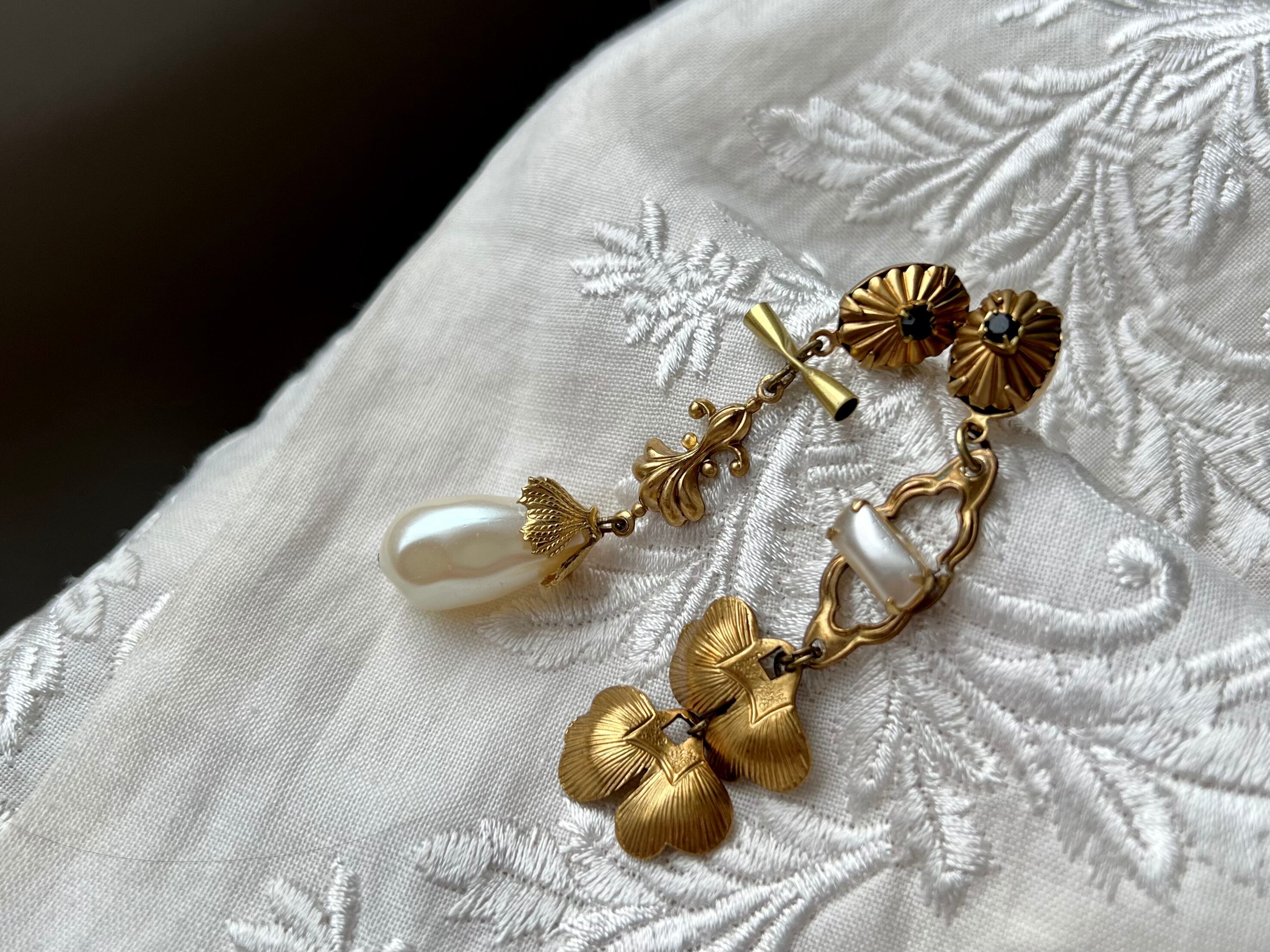 ヴィンテージパーツを使用してアシンメトリーなピアスを作りました。