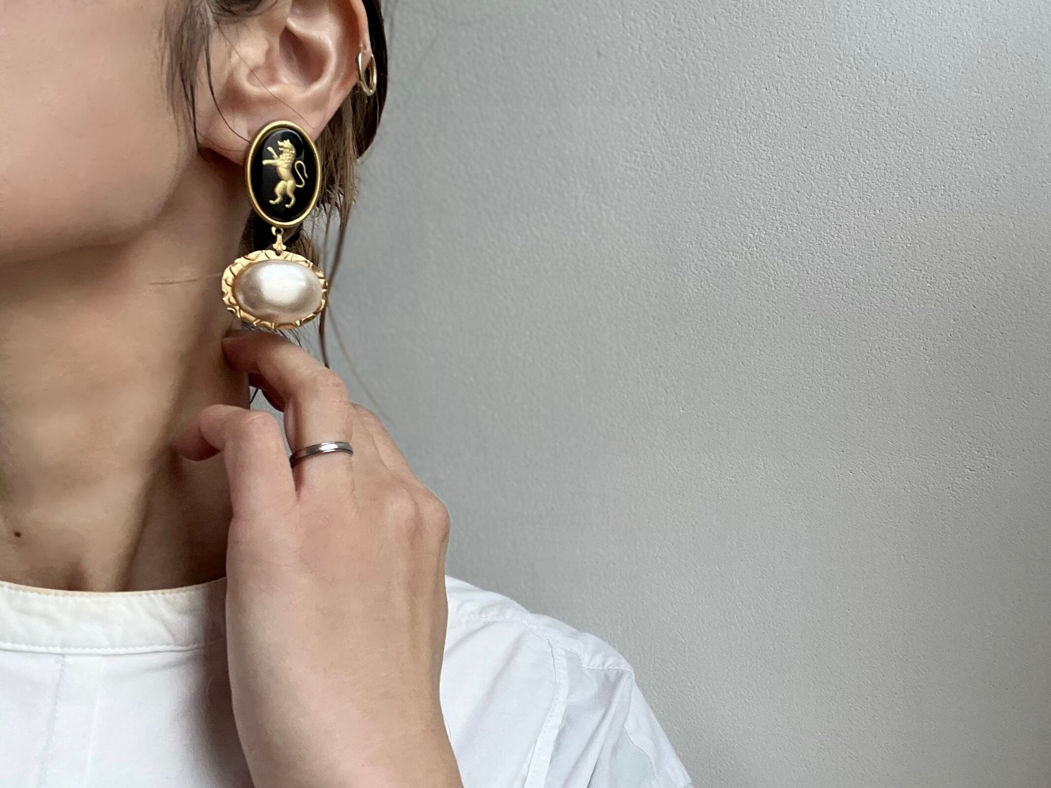 力強いライオンのインタリオやブラックのガラスドーム、スワロフスキーがシックな雰囲気ですが、そこにパールを合わせて少しマイルドに仕上げました。