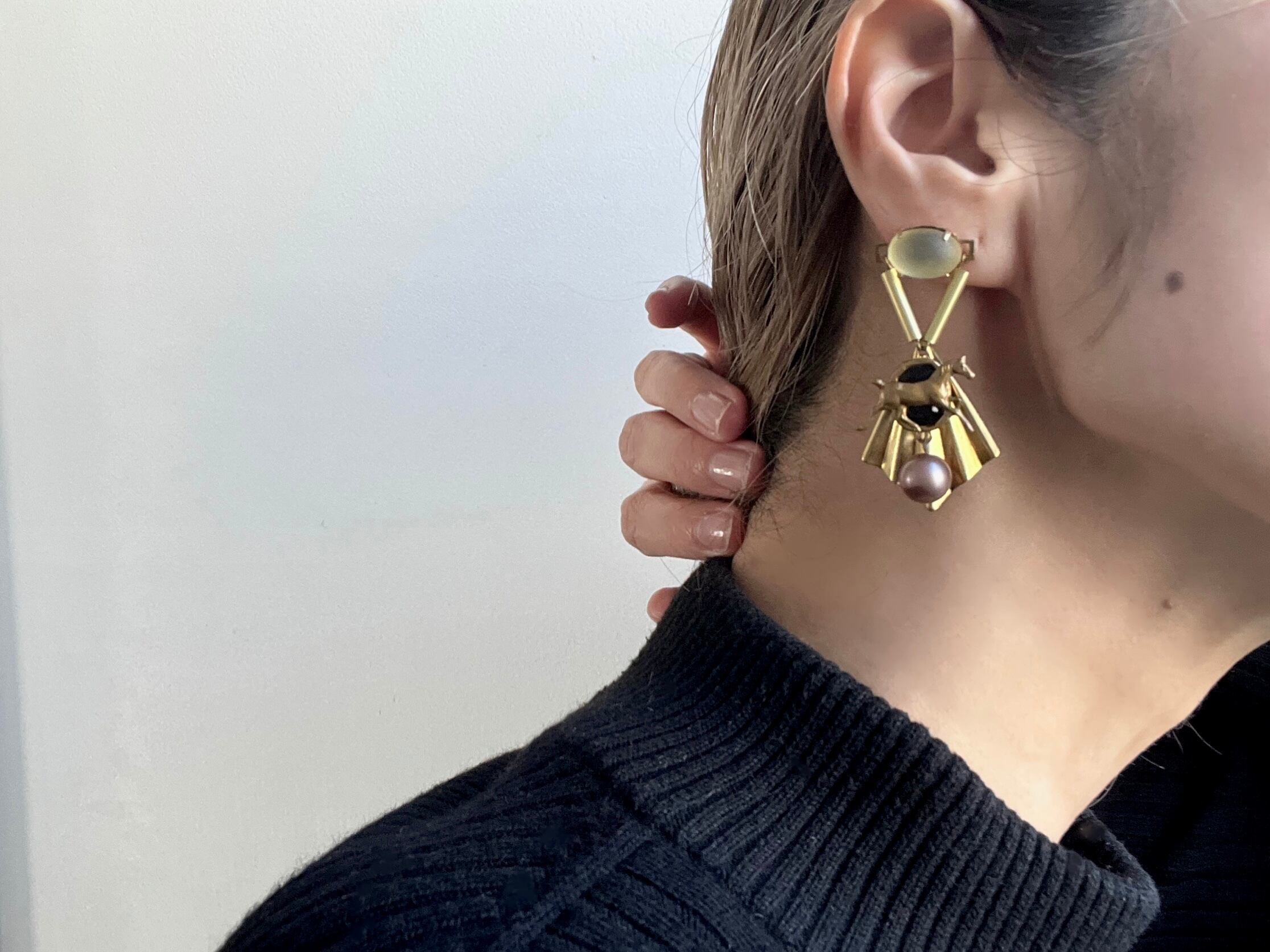 ヴィンテージパーツを使用してアシンメトリーなピアスを作りました。