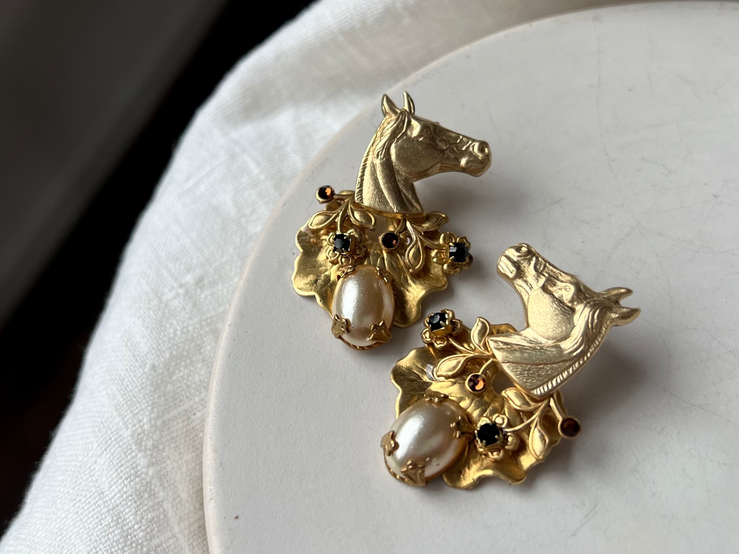 個性的なホースチャームにボタニカルパーツやガラスパール、スワロフスキーをギュッと詰めてロマンチックに仕上げました。