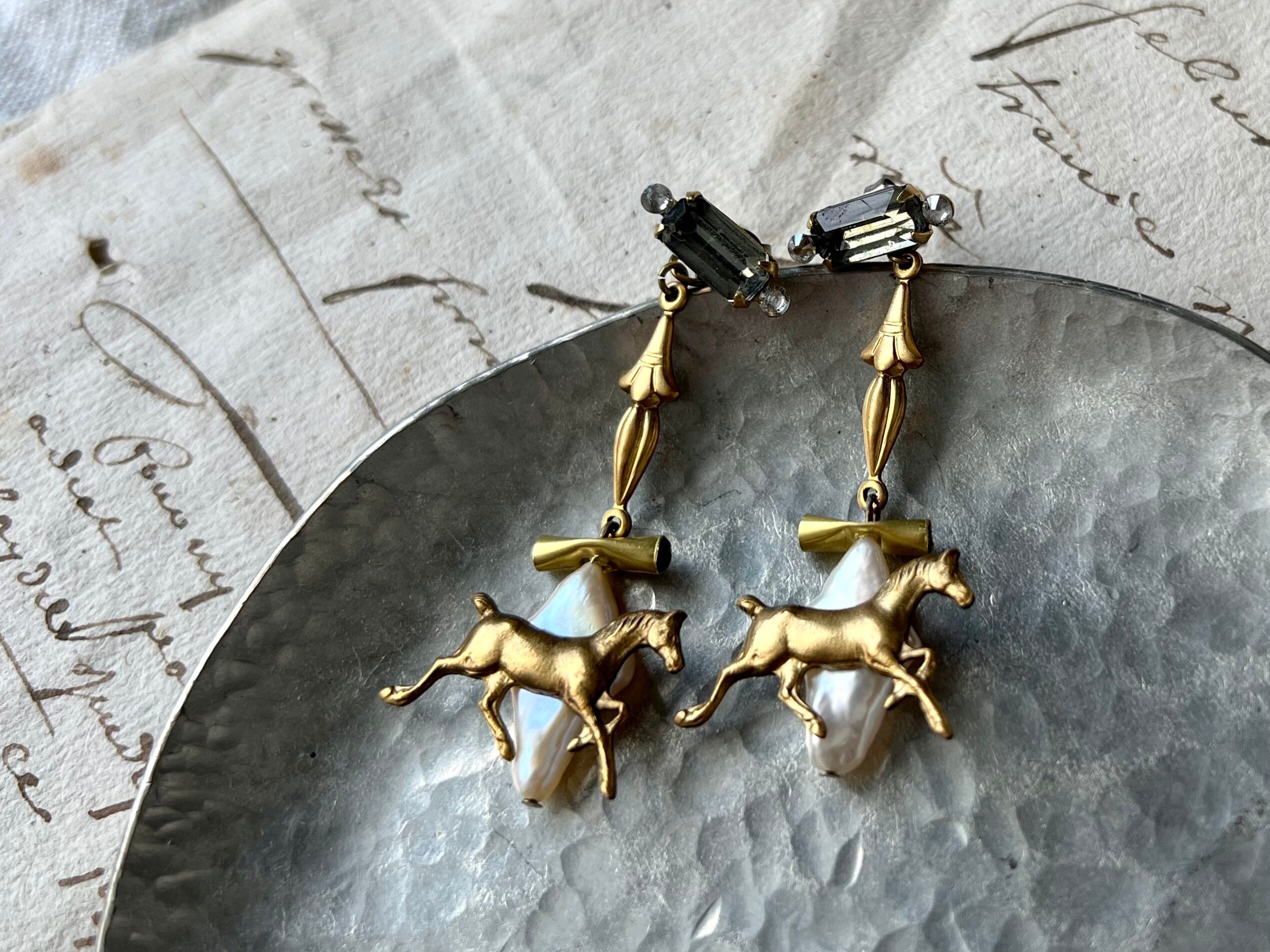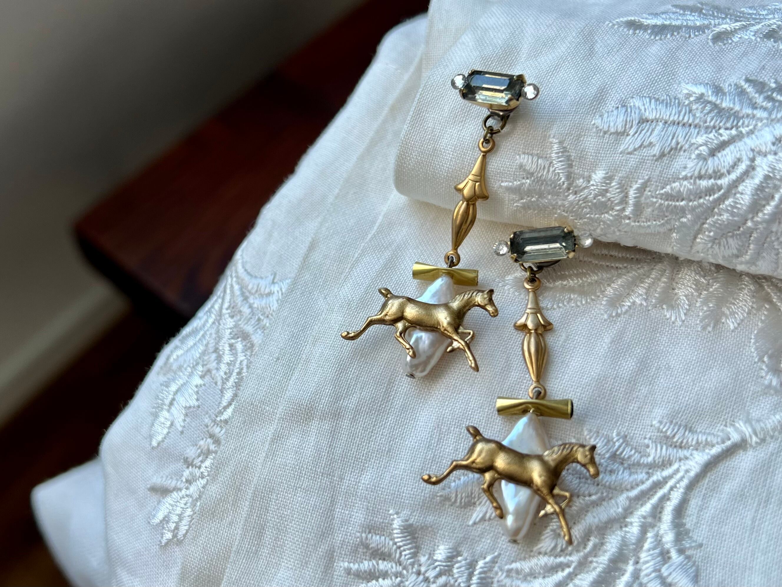 静謐な光を讃える淡水パールにホースチャームを置き、スワロフスキーを添えたスモーキーカラーのガラスカボションを合わせました。