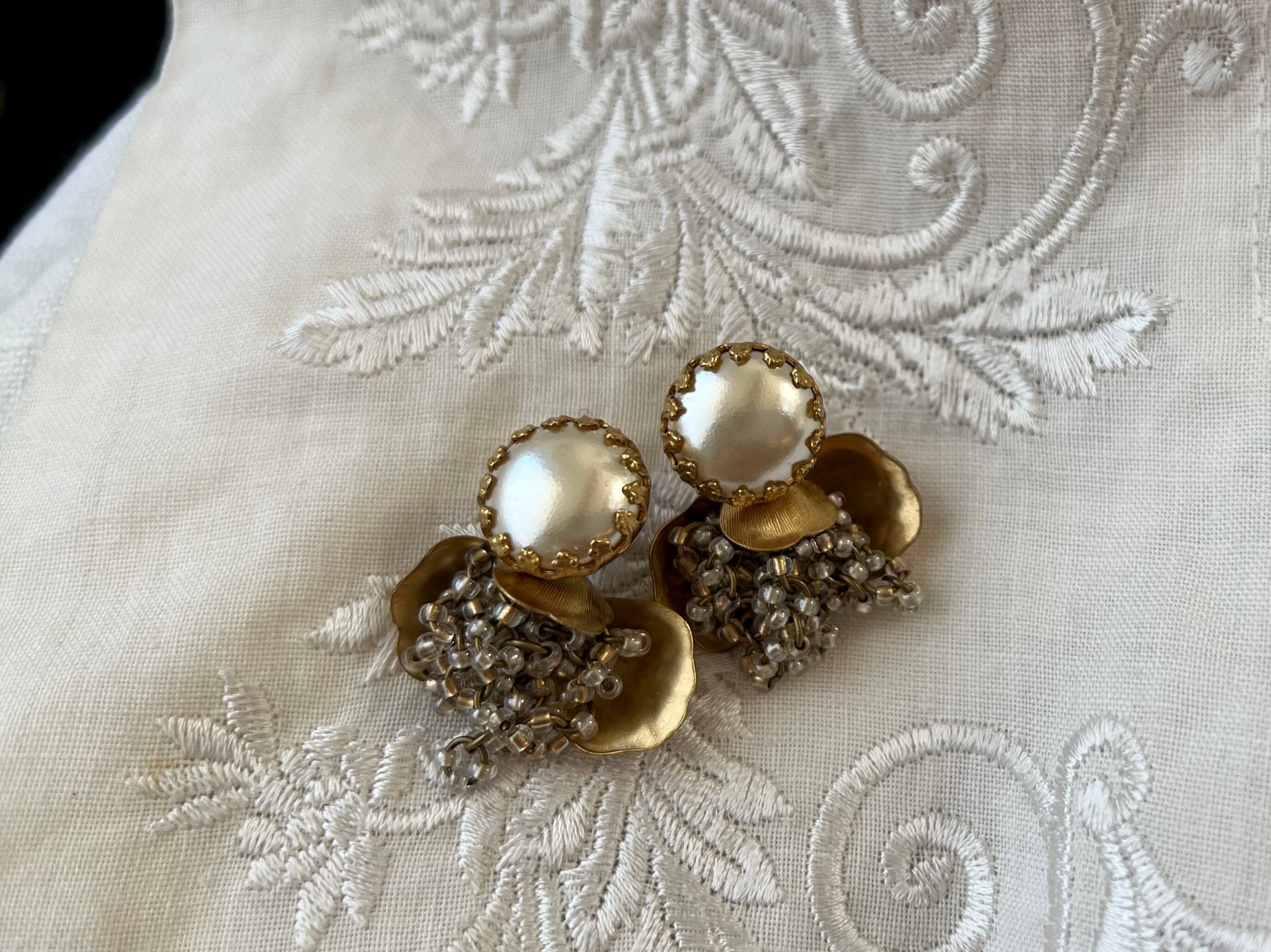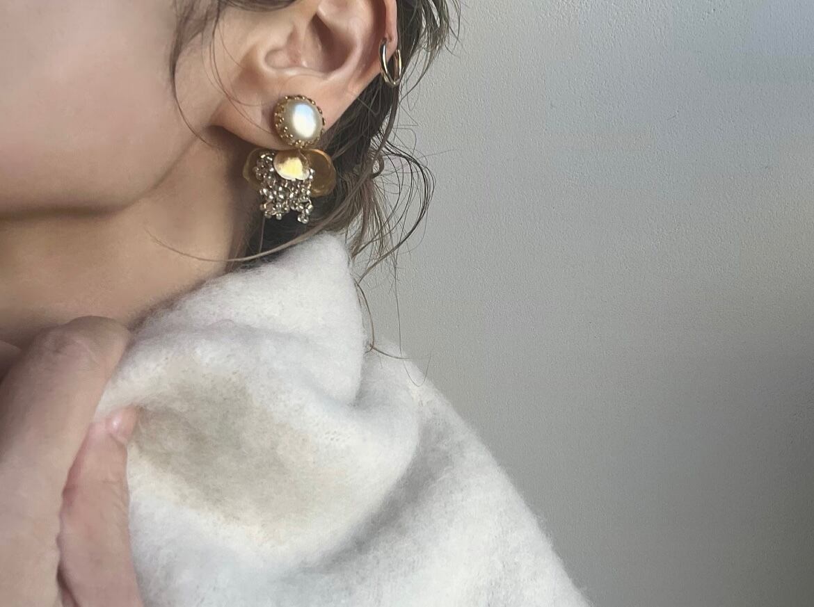 まろやかなパールと、ボタニカルパーツに包まれたたわわなガラスビーズがロマンチックな雰囲気です。