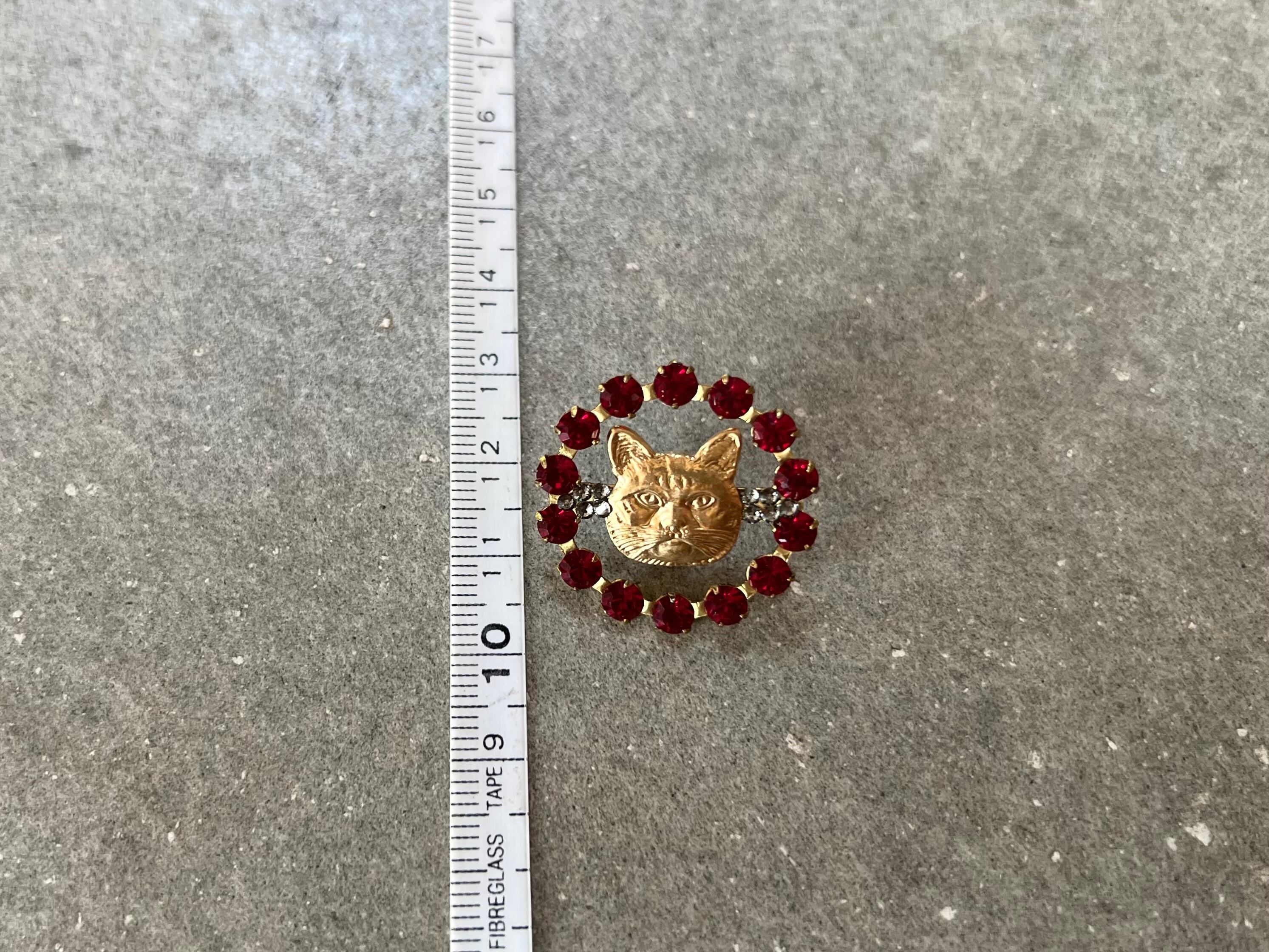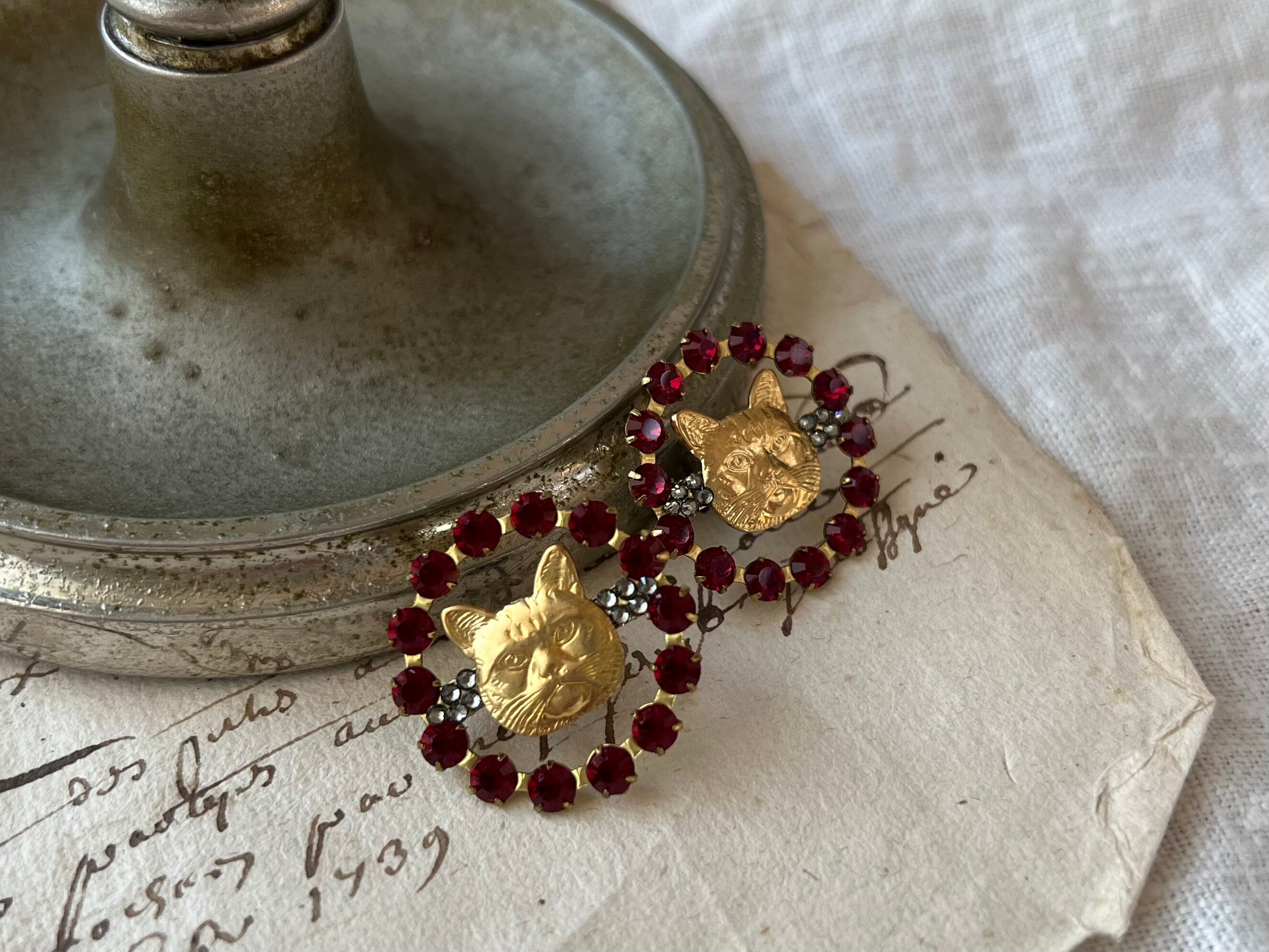 赤いガラスが嵌め込まれたサークルパーツの中心にネコのチャームを置き、スワロフスキーを散りばめました。