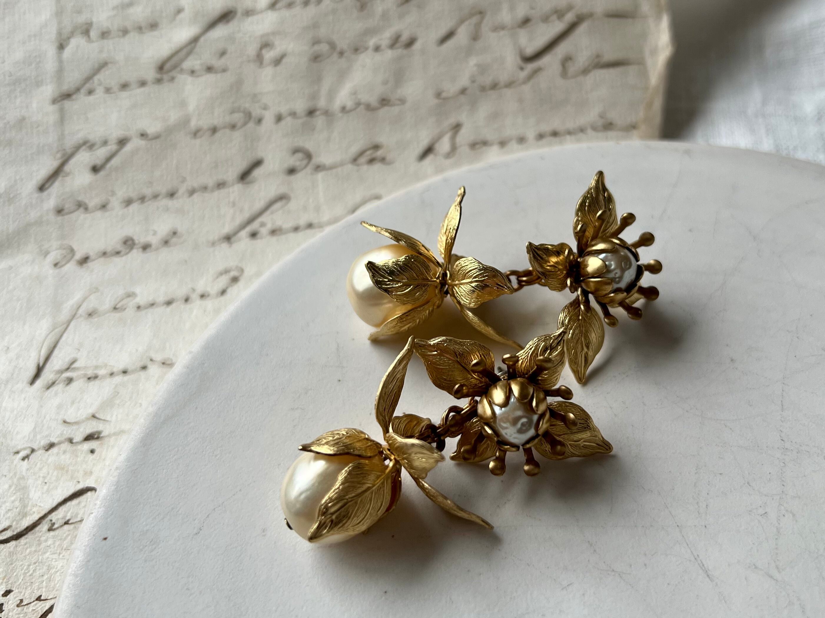 様々に重ねたボタニカルパーツとガラスパールがクラシカルで優美な雰囲気ですが、そこに少しごつめのダブルチェーンをプラスして、モードな要素も感じられるように仕上げました。