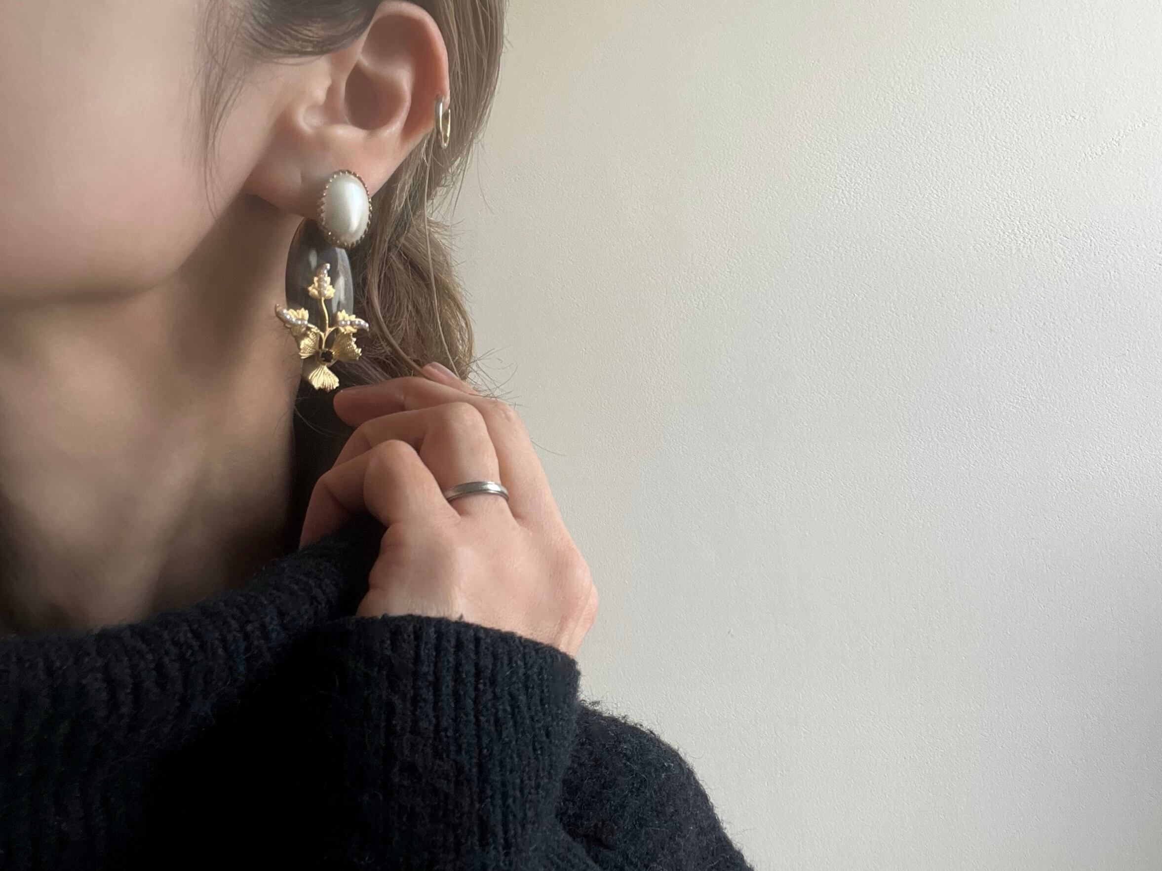 ドイツのヴィンテージビーズにたおやかなボタニカルパーツを重ね、パールでしっとりとした華やかさをプラスしました。