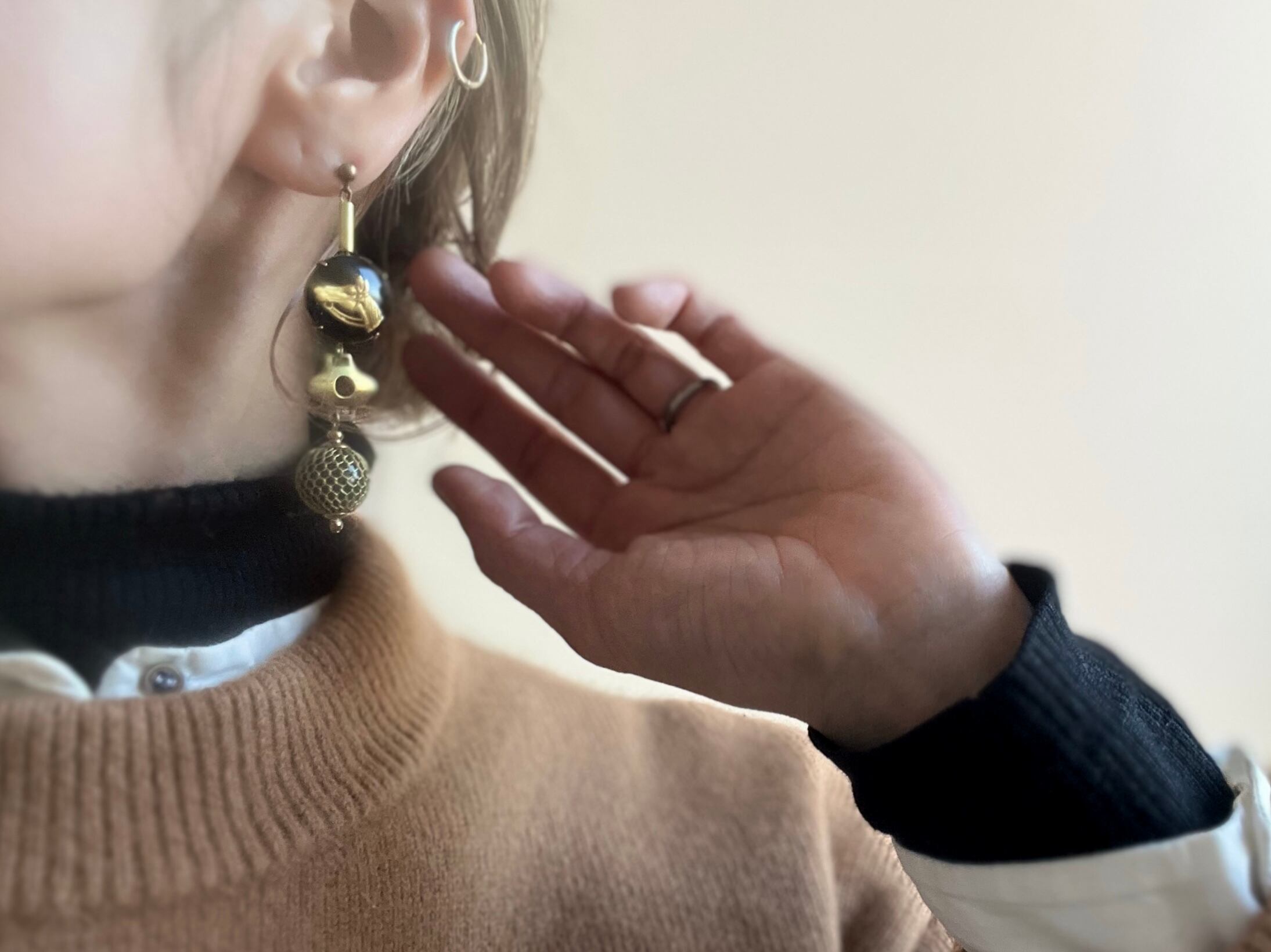ブラックとホースチャームの掛け合わせがシックで個性的なので、チェーンやメッシュビーズなども少しパンチを効かせて遊び心溢れるデザインに仕上げました。