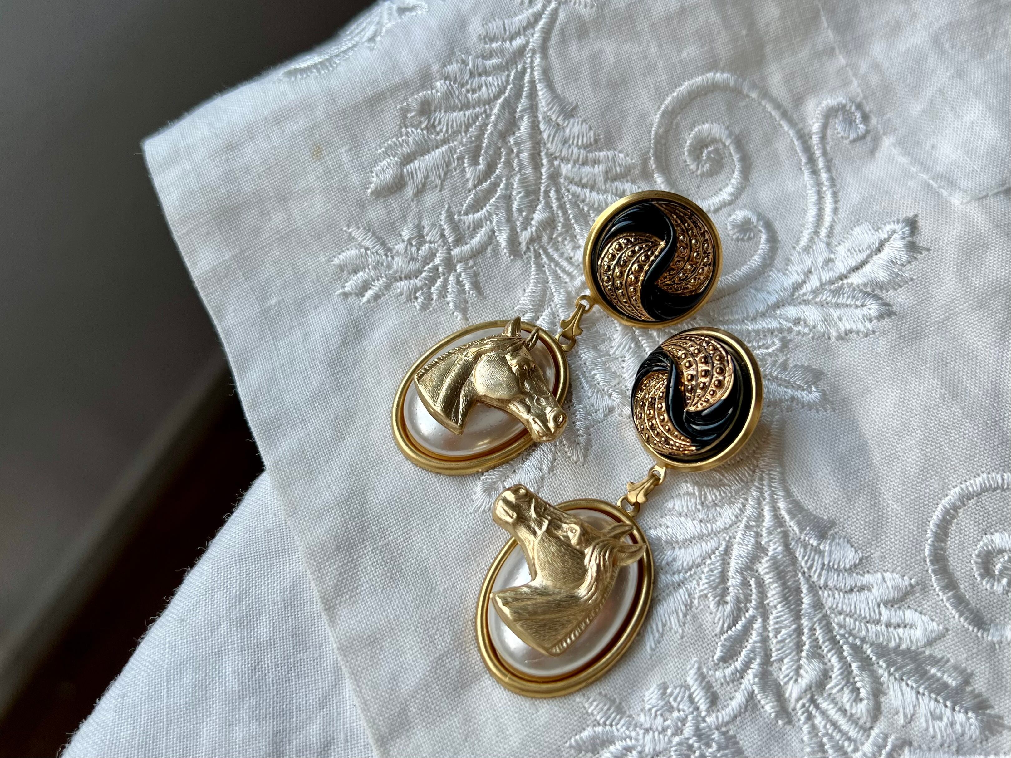 アールデコを彷彿させるガラスボタンにパールを合わせ、ホースチャームを加えて個性を出しました。