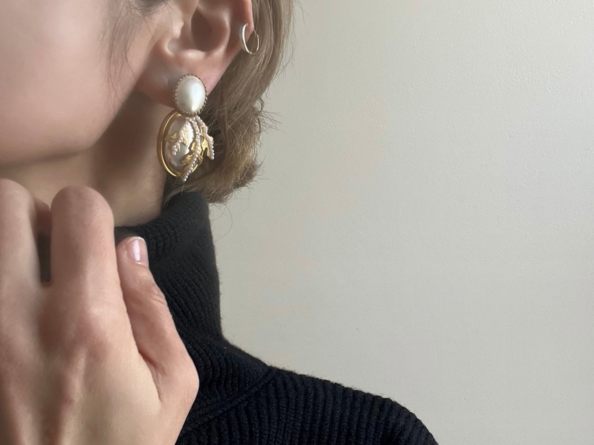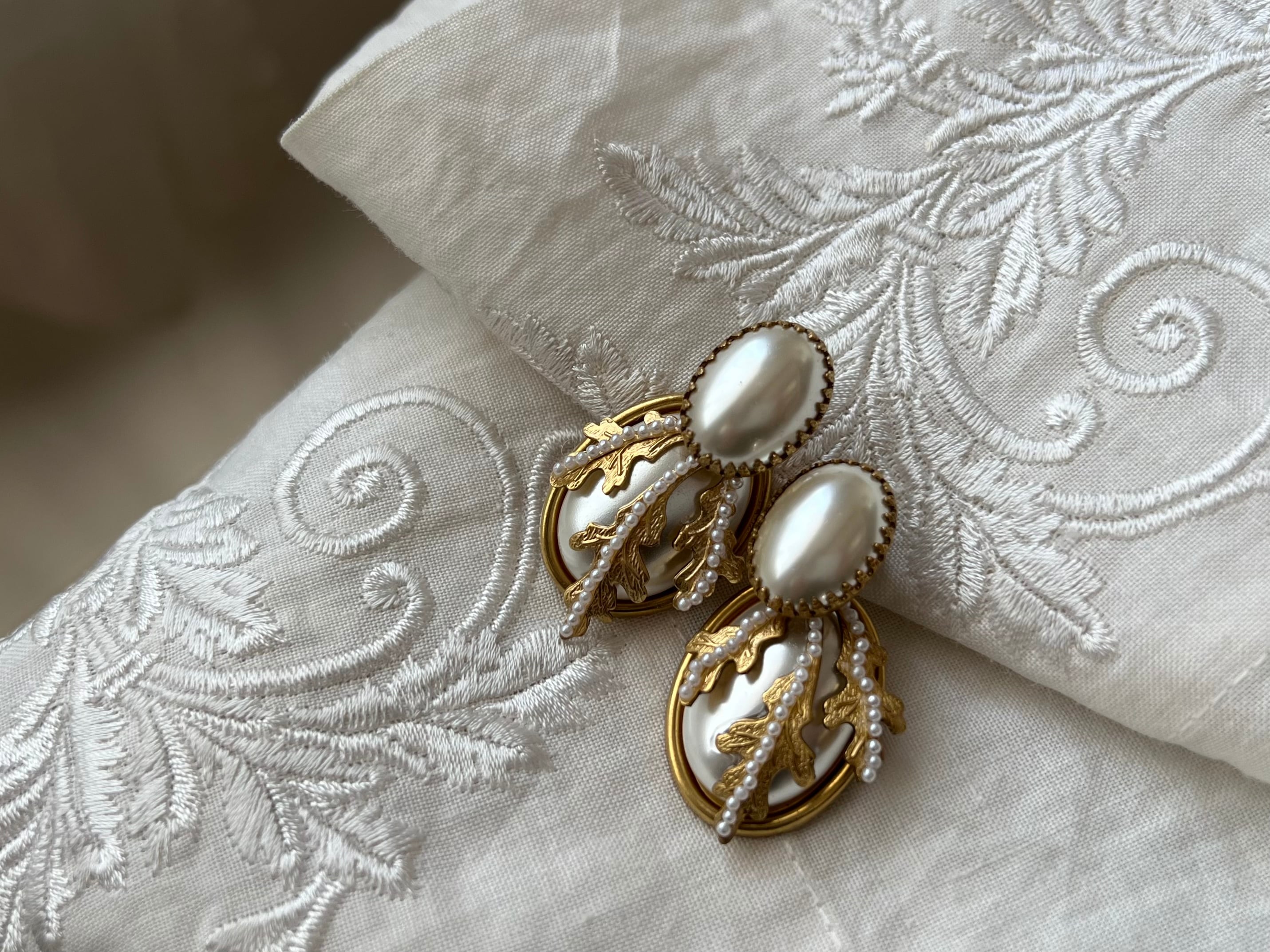 純白のパールとボタニカルパーツが静謐で凛とした印象です。