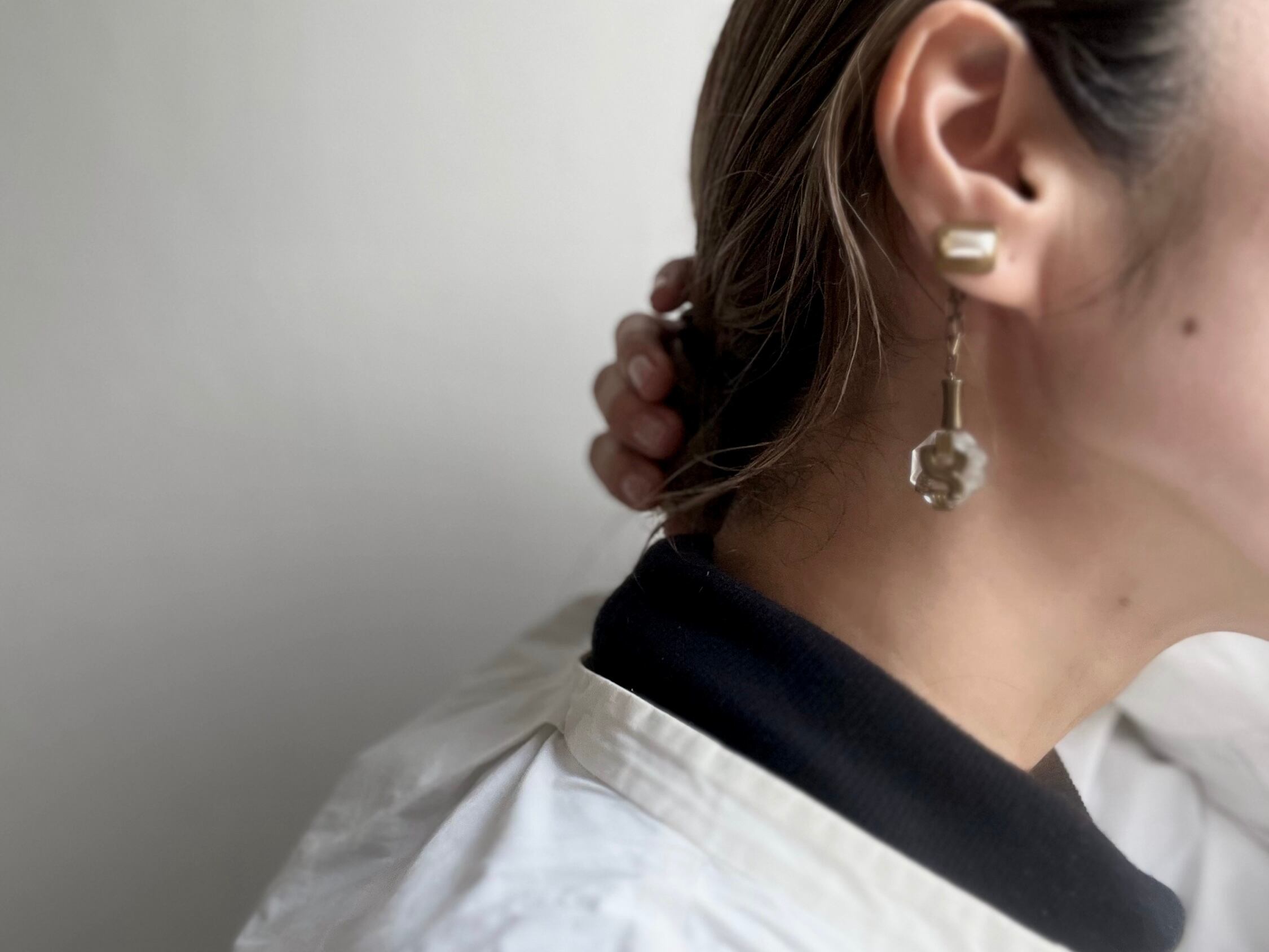 個性的な真鍮パーツにシャンデリアガラスやミリアムハスケルのパールなどのロマンチックなパーツをミックスさせて、シックで大人っぽい雰囲気に仕上げました。