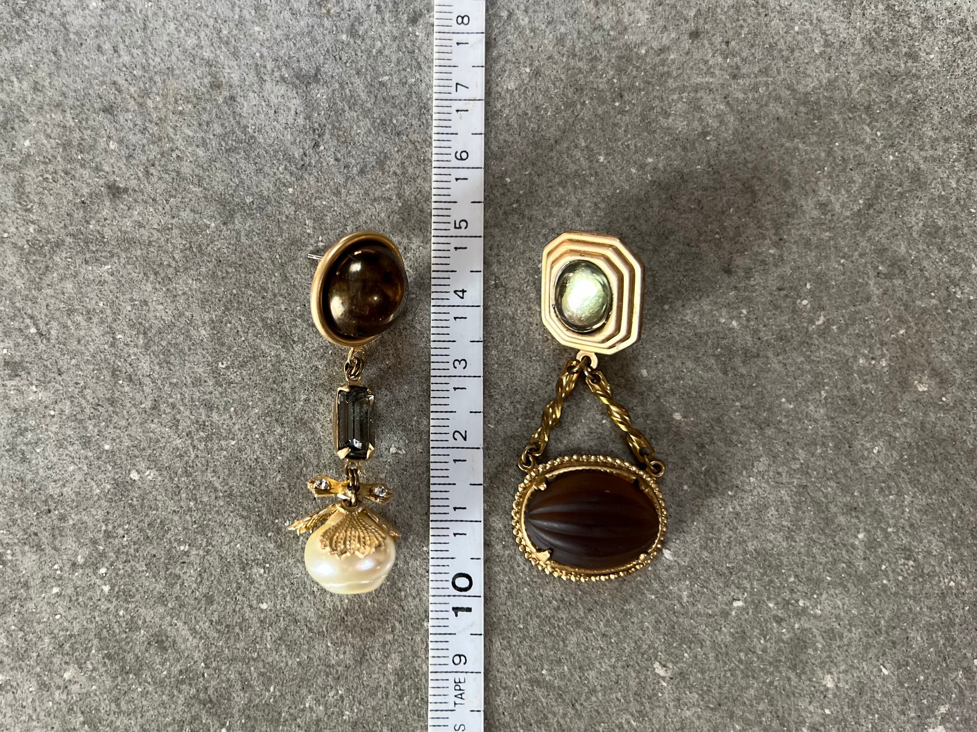 ヴィンテージパーツを使用してアシンメトリーなピアスを作りました。