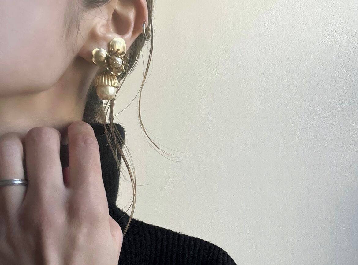 ボタニカルパーツやミリアムハスケル、ガラスパールなど、ロマンチックな要素を詰め込んで柔らかな雰囲気に仕上げました。