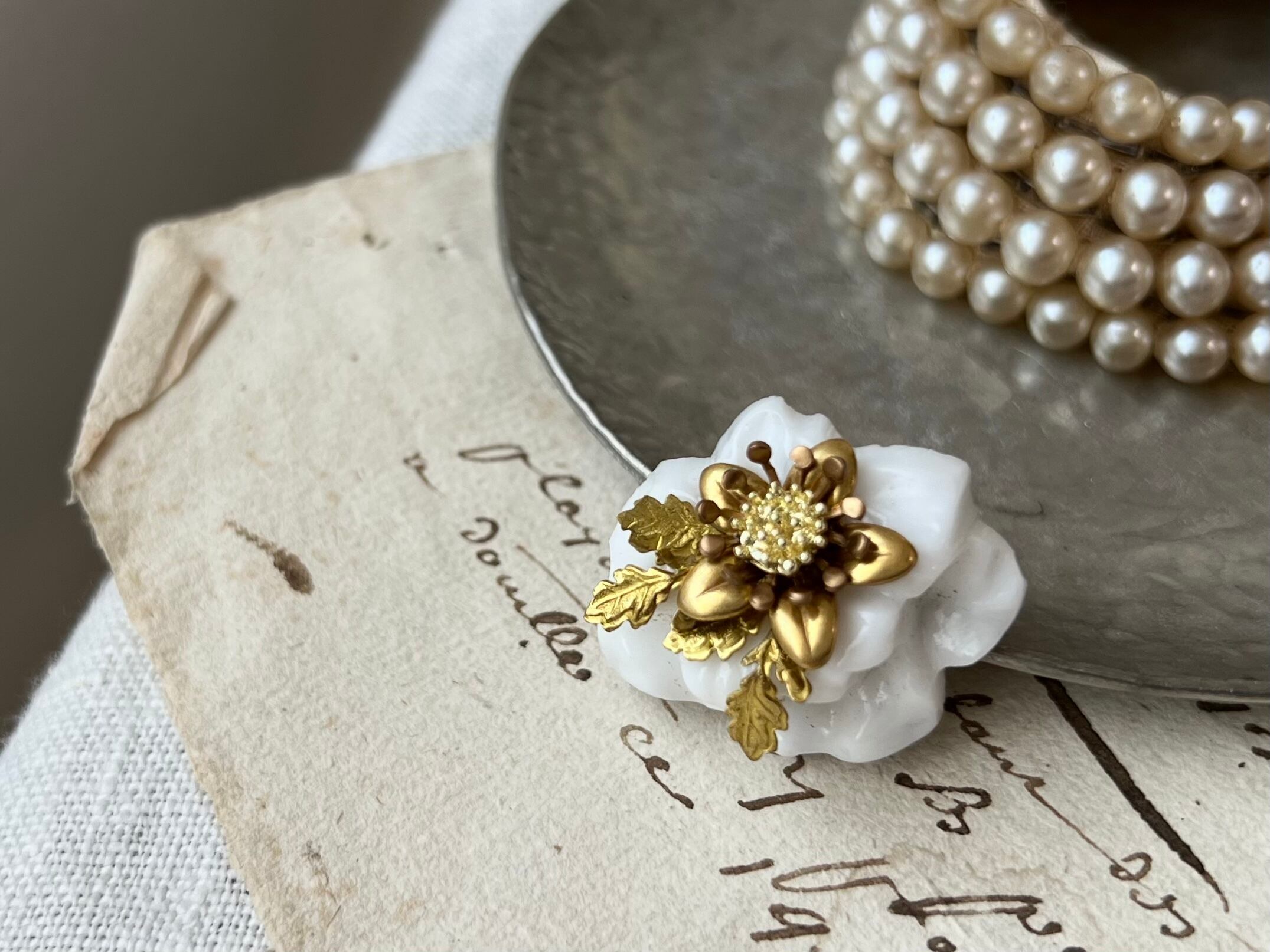 つるりと静謐な艶を湛えるミルクガラスと真鍮のボタニカルパーツが清らかな印象です。