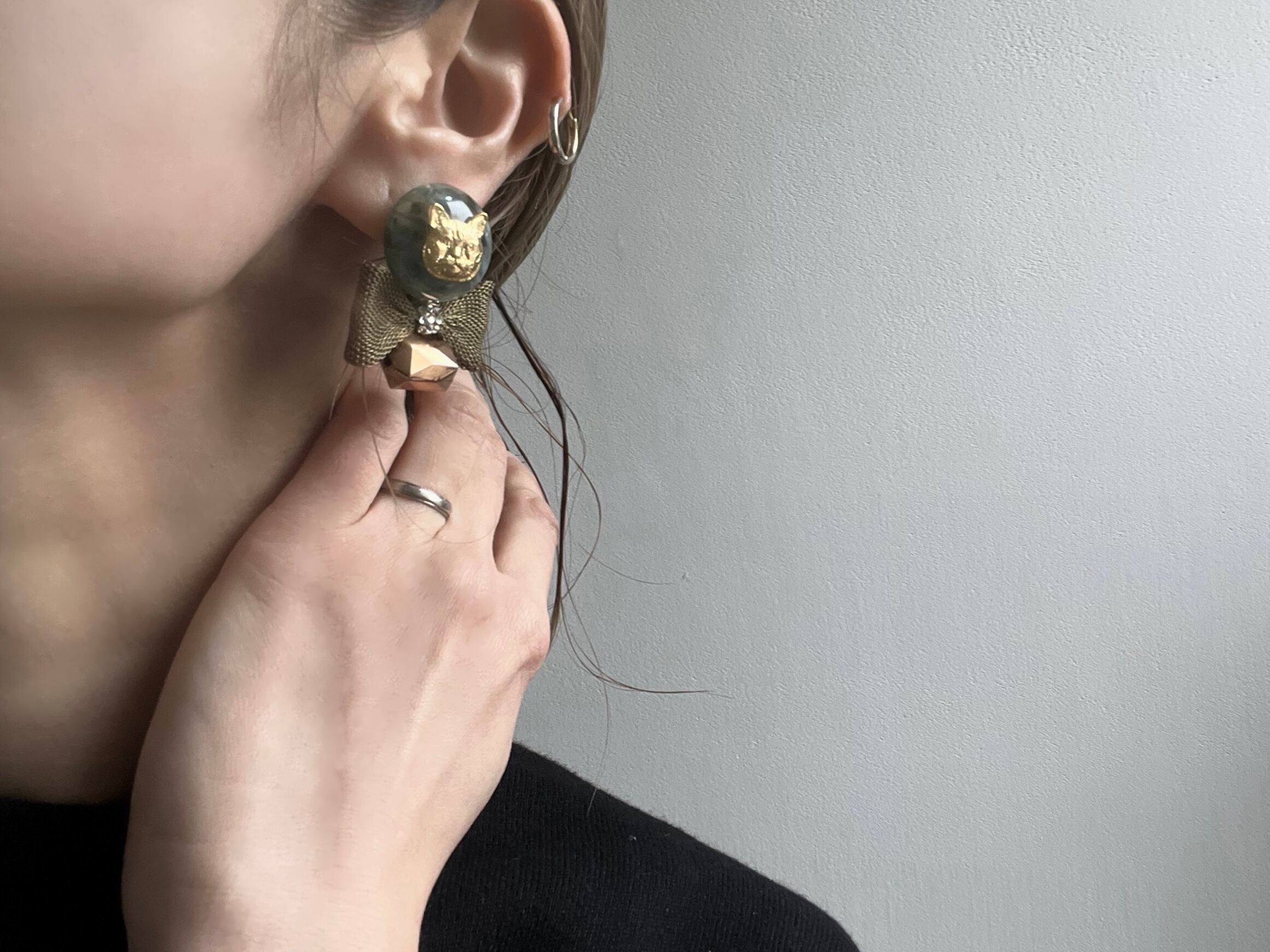 くすんだブルーをベースにしたカボションにネコのチャームやリボンを添えて、お茶目で個性的なデザインに仕上げました。