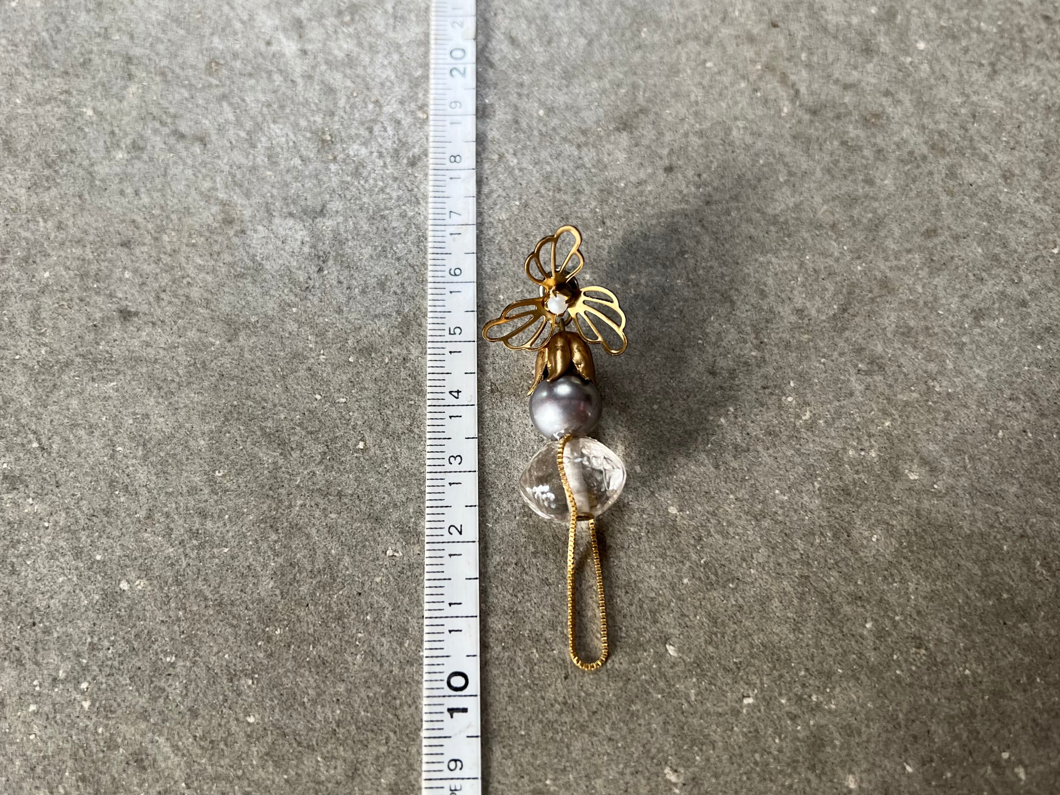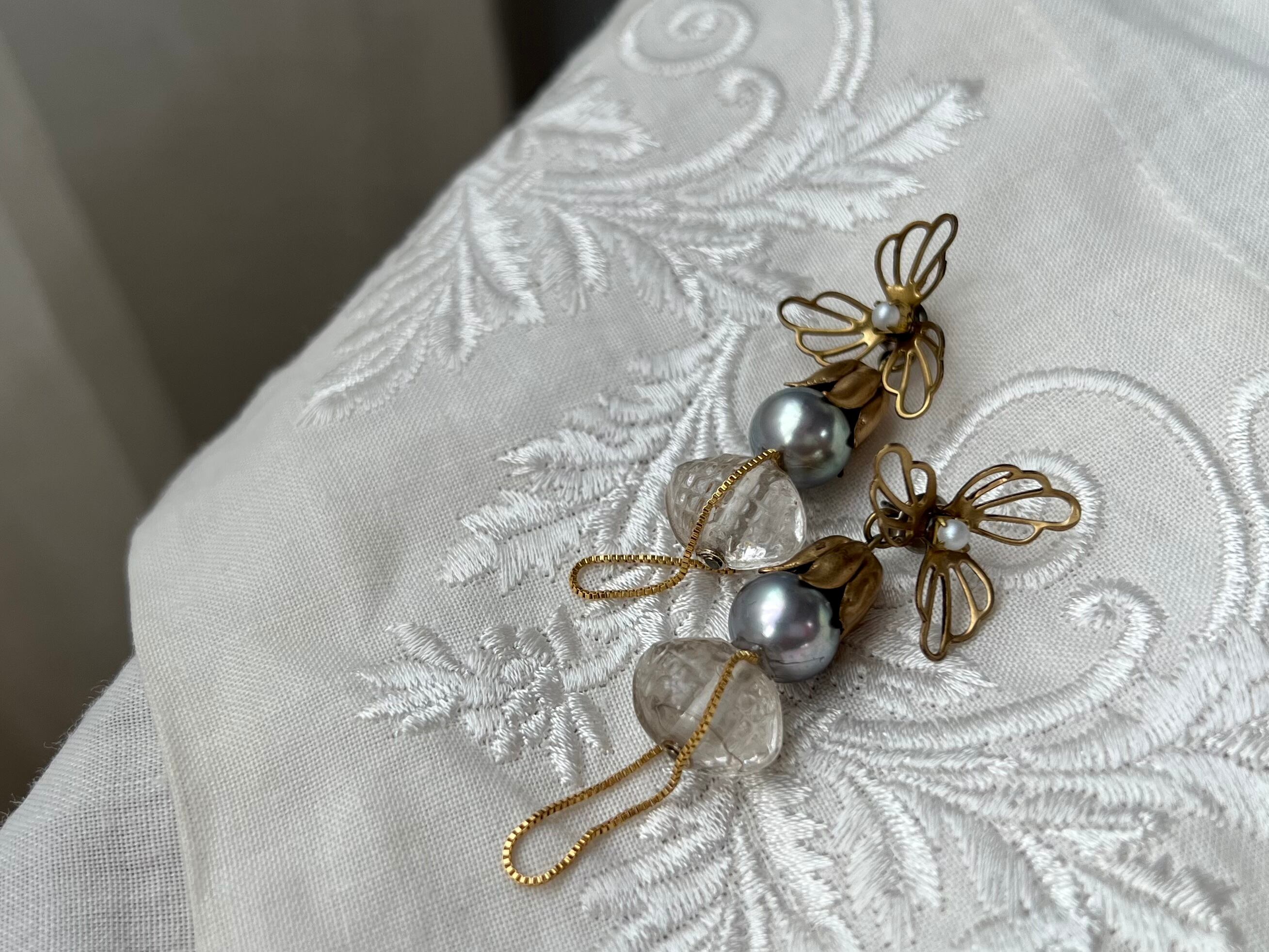 透かしの美しいボタニカルパーツにスワロフスキーのパールをあしらったカボションに、個性的なガラスとシックなパールを添えました。