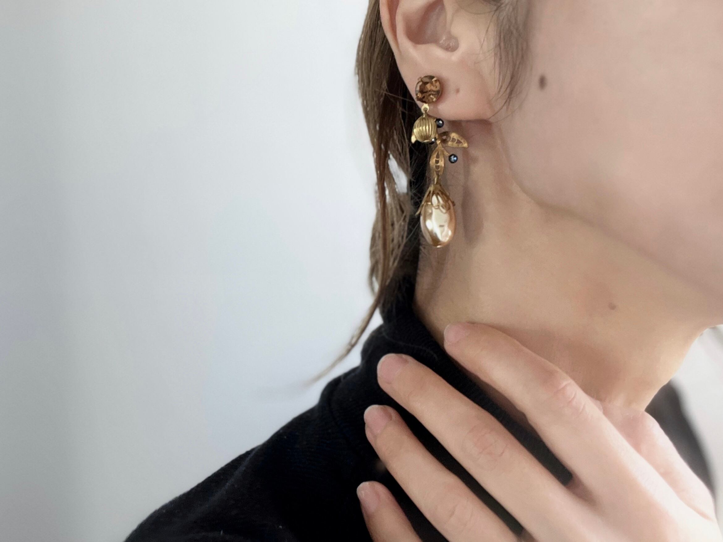 アンバーカラーのガラスカボションにピーチカラーのパールやボタニカルパーツを合わせてクラシカルな雰囲気に仕上げ、アクセントにクールな色味のスワロフスキーを散らして、シックな大人っぽい要素もプラスしました。