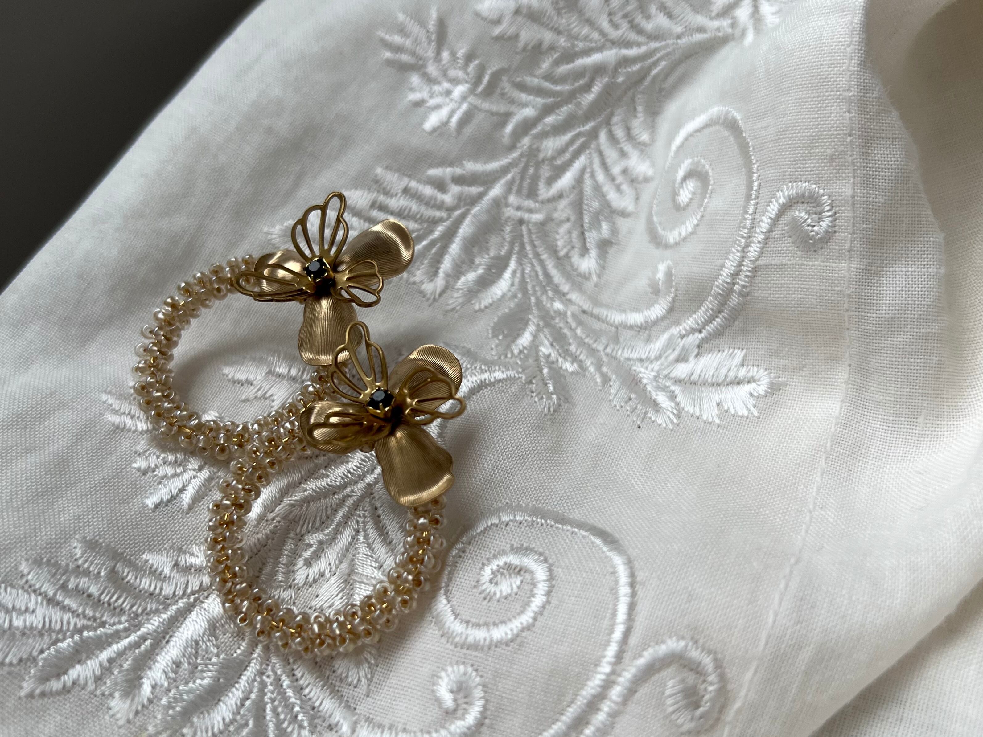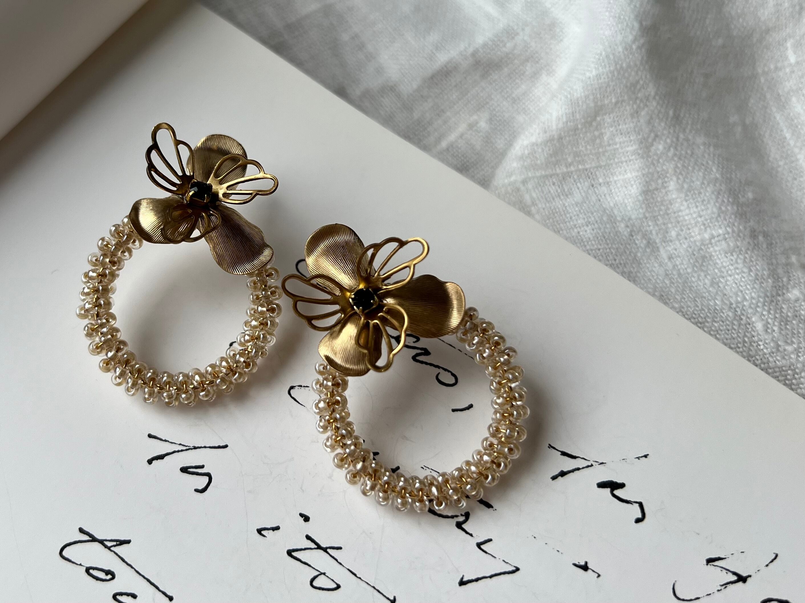 フープにアンティークビーズをあしらってボタニカルパーツを添えたシンプルなデザインですが、繊細なビーズが印象的です。