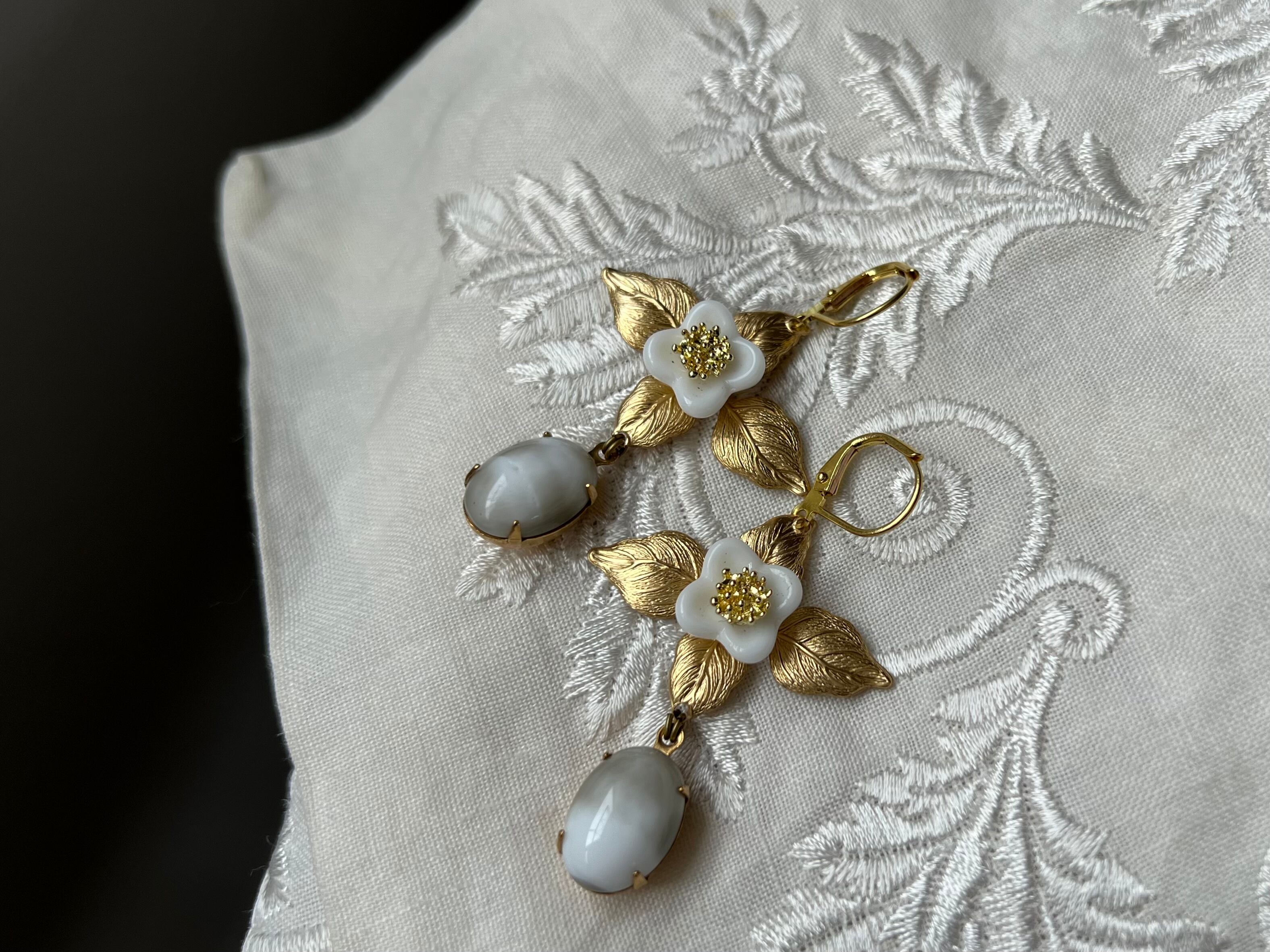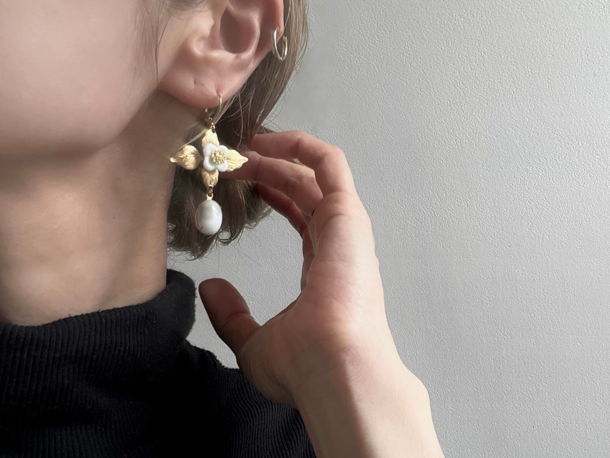 ボタニカルパーツの中央にはミリアムハスケルのミルクガラスのお花が可憐に咲いています。