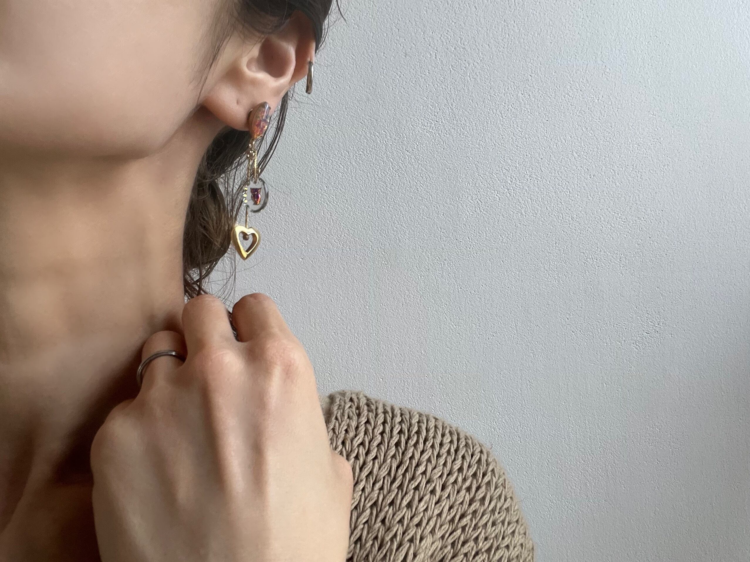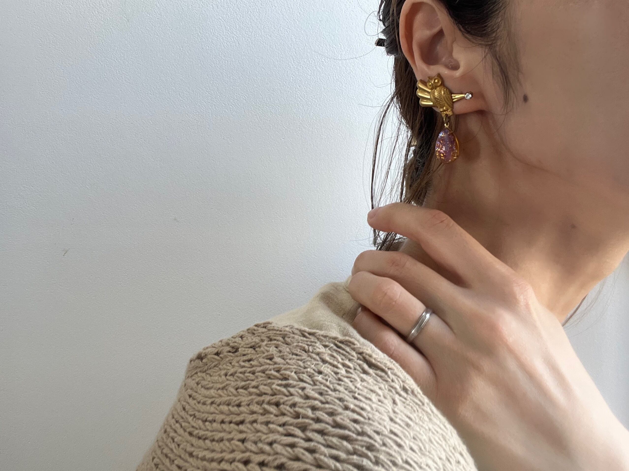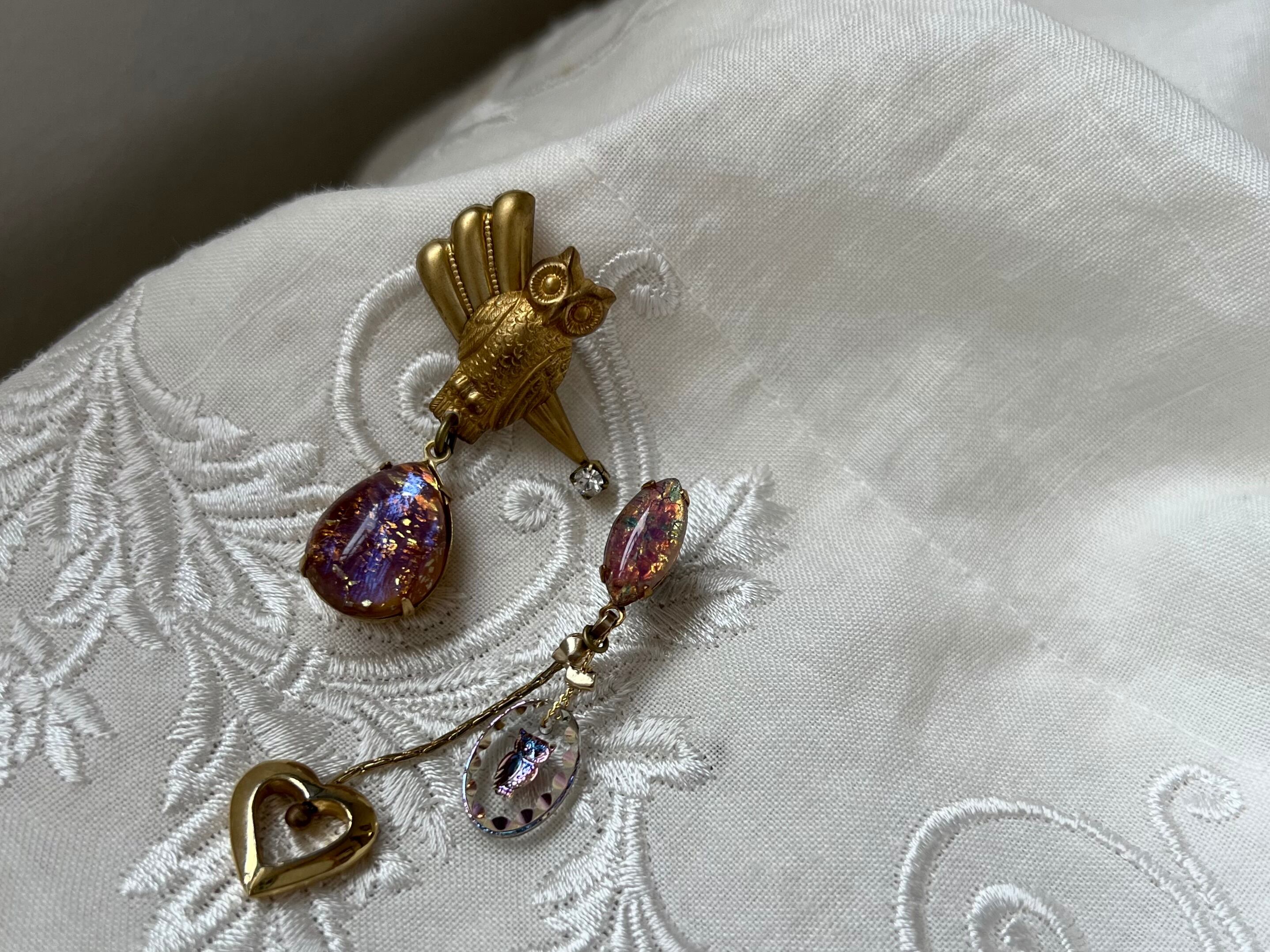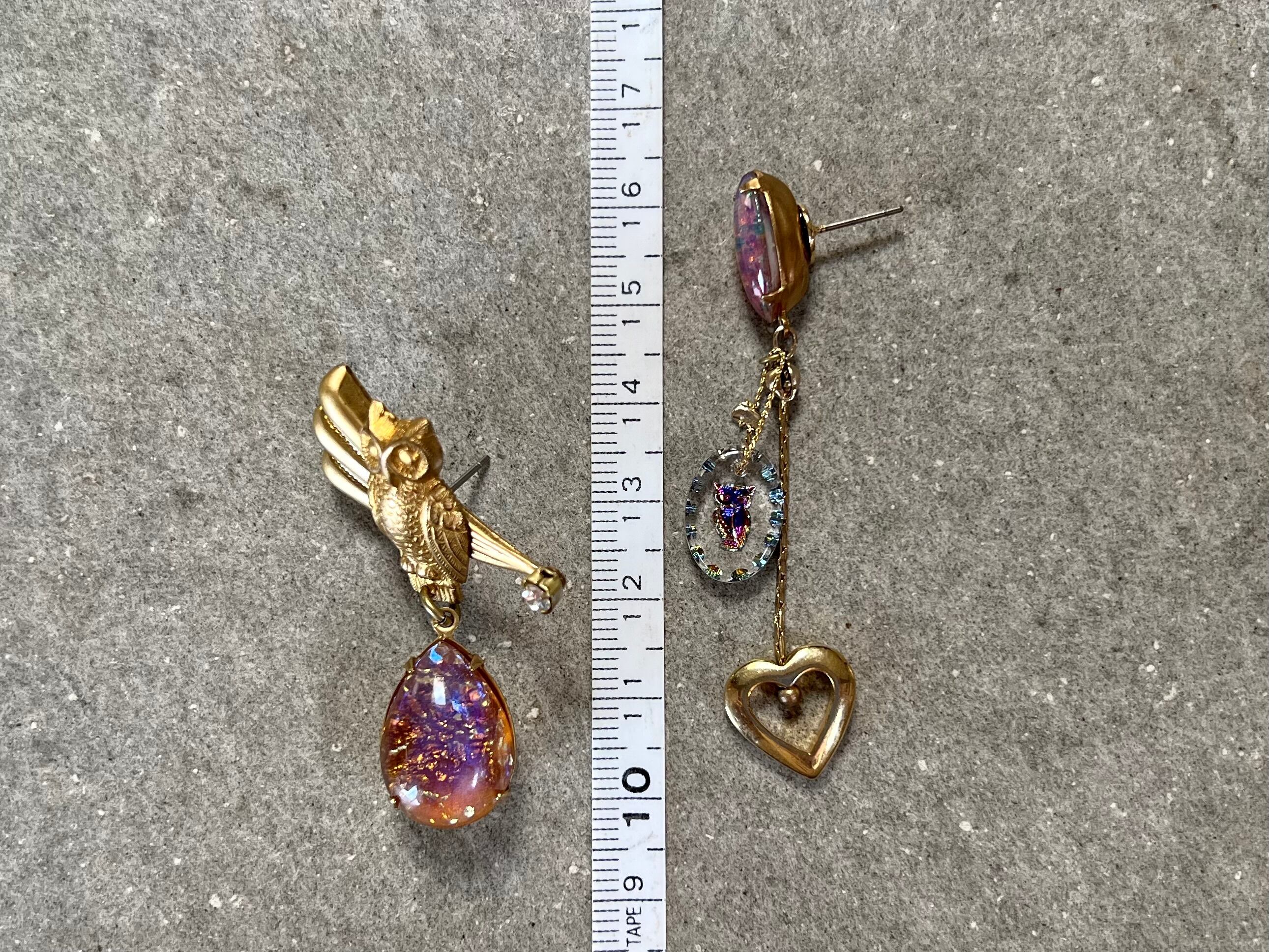 ヴィンテージパーツを使用してアシンメトリーなピアスを作りました。