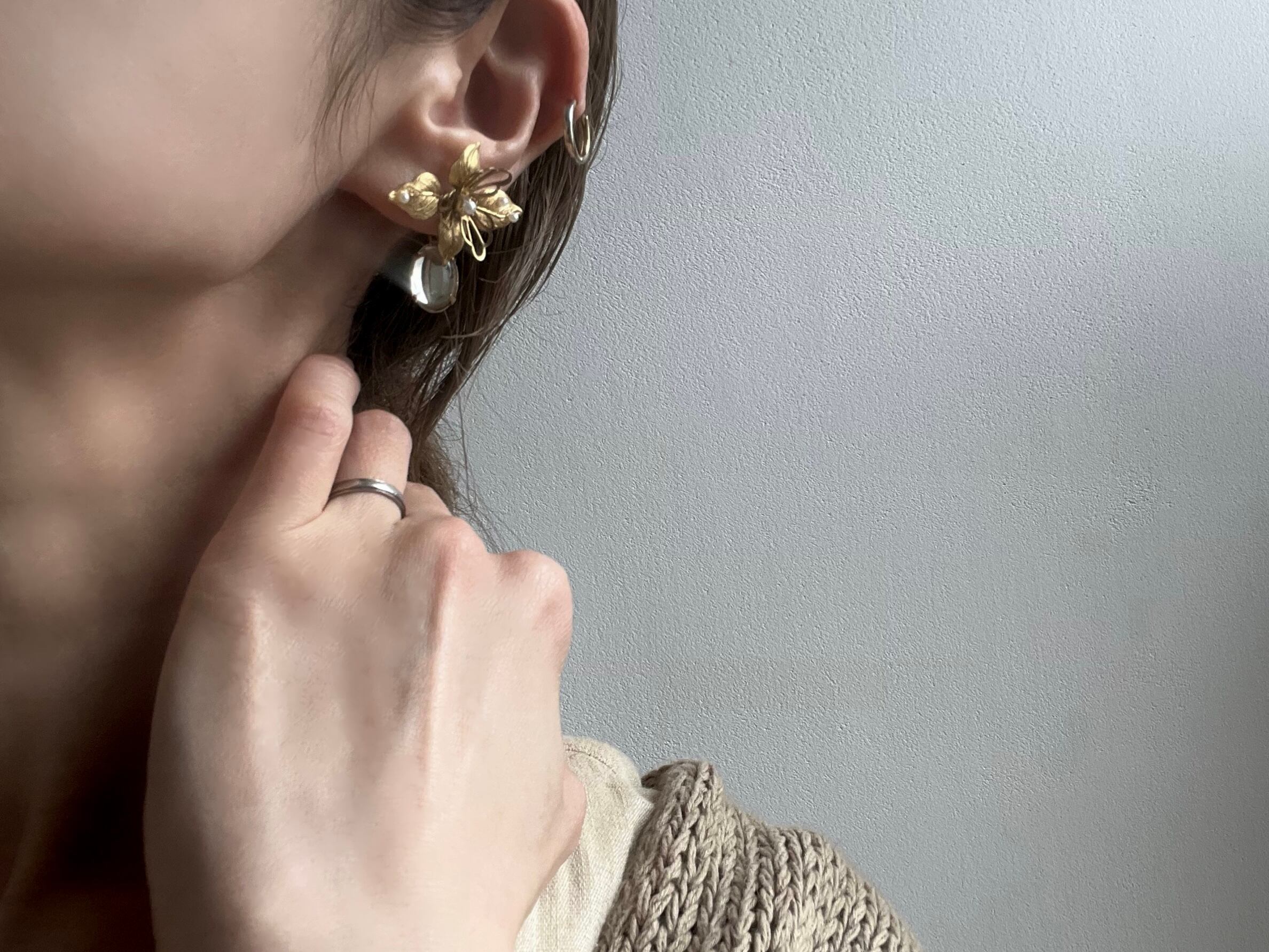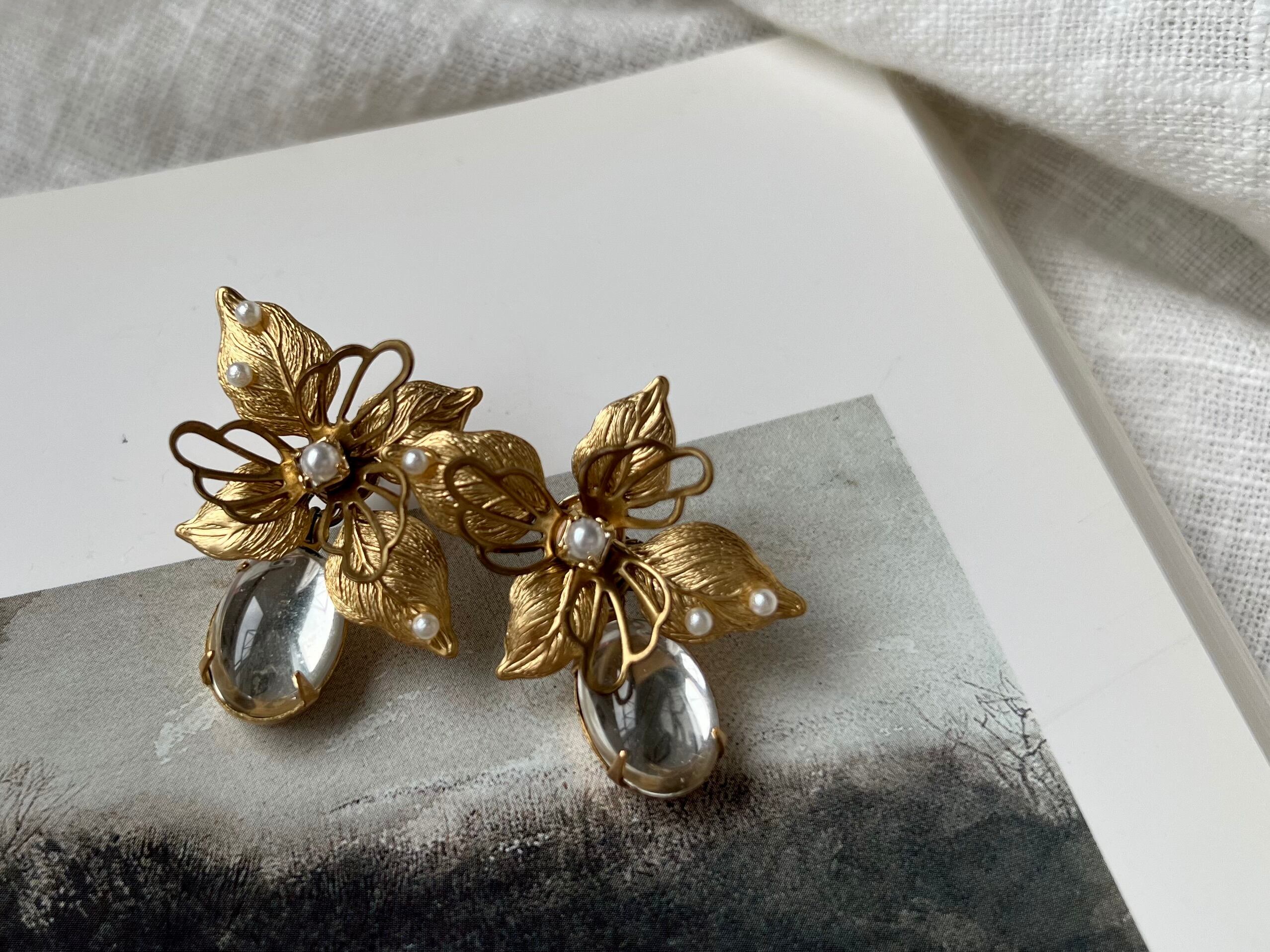ボタニカルパーツを重ねてパールを添えたカボションに、一粒ガラスが美しく映えます。