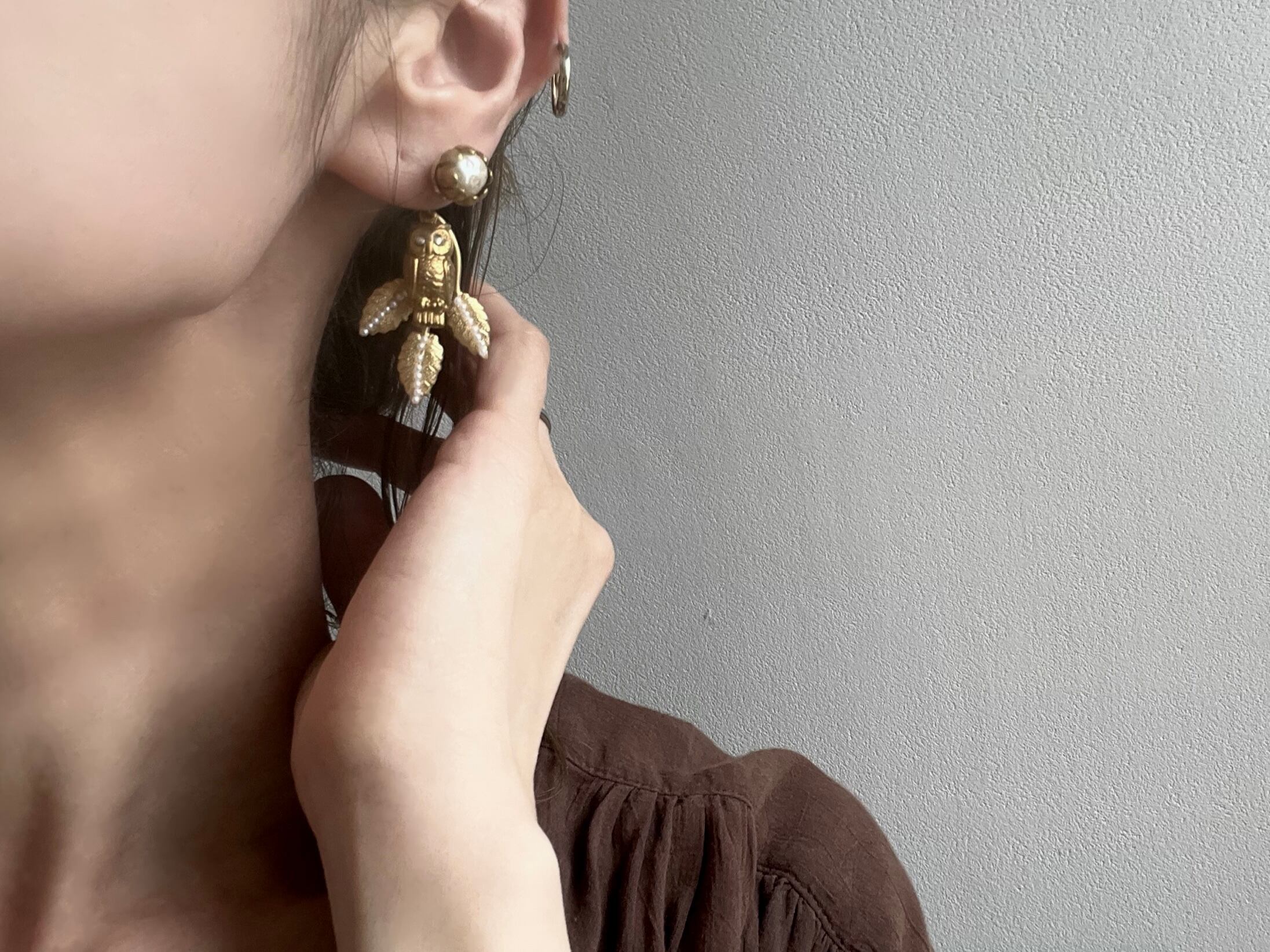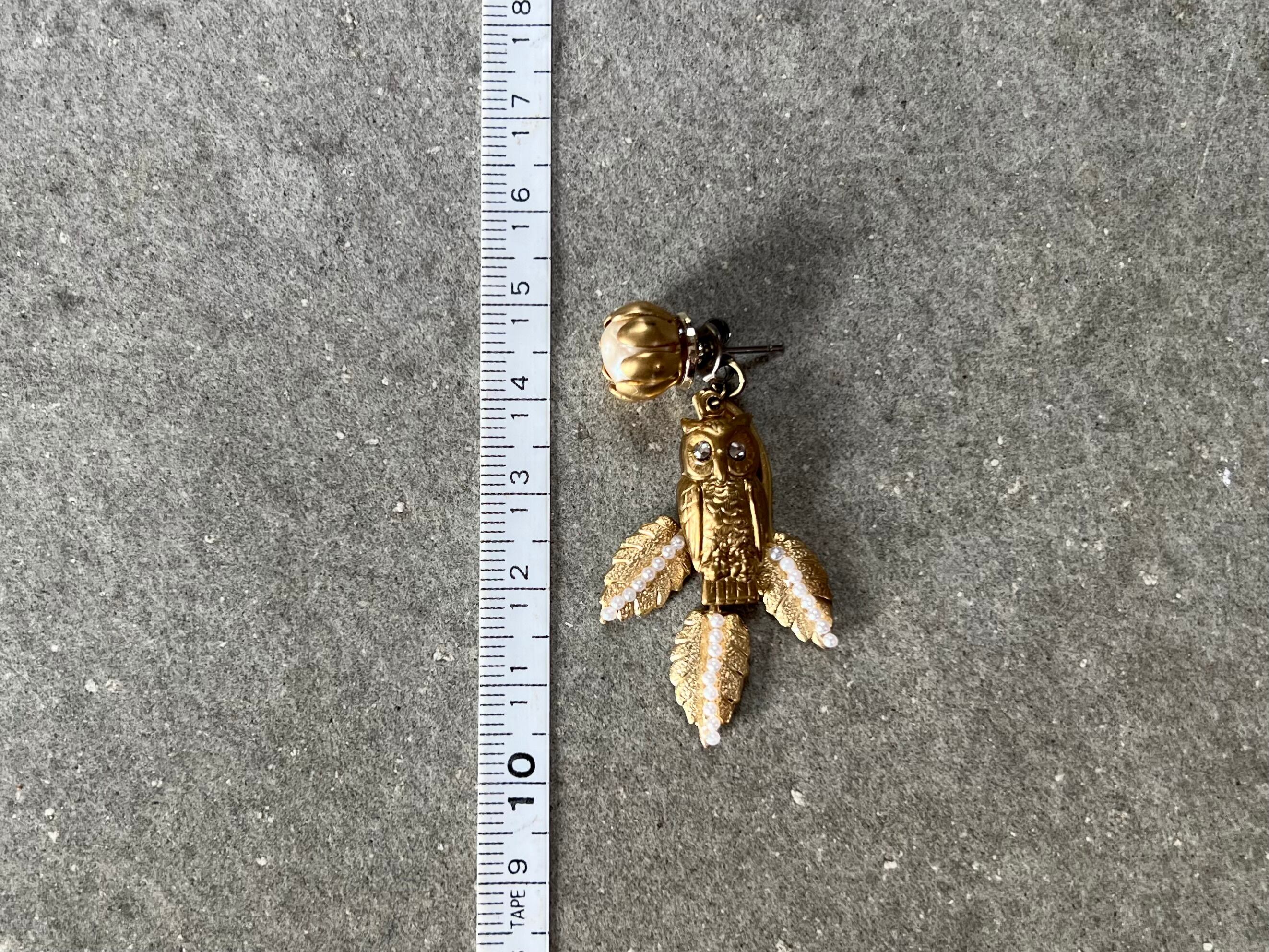 小粒のパールを並べたボタニカルパーツにスワロフスキーをあしらったフクロウチャームを添えて、愛らしくもクラシカルな雰囲気に仕上げました。