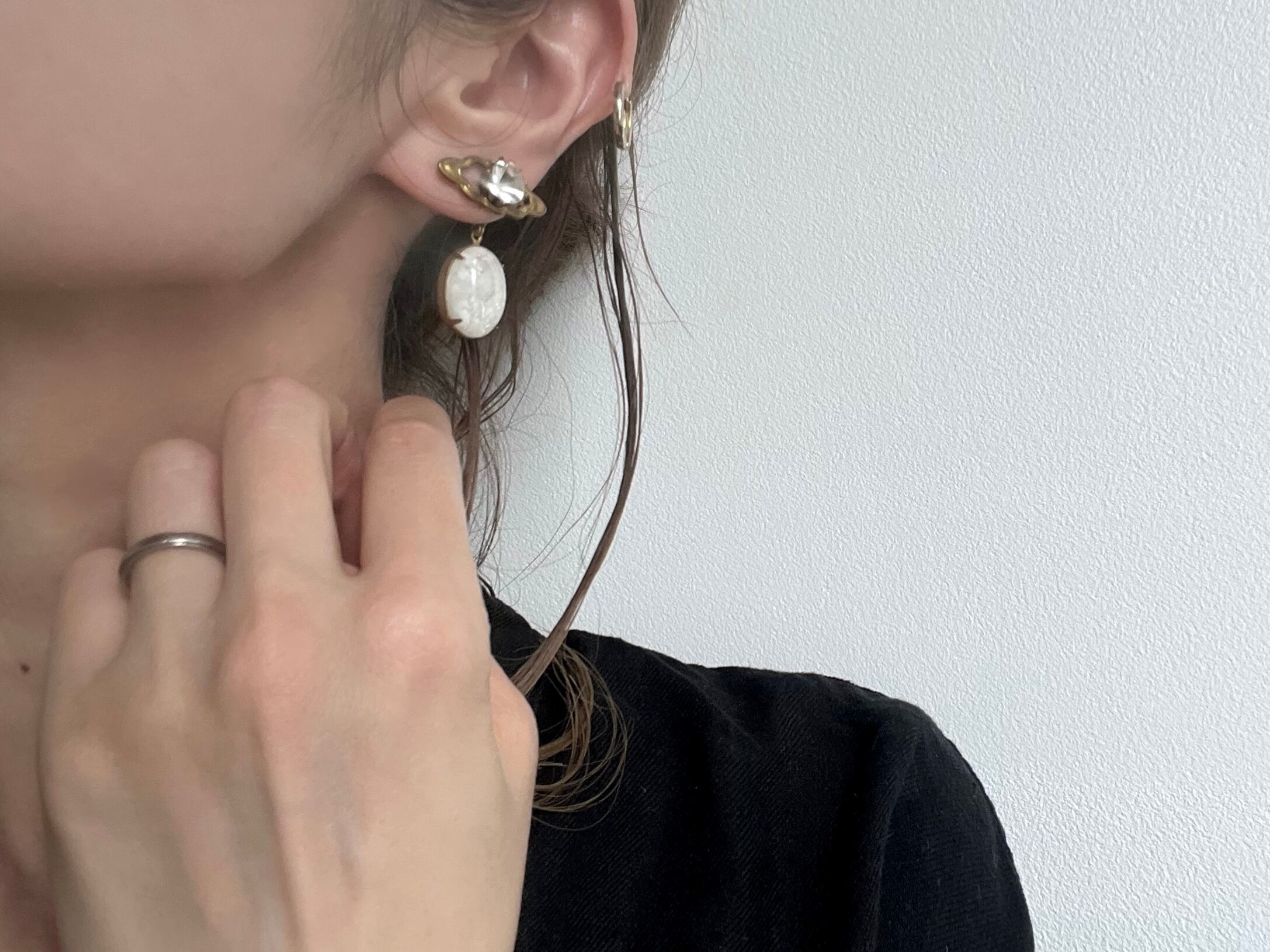 スワロフスキーやシェル、マーブルガラスなどそれぞれ異なる光を放つパーツが、それぞれの個性を発揮しつつ上品かつシックなまとまりを見せているデザインです。
