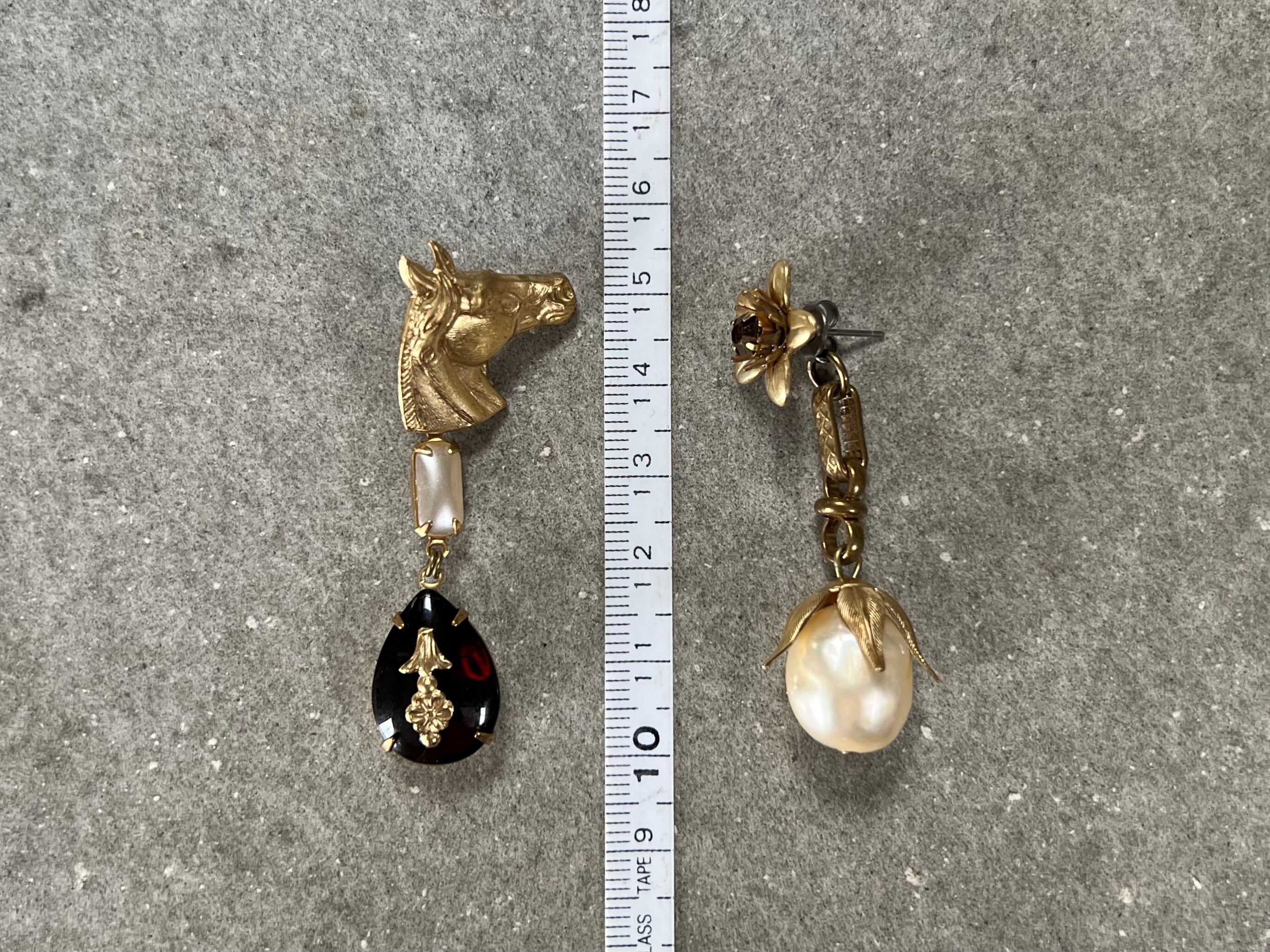ヴィンテージパーツを使用してアシンメトリーなピアスを作りました。