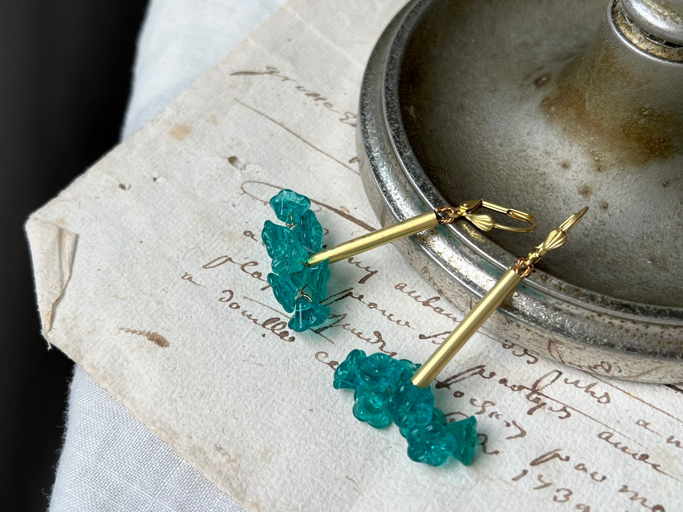ドイツ製の美しいグリーンの小花ガラスが横に広がる印象的なデザインです。