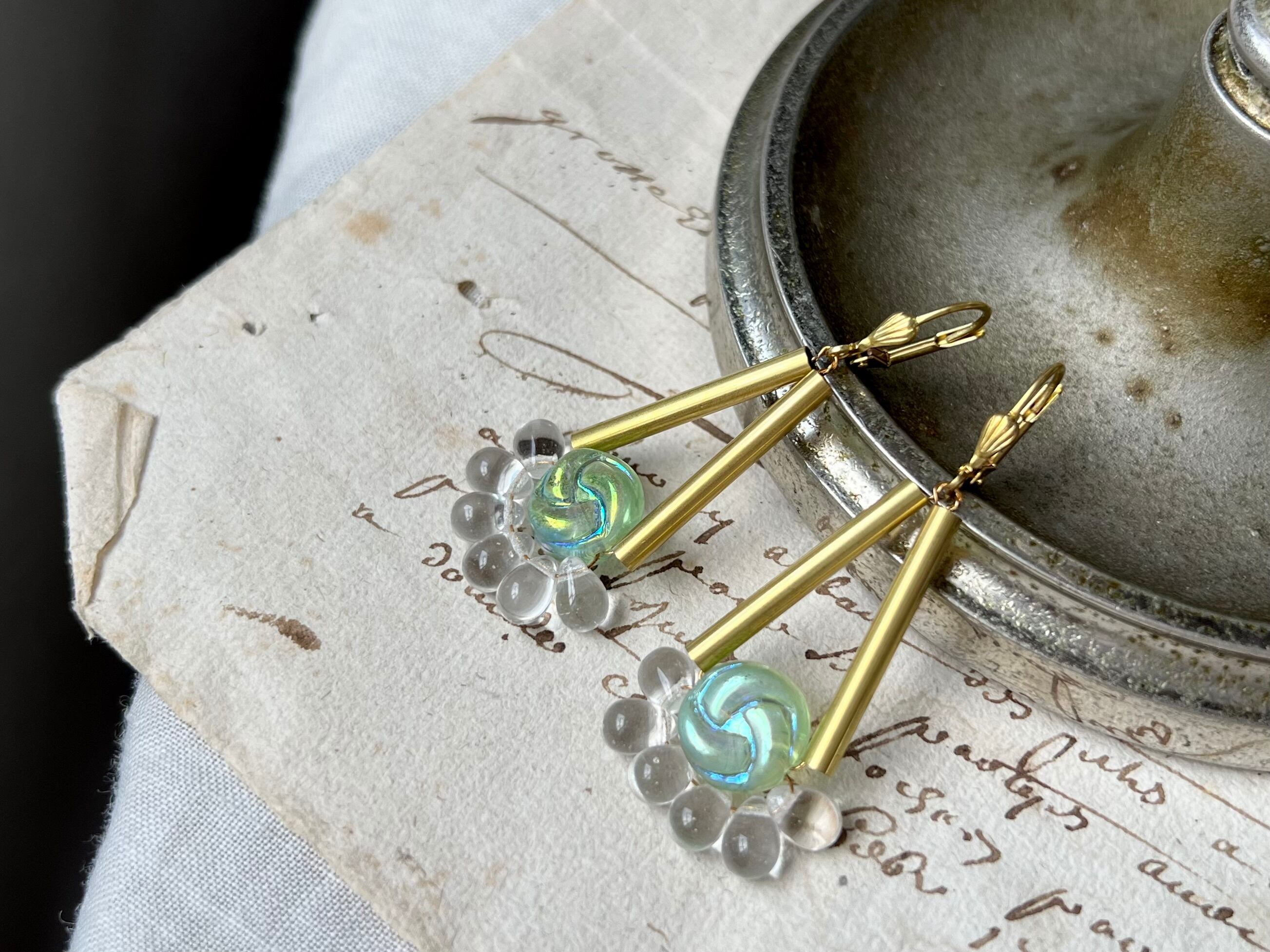 不思議な色味のドイツガラスにドロップガラスを沿わせた可愛らしいデザインです。