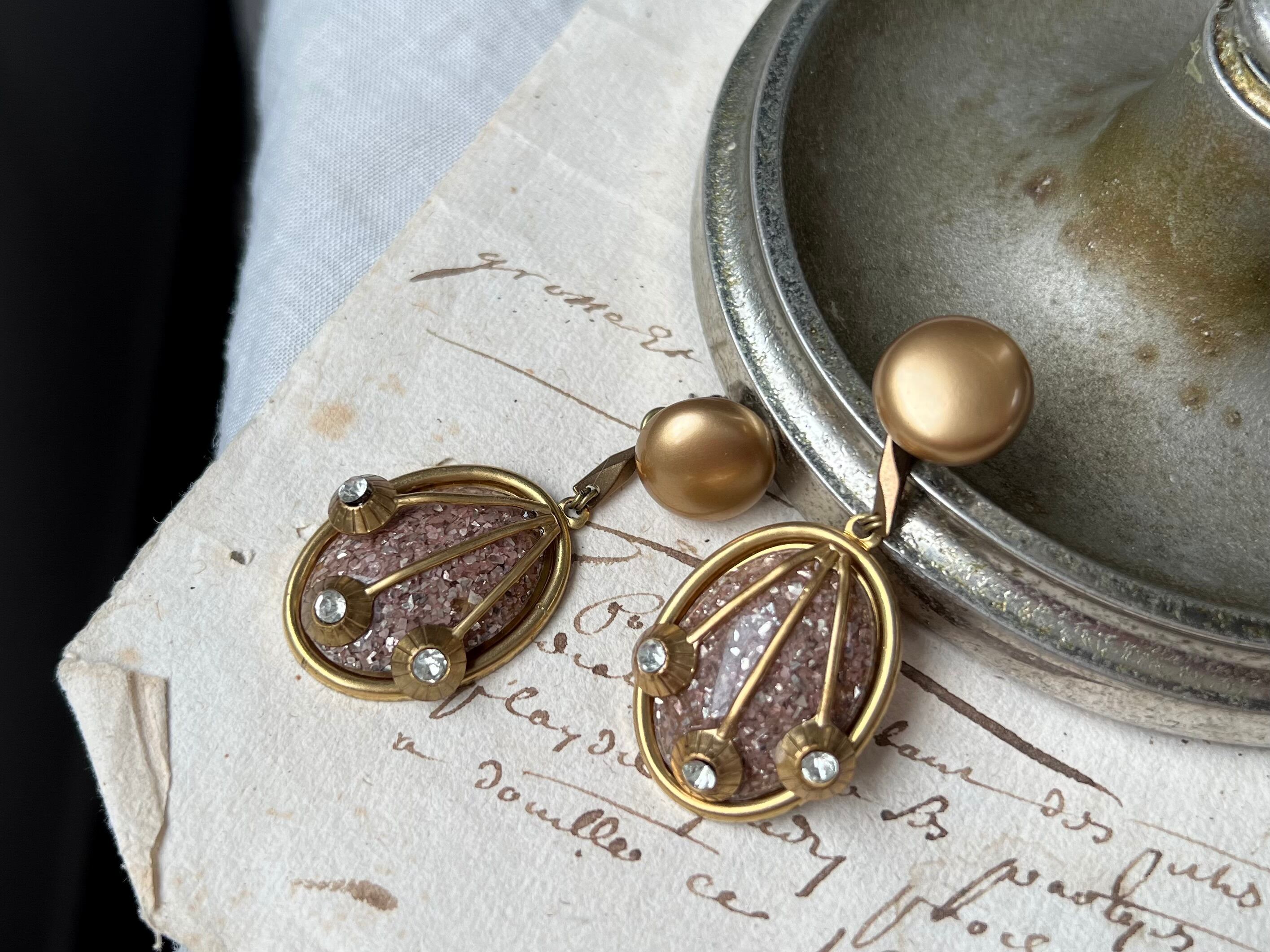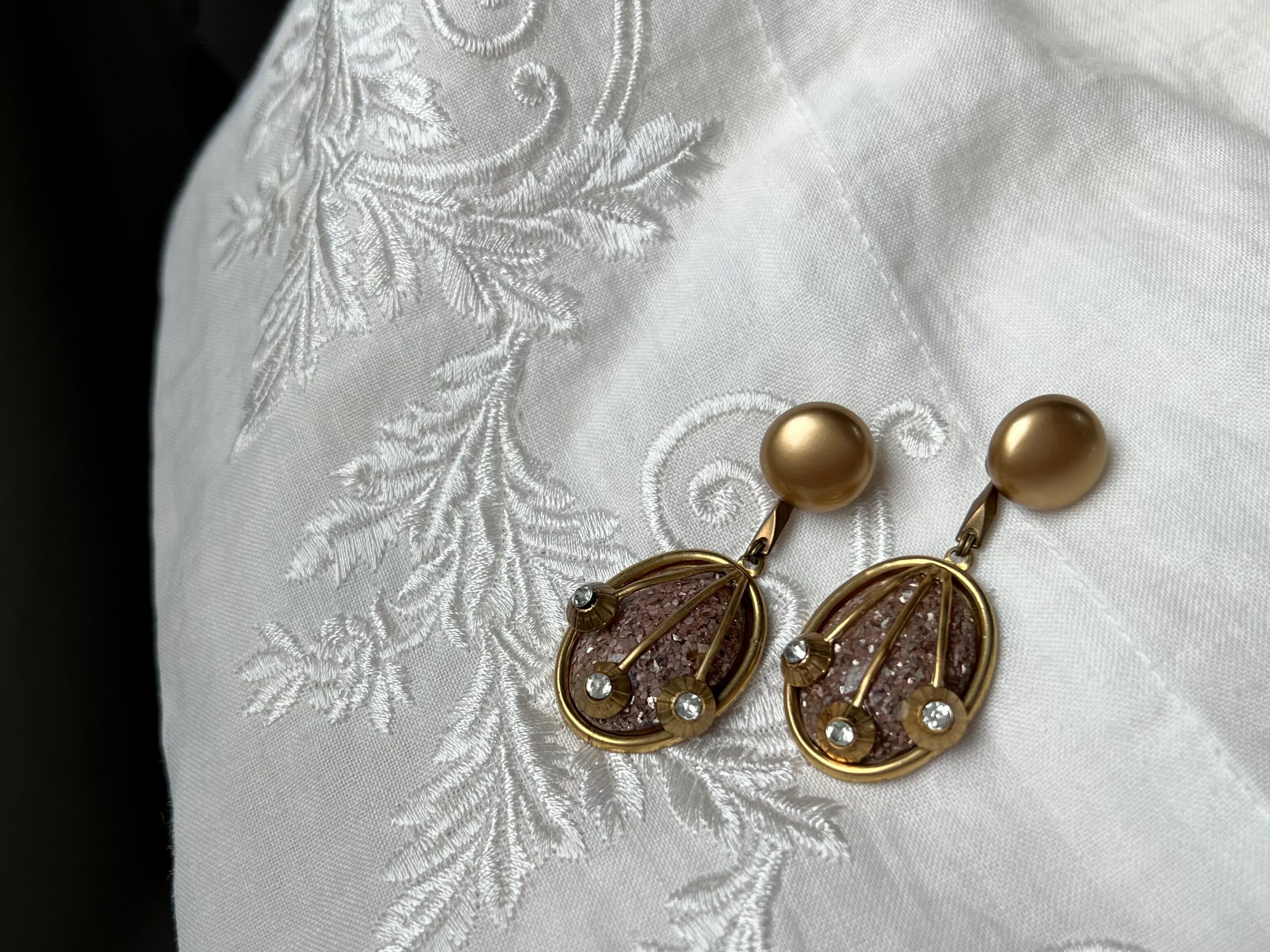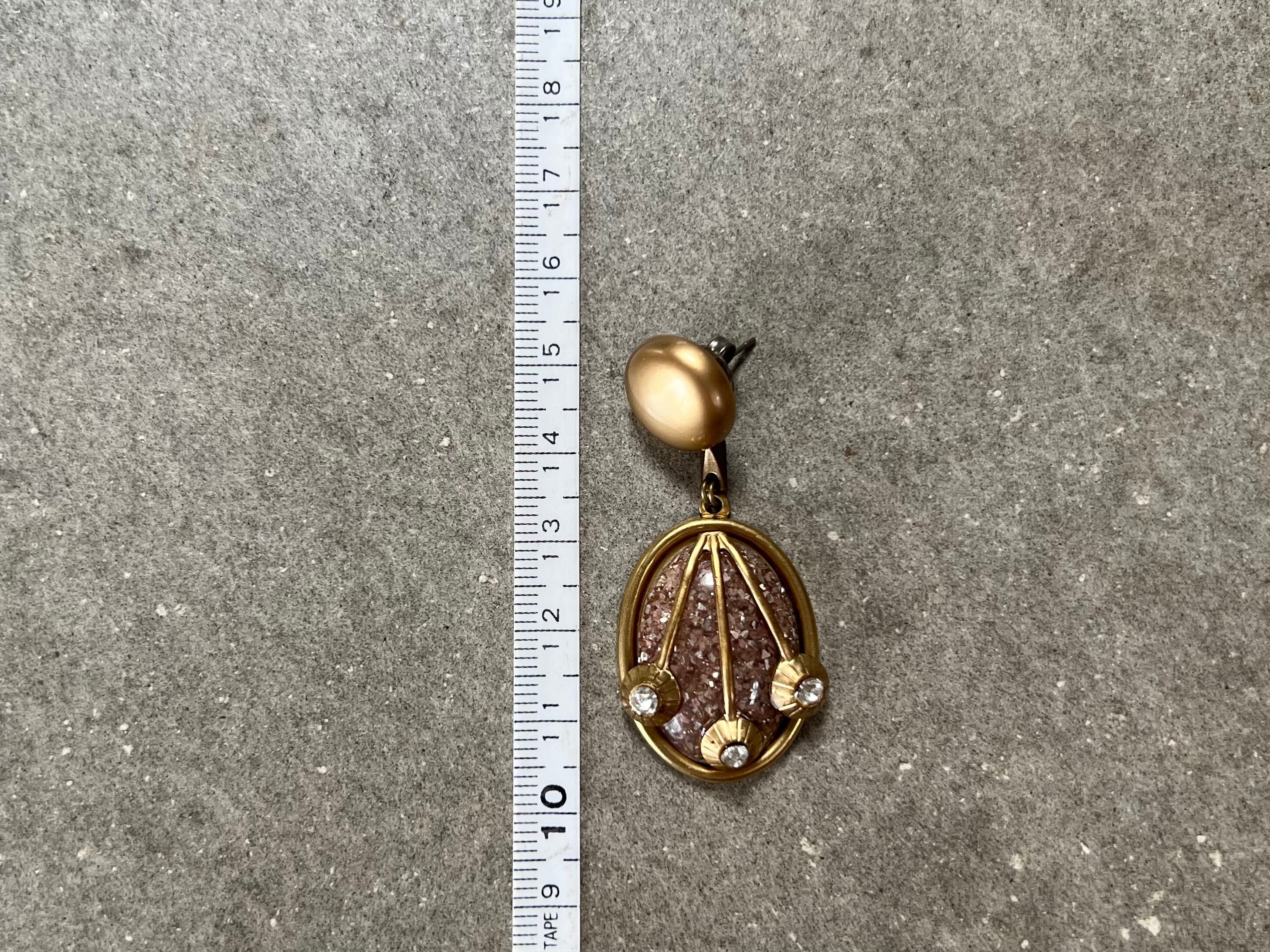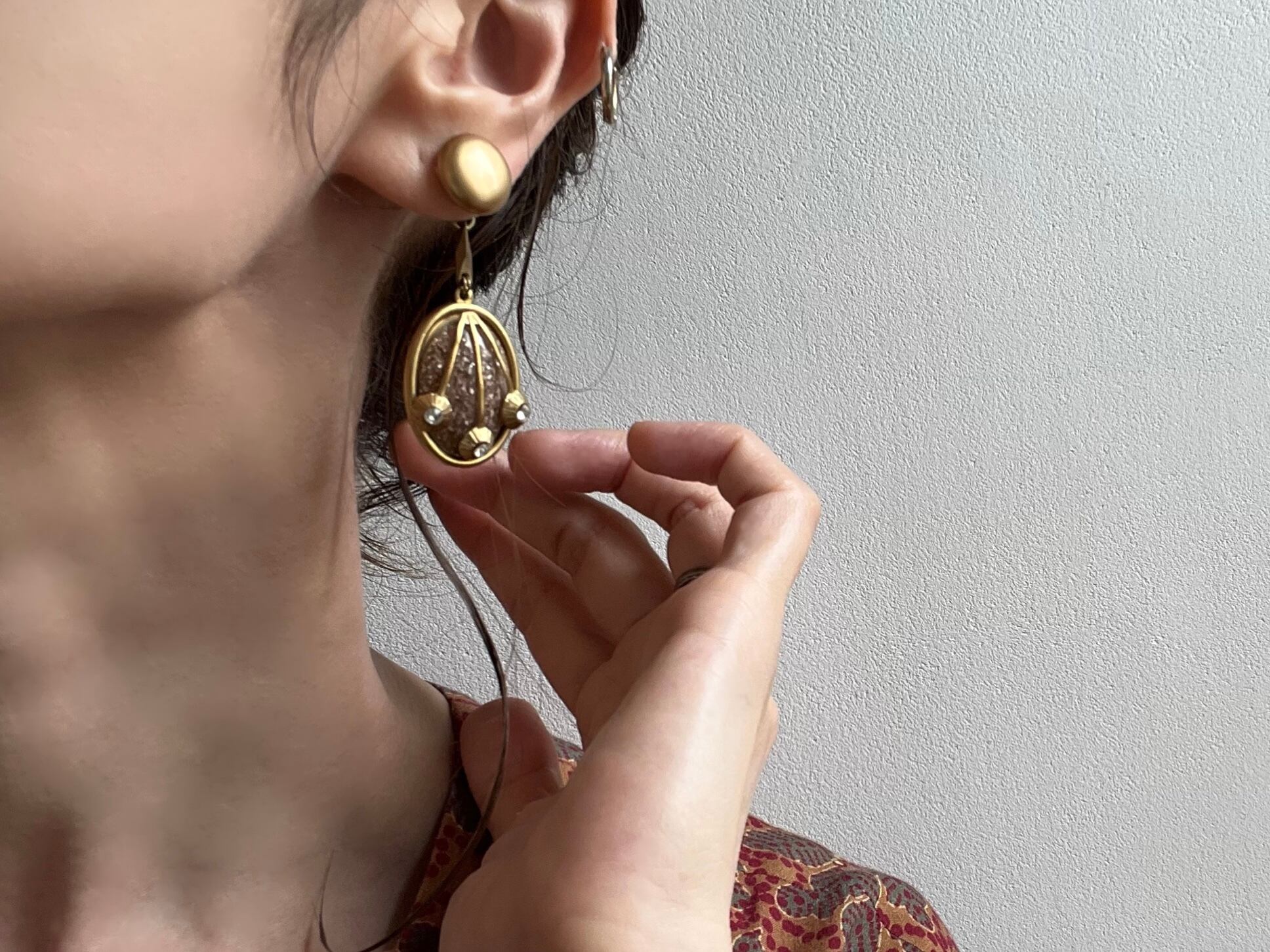 柔らかなピンクベージュのラメ入りパーツが印象的で、マットゴールドのカボションとも相まって、肌馴染みバツグンの一品です。